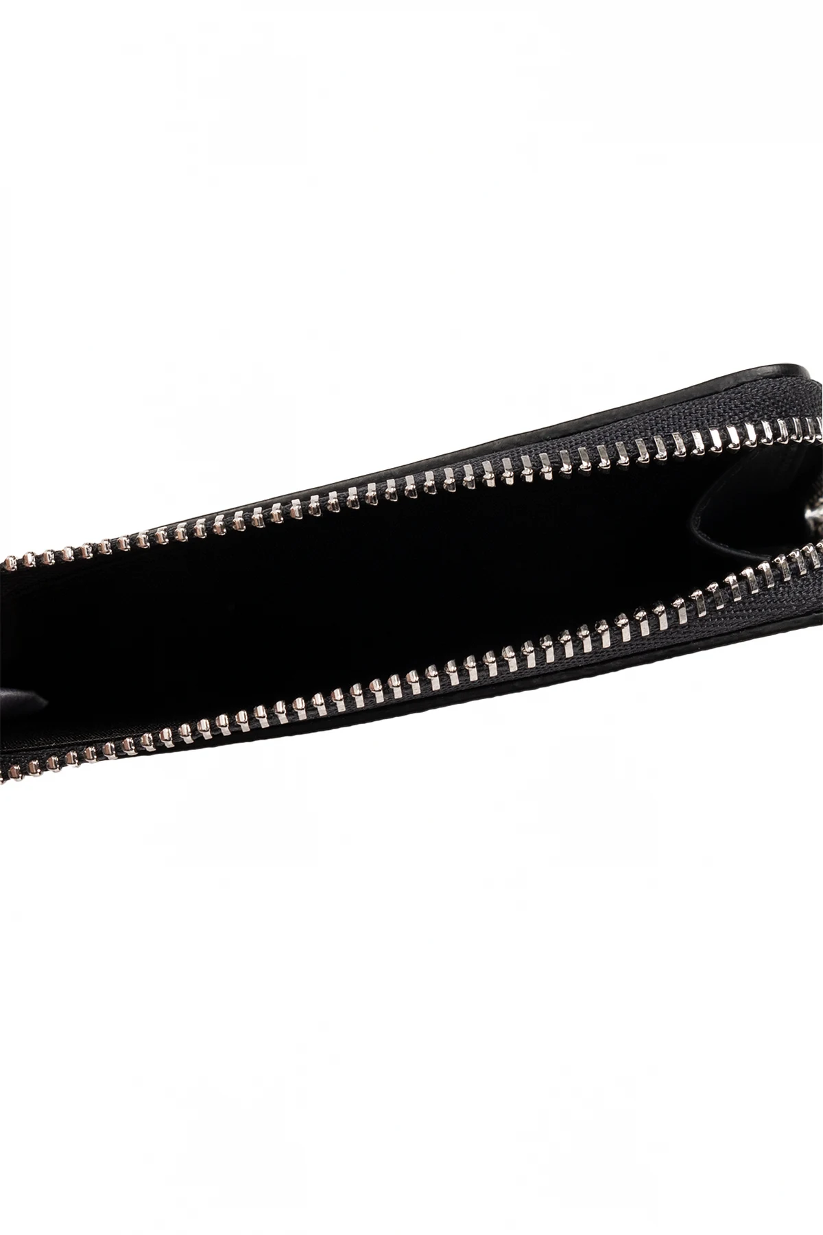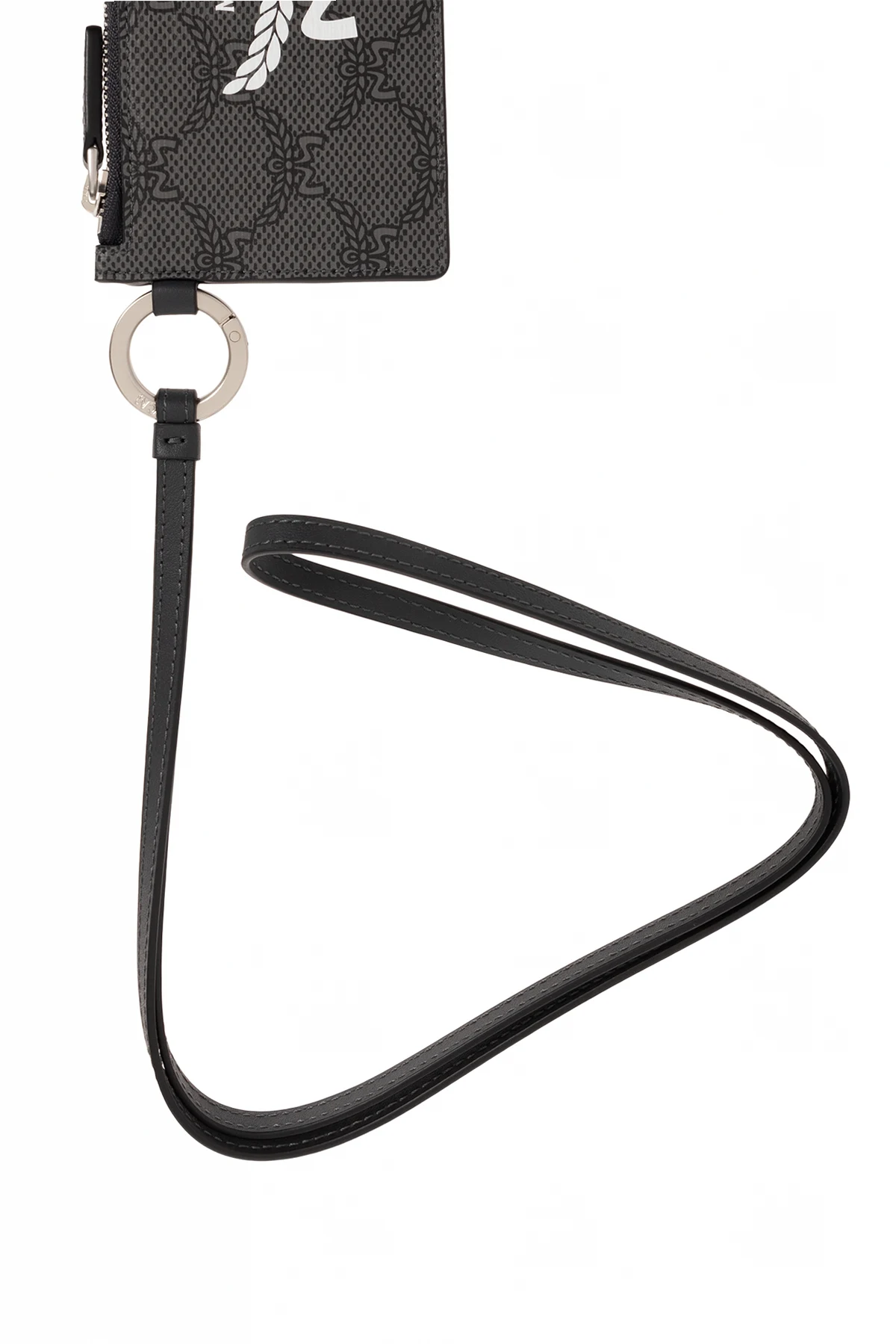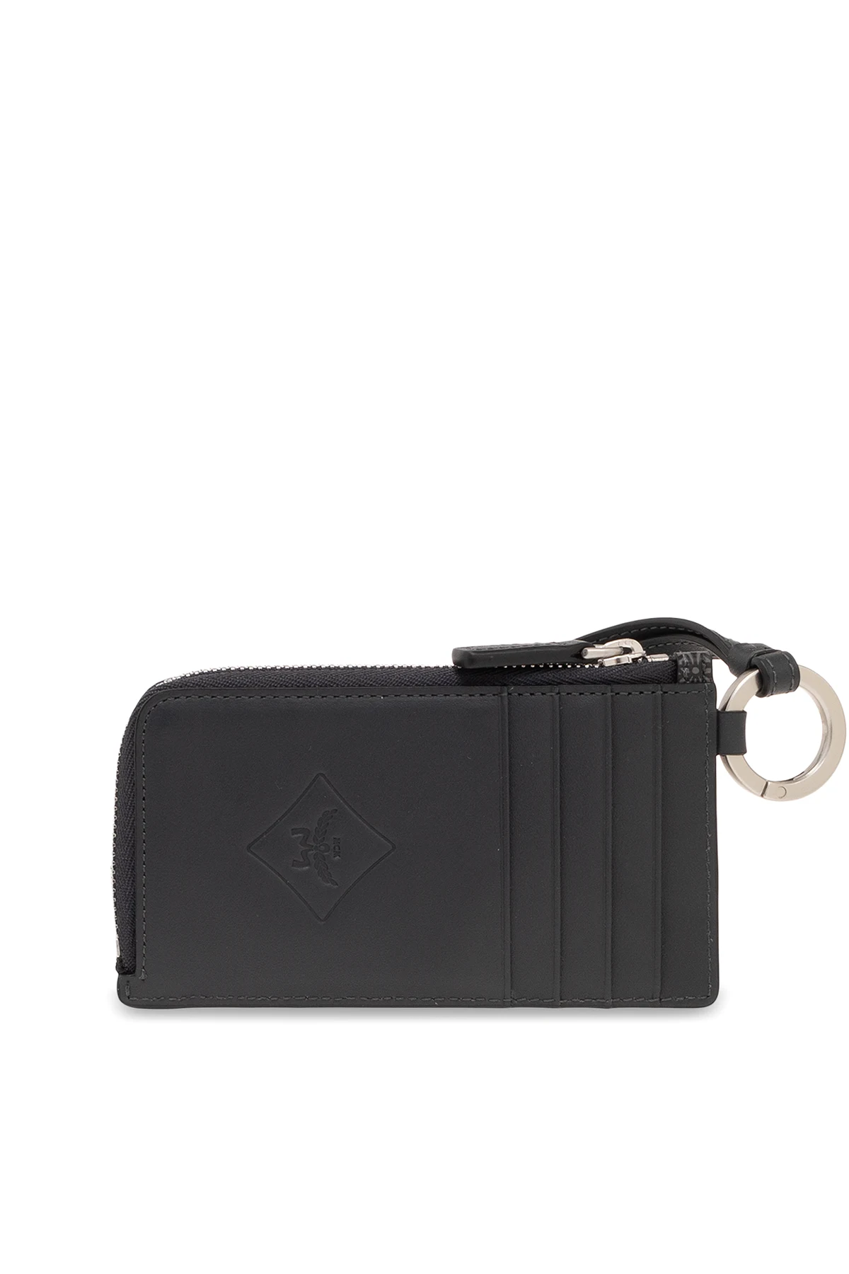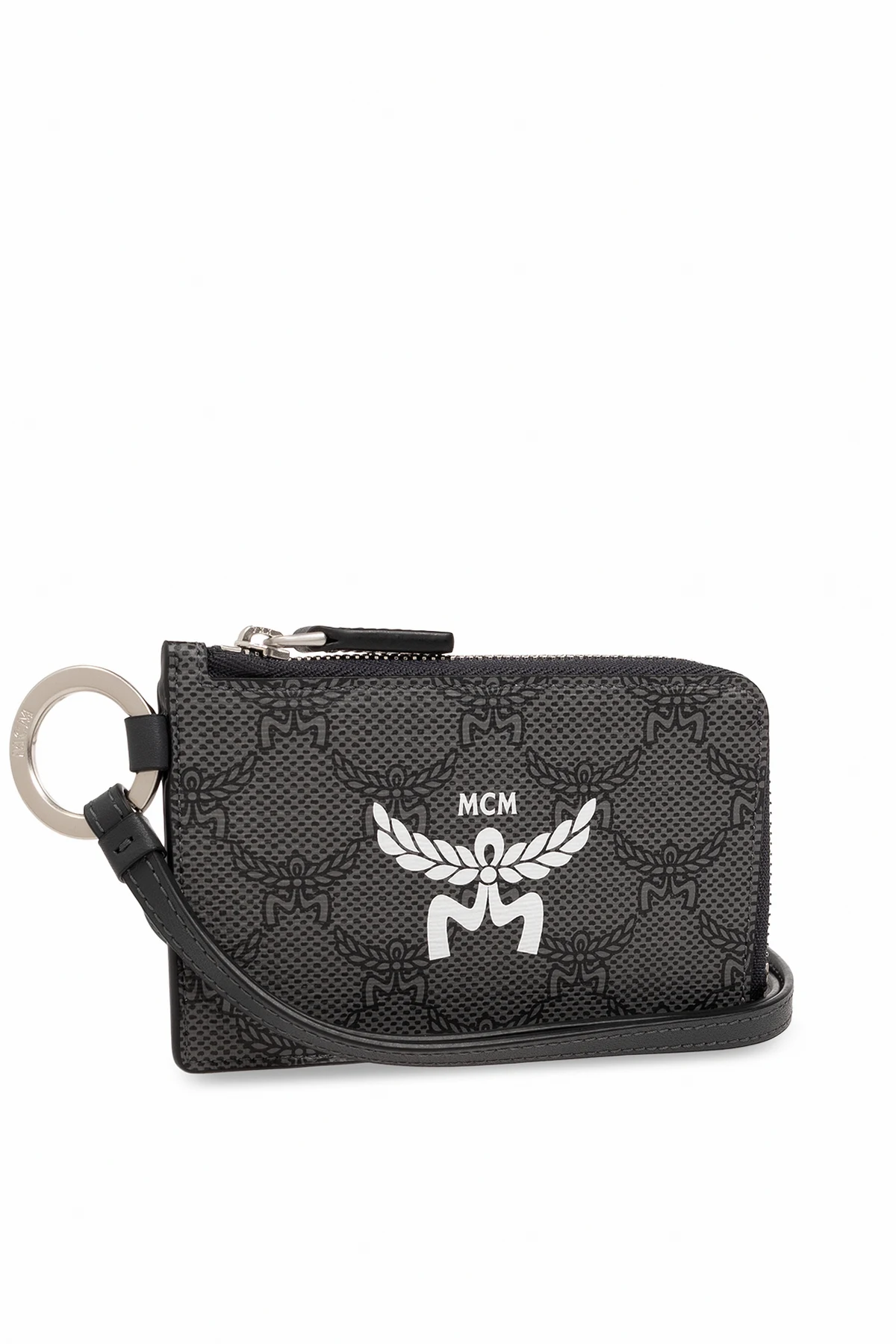 Szare etui na karty, model ‘Himmel’ MCM. Wykonane ze skóry ozdobionej ciemnoszarym monogramem i nadrukowanym białym logo. Z boku odpinany pasek na karabińczyku. Z tyłu cztery miejsca na kartę. Kieszeń zamykana na zamek. Wewnątrz kieszeń i miejsce na kartę.