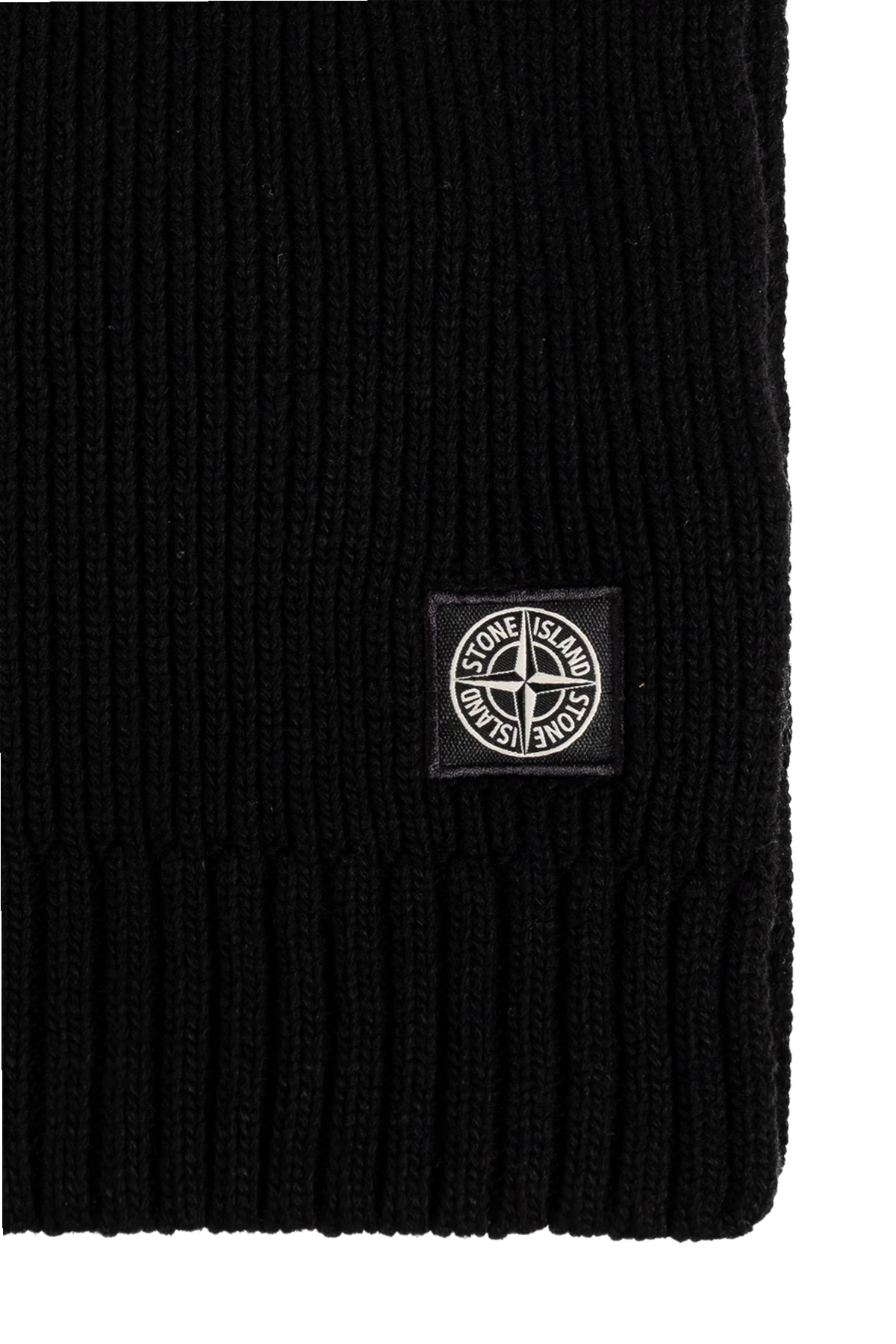Na jednym z końców szalika widnieje charakterystyczna naszywka z logo marki "Stone Island", wykonana w kolorze białym na czarnym tle, co dodaje temu produktowi wyjątkowego prestiżu. Dolna krawędź szalika zakończona jest szerokim, elastycznym ściągaczem, co dodatkowo podkreśla jego funkcjonalność.