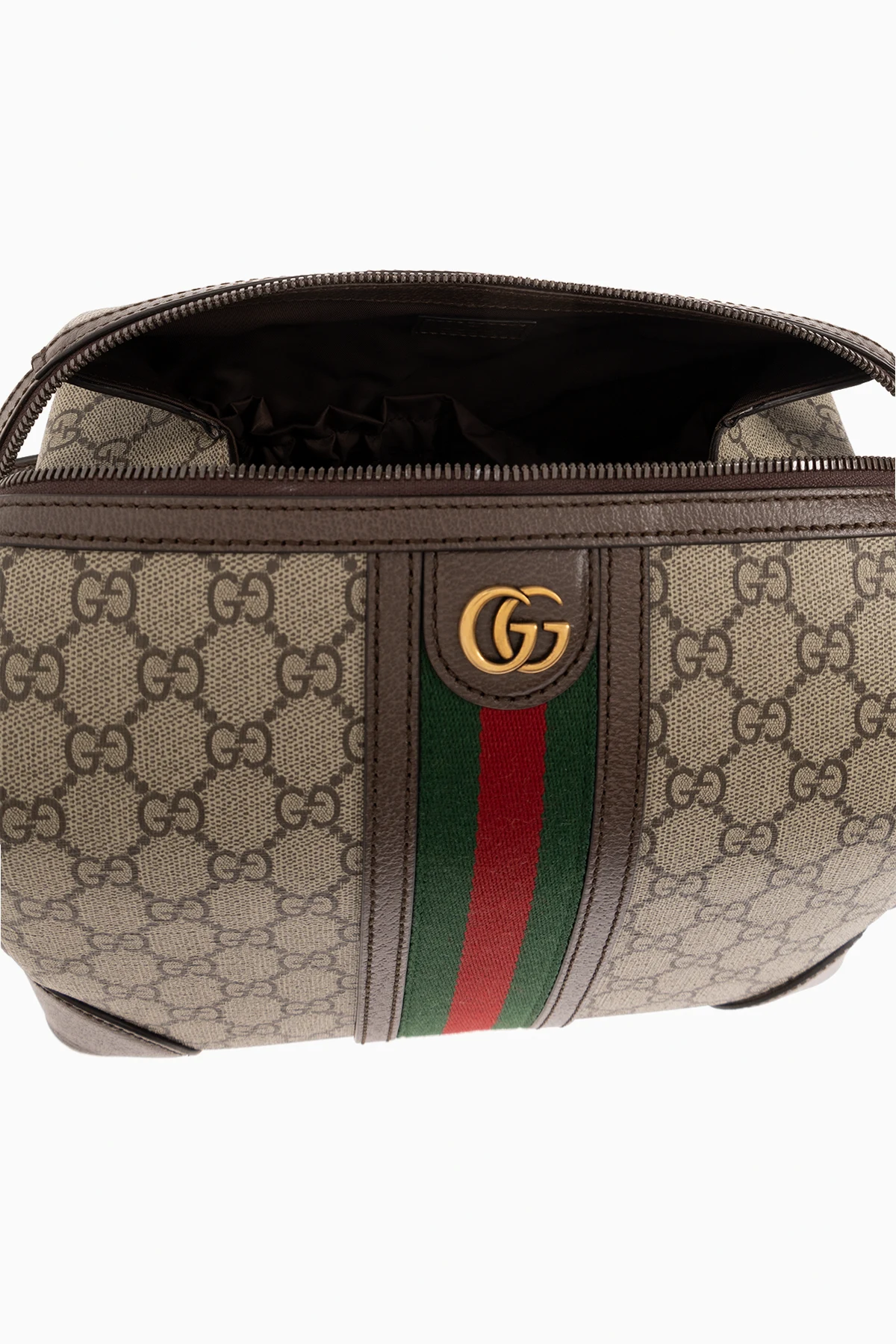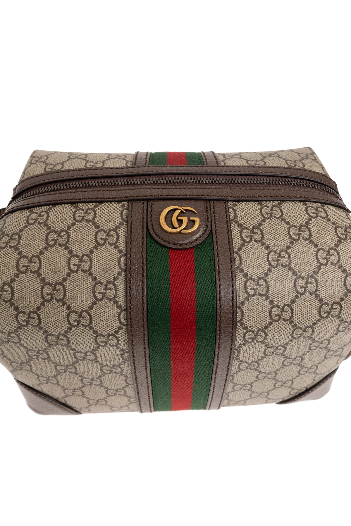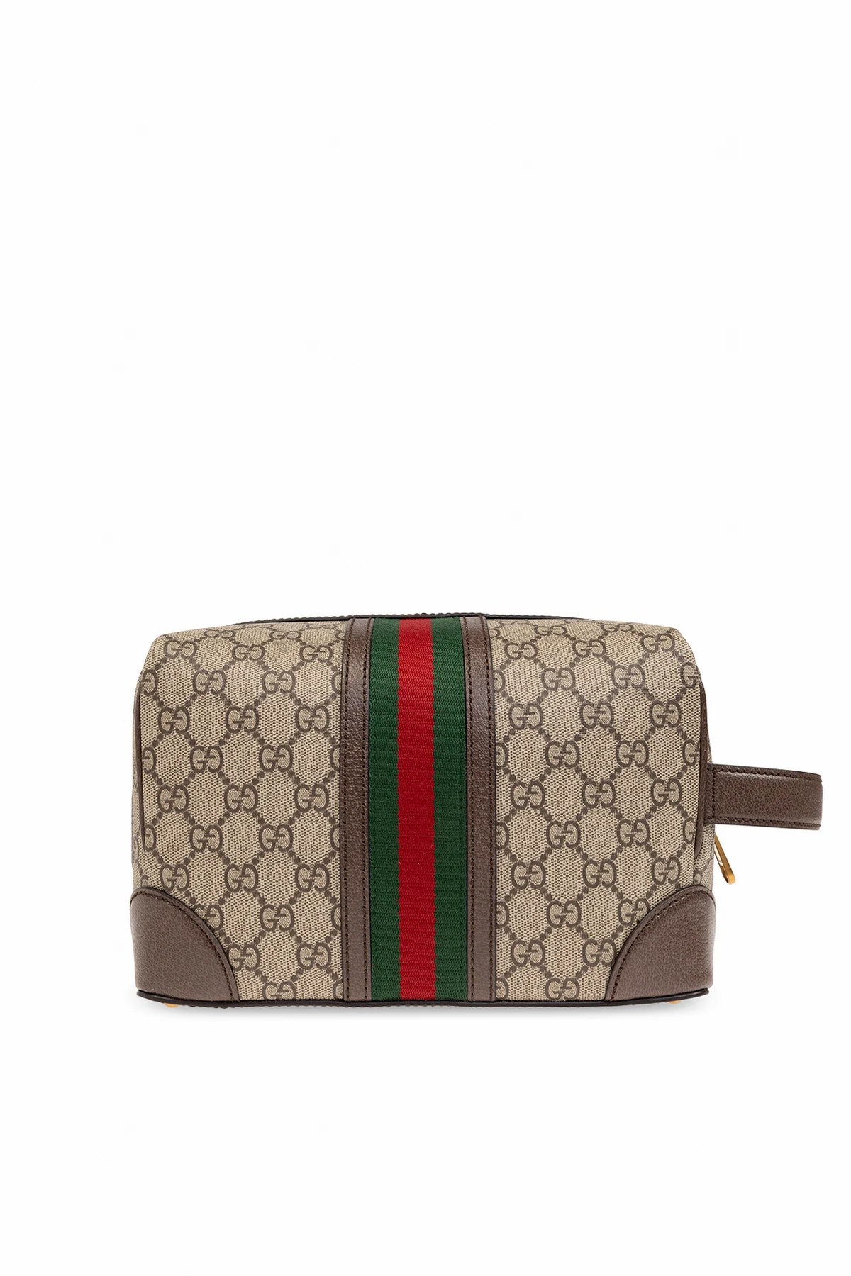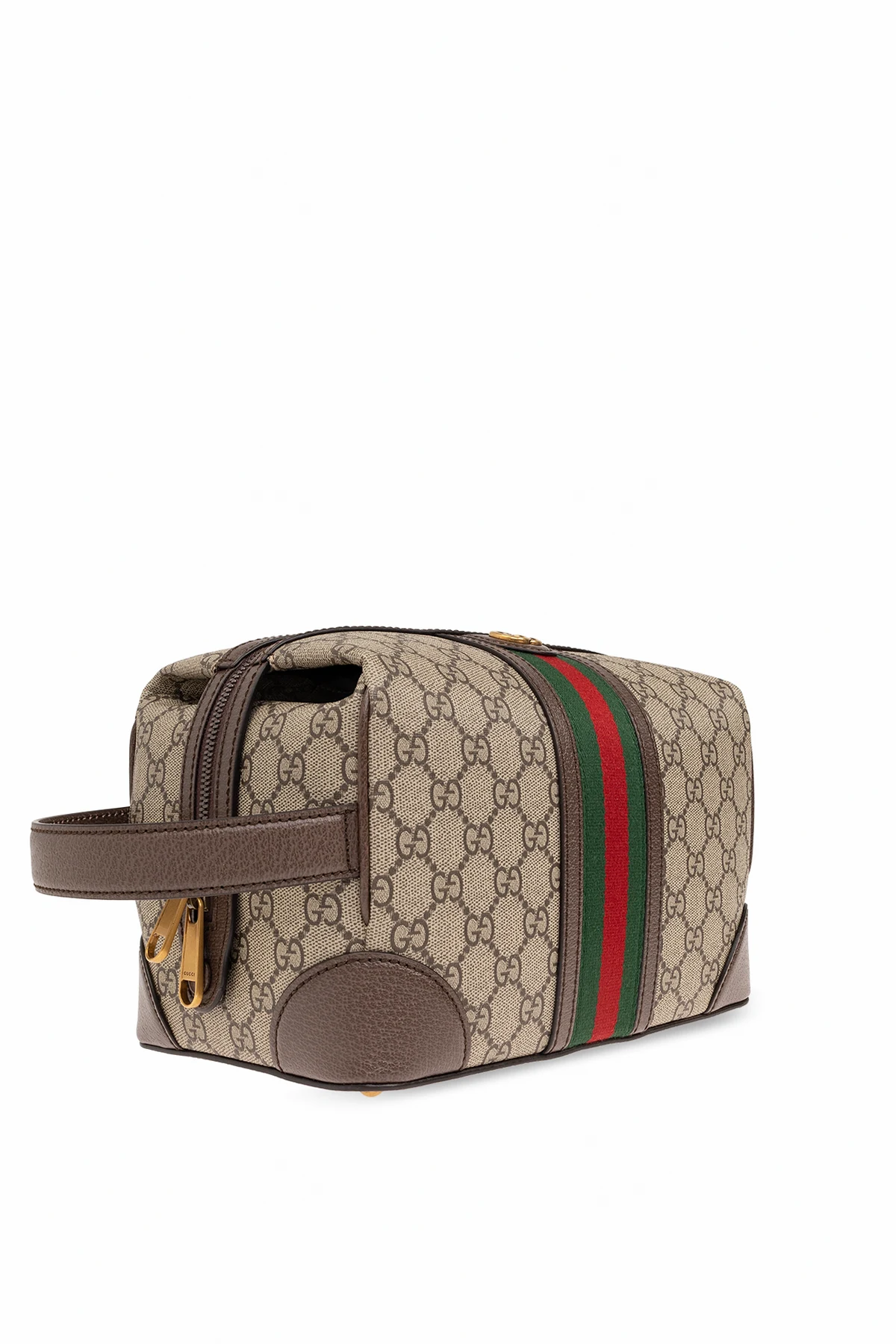Beżowo-brązowa kosmetyczka Gucci. Wykonana z płótna ‘GG Supreme’ i wykończona skórą cielęcą. Zamykana na dwubiegunowy zamek i zatrzaski. Ozdobiona pasem z motywem ‘Web’ w kolorze zielono-czerwono-zielonym i metalową aplikacją w kształcie logo ‘Double G’. Z boku uchwyt. Wewnątrz komora z czterema wsuwanymi kieszeniami. Metalowe wykończenie w kolorze postarzanego złota.