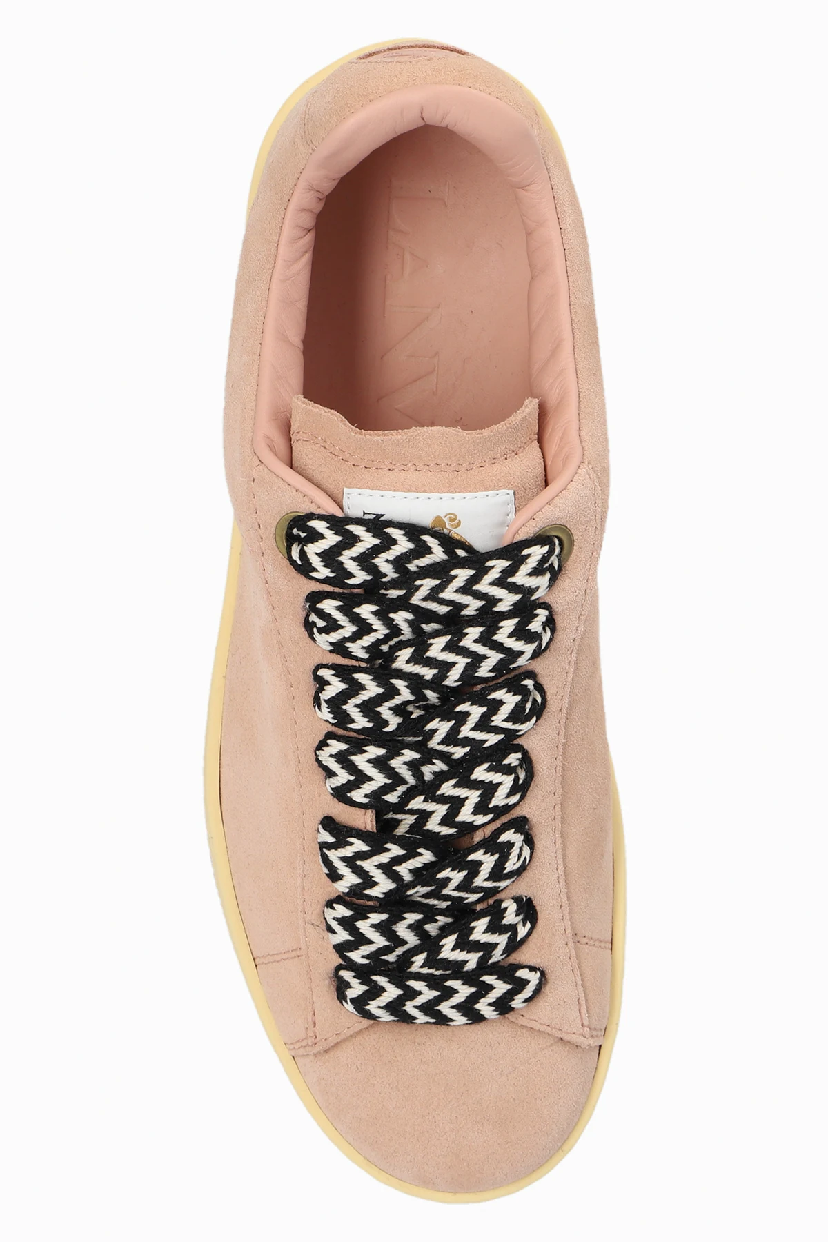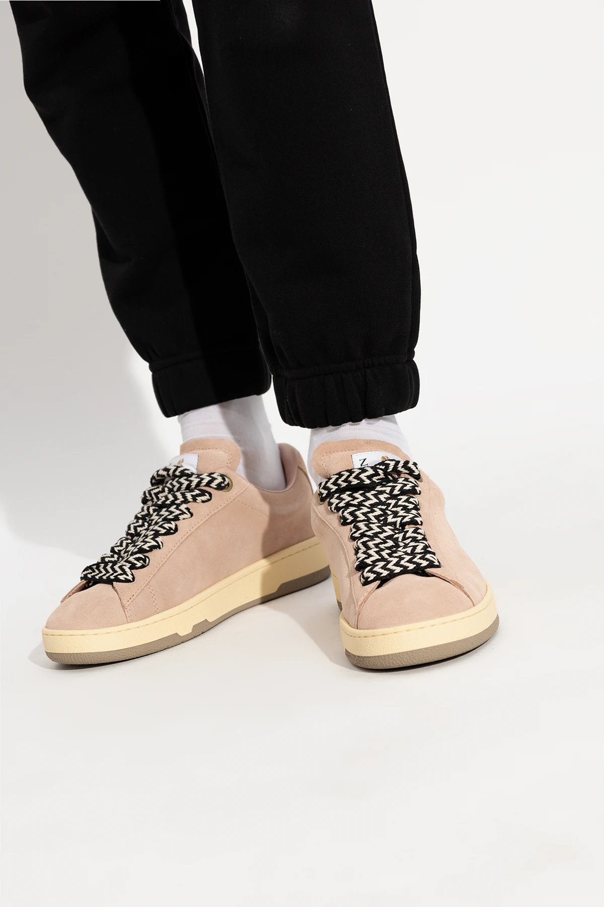 Różowe, sznurowane buty sportowe, model 'Curb Lite' Lanvin. Wykonane z zamszu. Z przodu naszywka z logo. Z boku nadrukowane logo w kolorze złotym. Dekoracyjne, czarno-białe sznurówki. Brązowa, gumowa podeszwa.