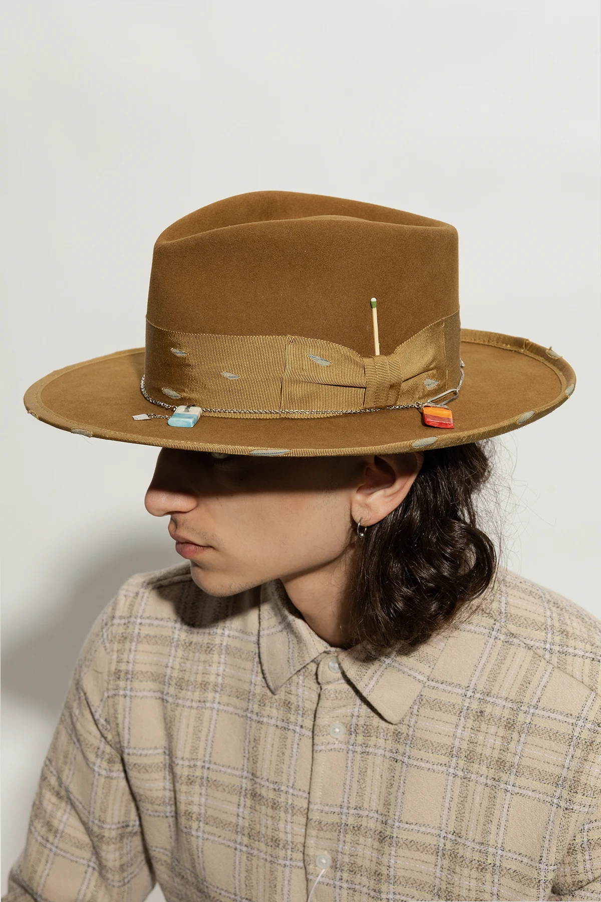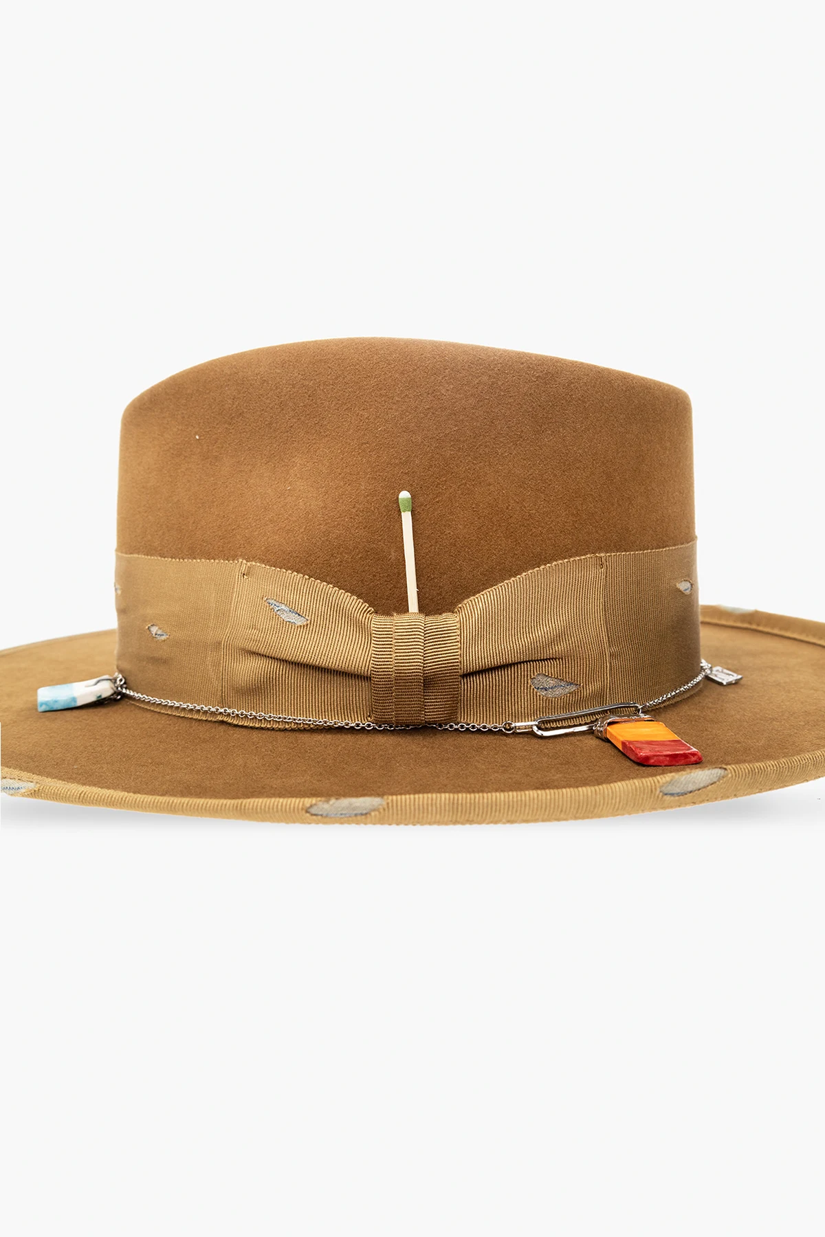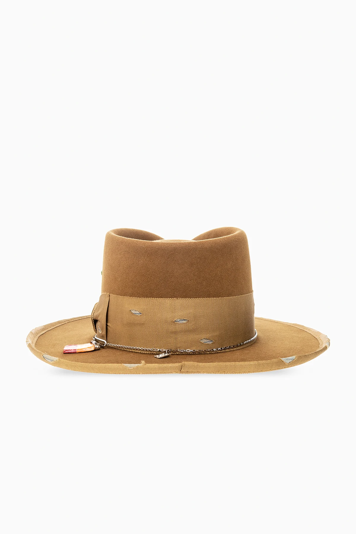 Brązowobeżowy kapelusz typu ‘fedora’, model ‘677’ Nick Fouquet. Wykonany z filcu. Ozdobiony pasem rypsowym z efektem ‘vintage’ oraz łańcuchem z zawieszkami i zapałką.