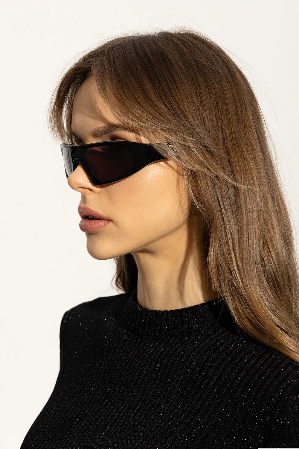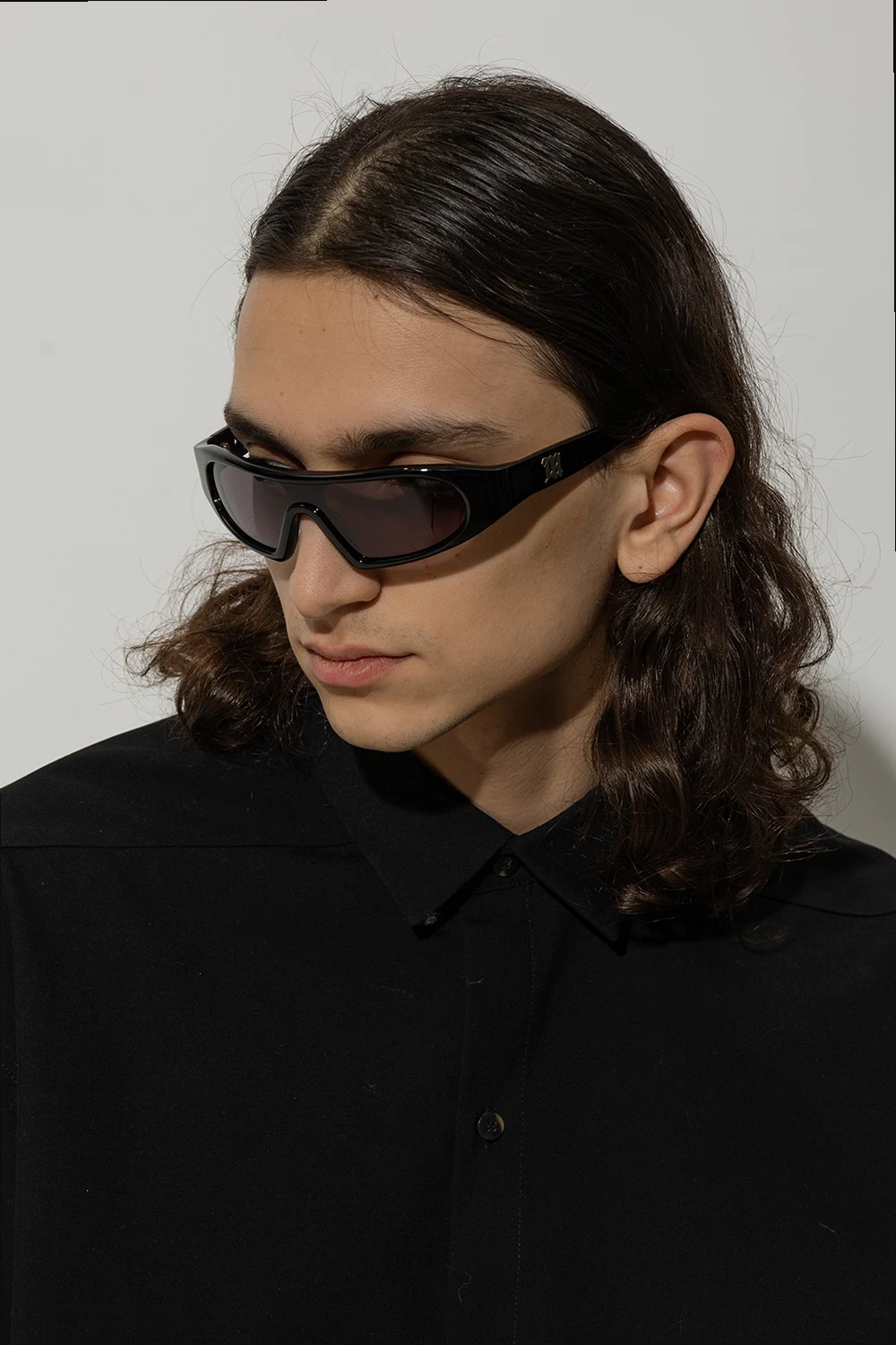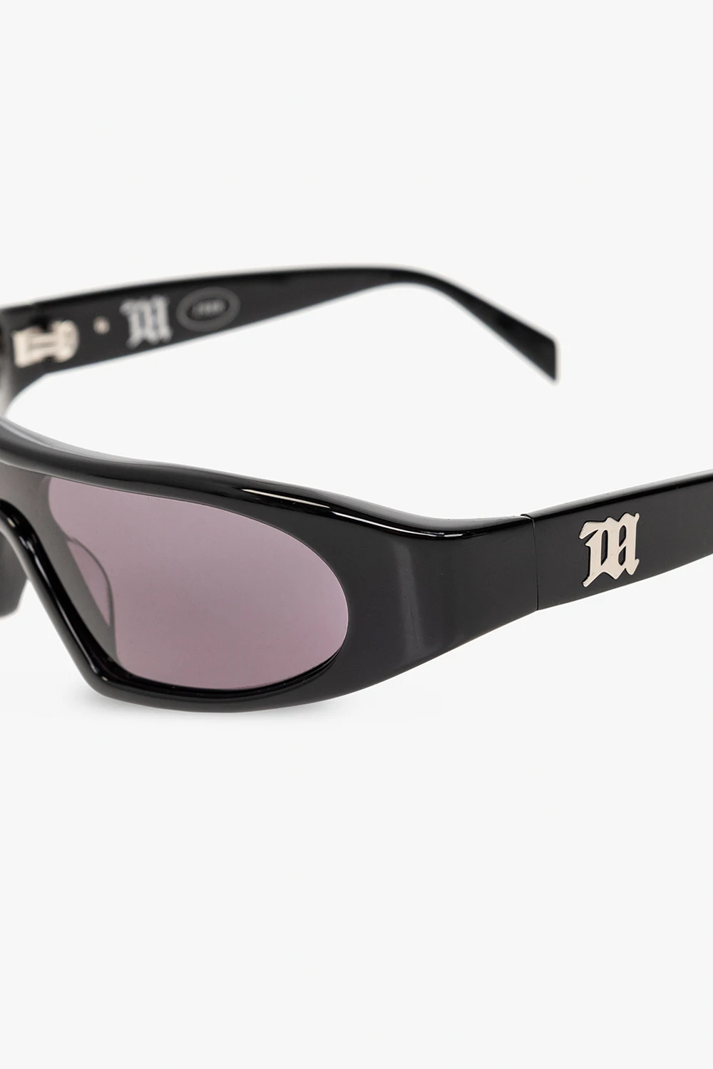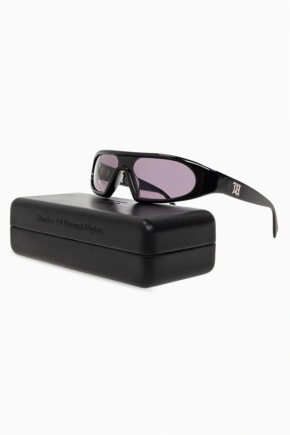 Czarne okulary przeciwsłoneczne, model ‘1988’ MISBHV. Inspirowane stylem lat 80. Czarne szkła ze 100% ochroną UV. Zauszniki z logo. Dołączone czarne etui z wegańskiej skóry.
