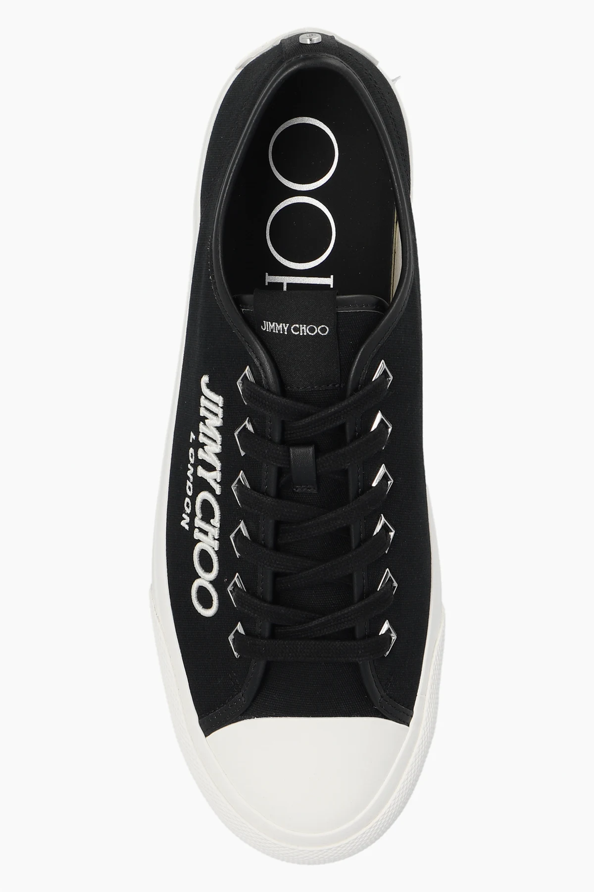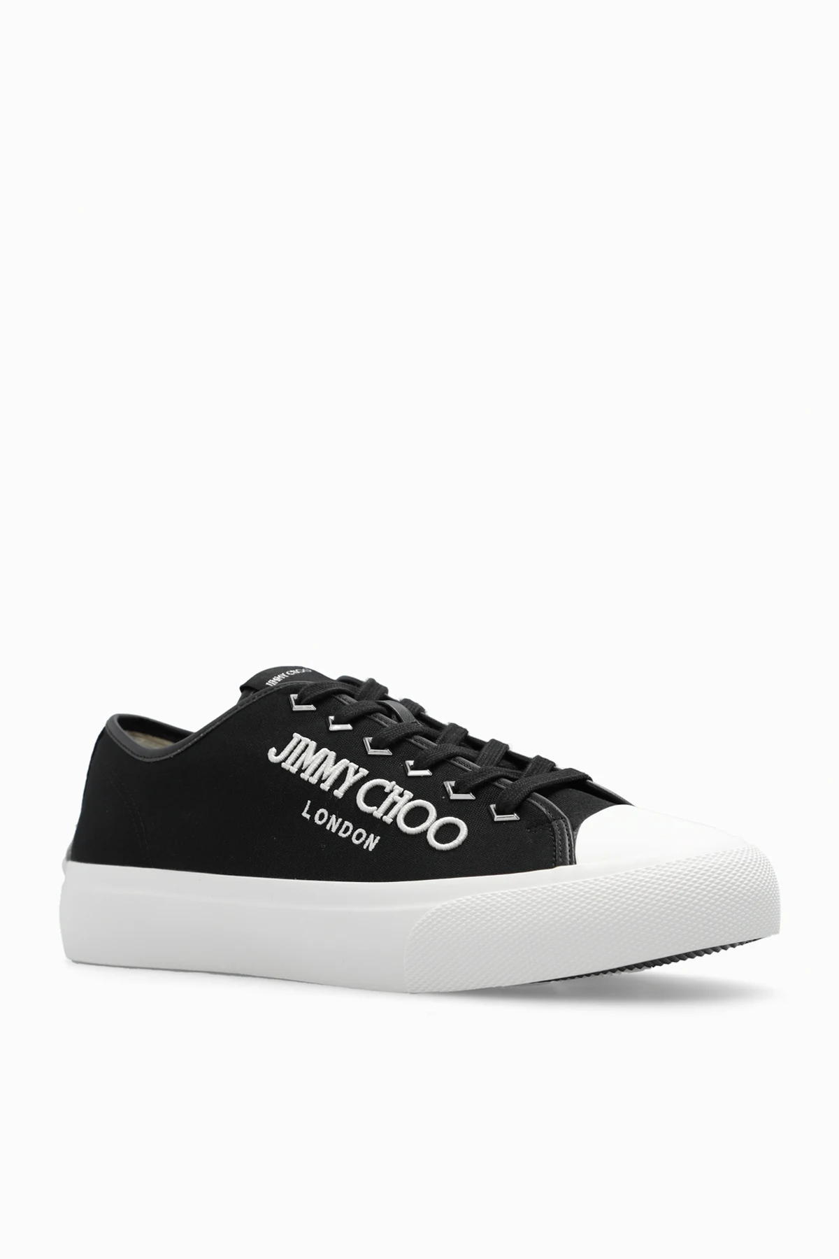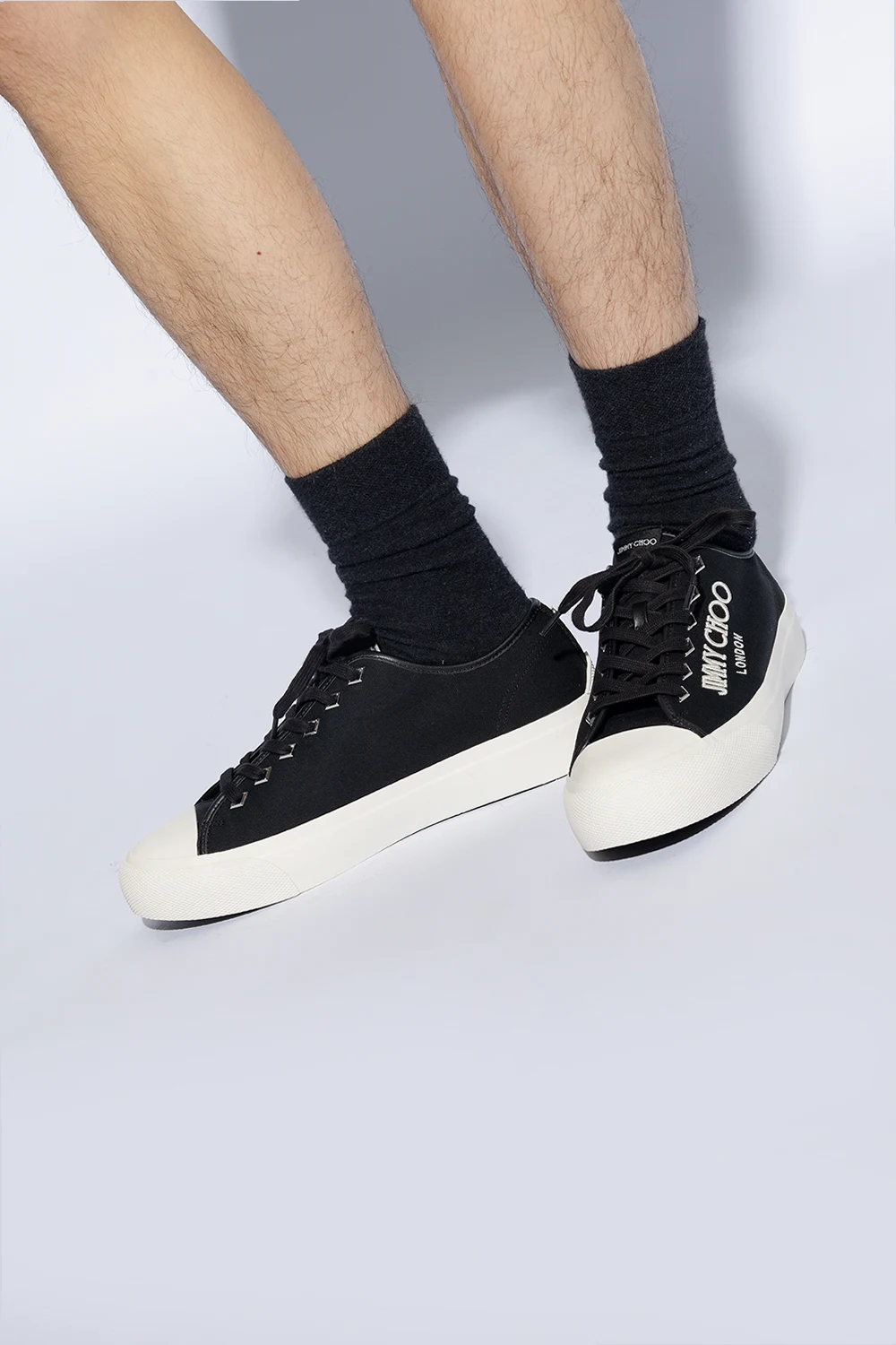 Czarno-kremowe, sznurowane buty sportowe, model ‘Palma’ Jimmy Choo. Wykonane z materiału. Wykończone skórą. Ozdobione wyszytym logo i naszywką z logo. Metalowe detale w kolorze srebrnym. Biała, gumowa podeszwa.
