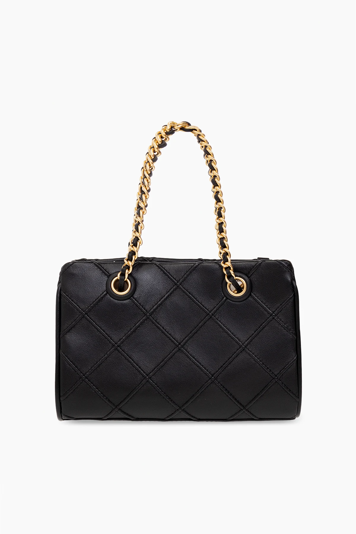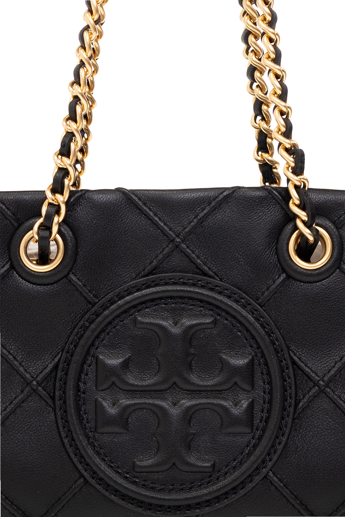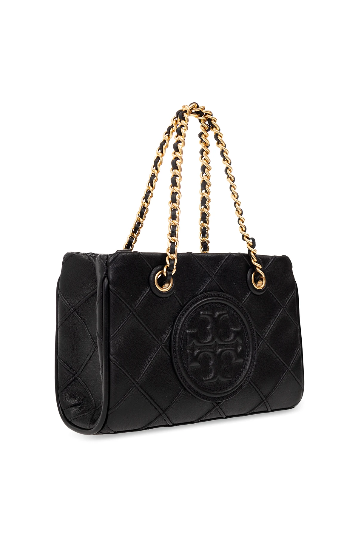 Czarna torba do ręki z przeszyciami, model ‘Fleming Mini’ Tory Burch. Wykonana ze skóry jagnięcej. Magnetyczne zamknięcie. Z przodu naszywka z wypukłym logo. Dwie odpinane rączki przeplatane łańcuchem oraz regulowany pas na ramię. Wewnątrz komora z miejscem na kartę. Metalowe wykończenie w kolorze złotym.