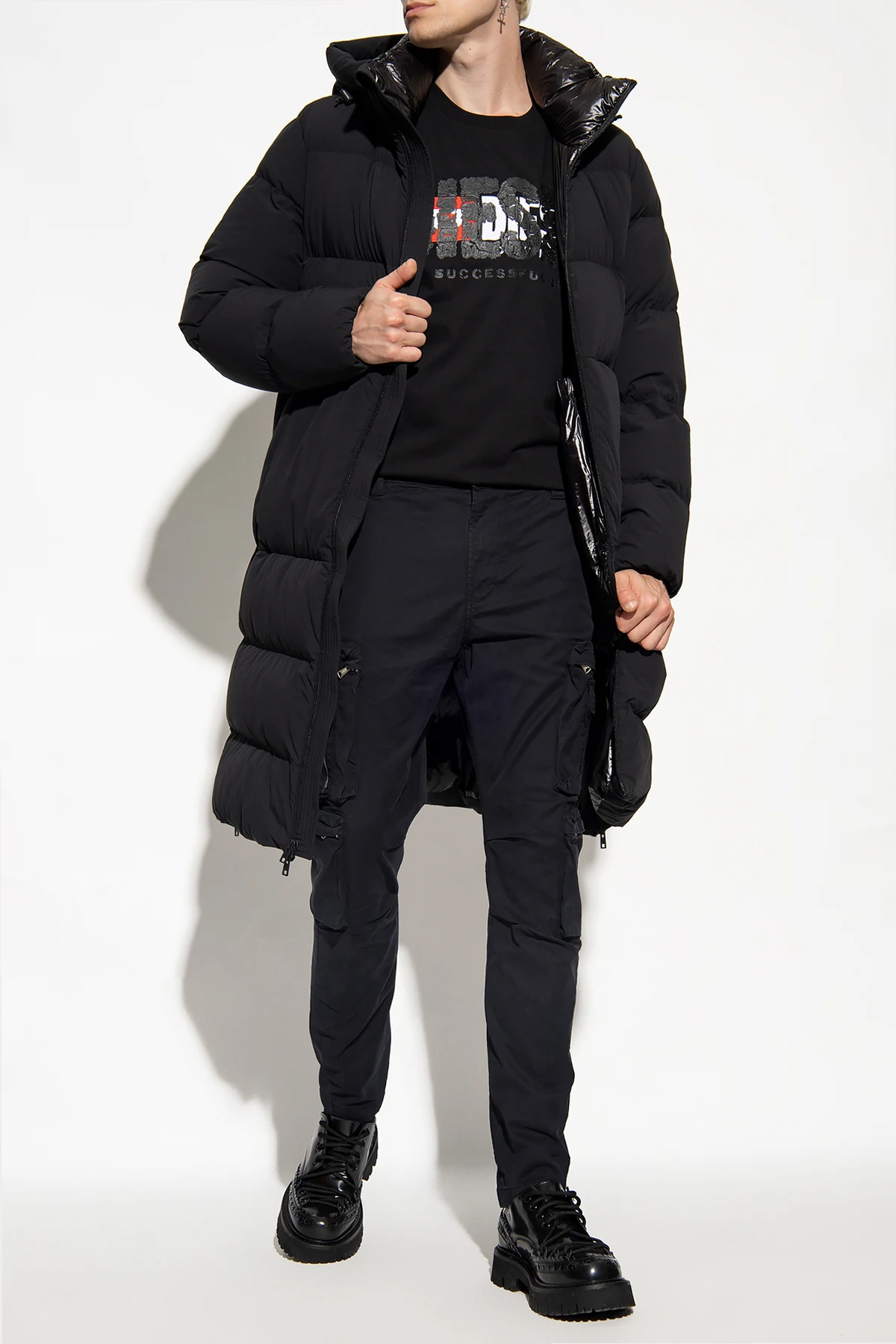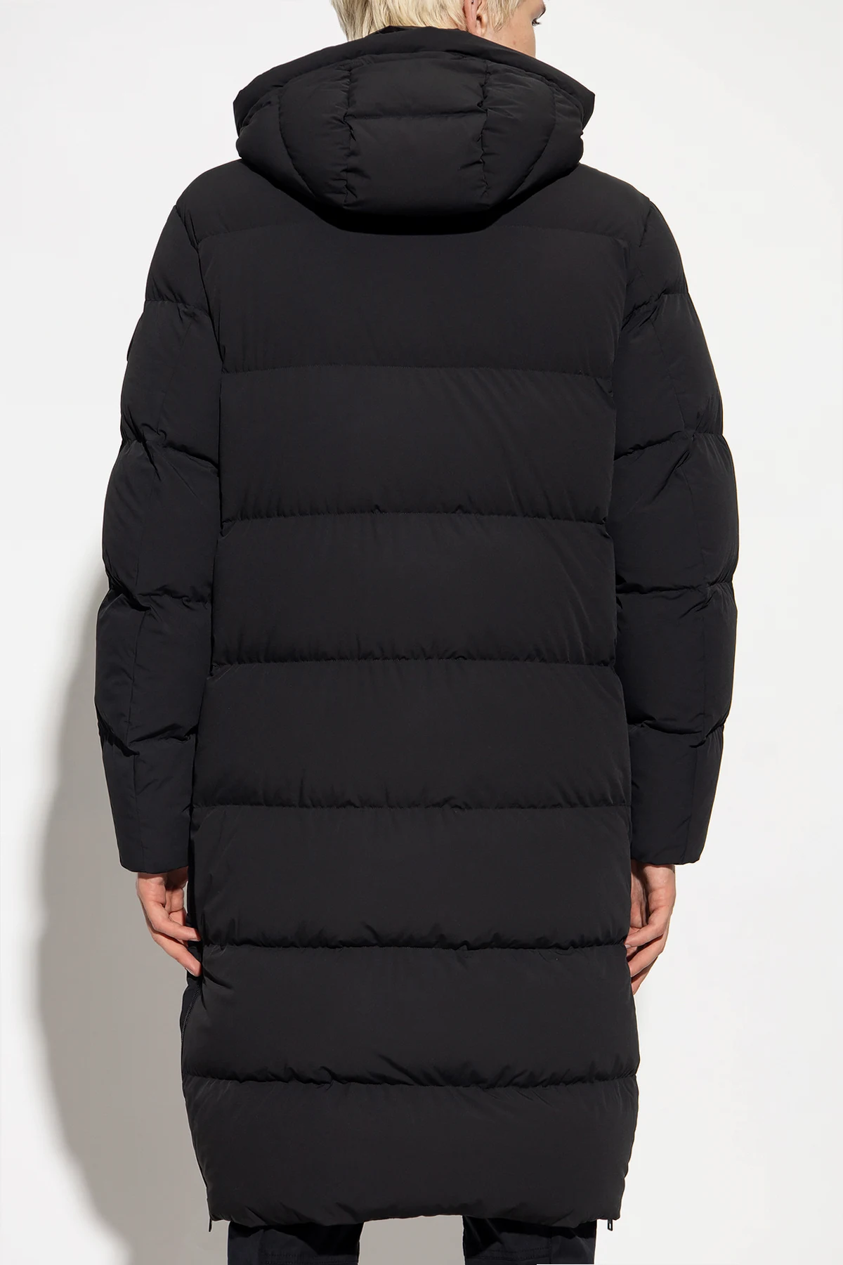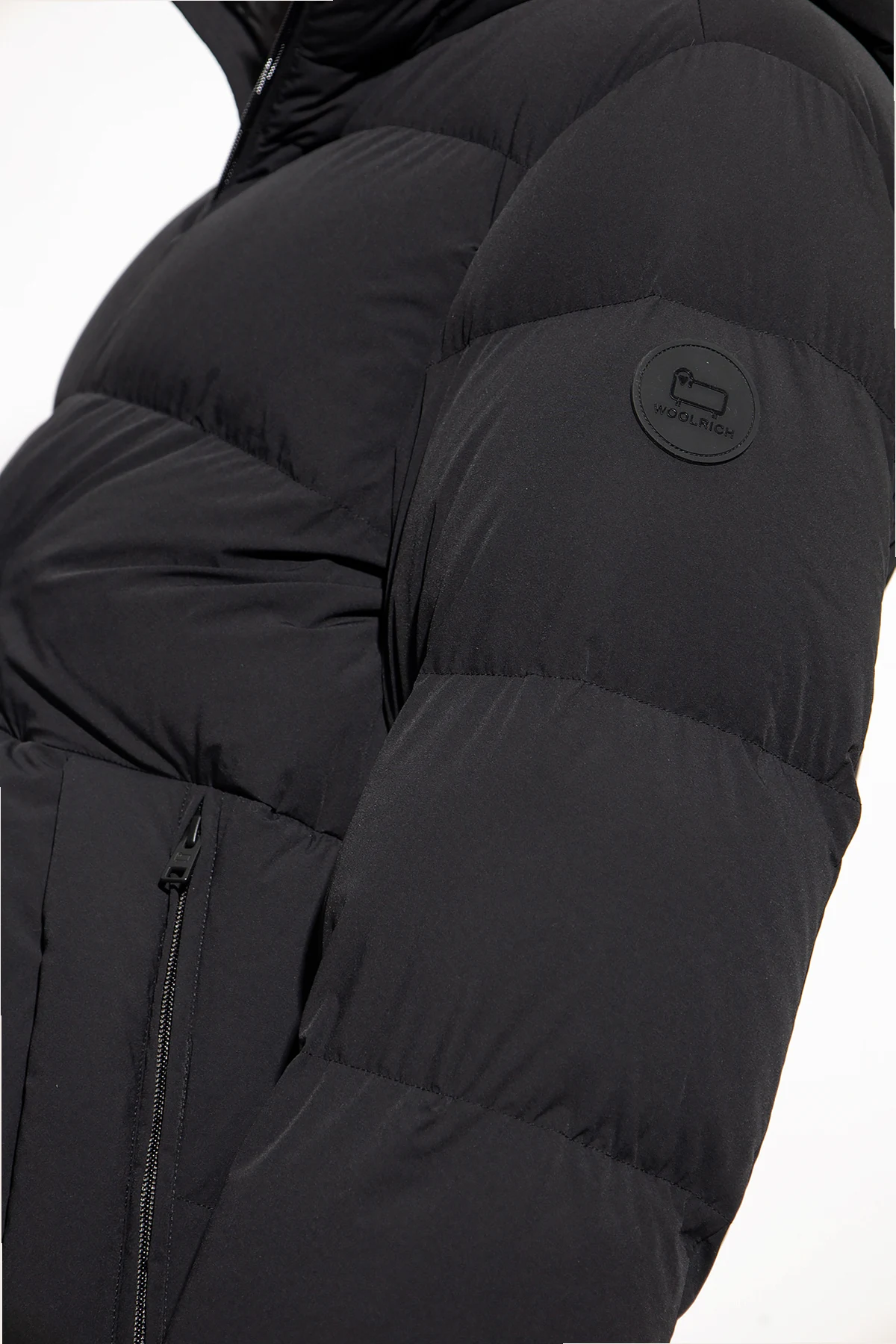 Długa, czarna kurtka, model ‘Sierra Supreme’ Woolrich. Wykonana z elastycznego nylonu. Wodoodporna i wiatroszczelna. Zapinana na dwubiegunowy zamek. Kaptur i dół kurtki ściągane trokami. Ozdobiona gumową naszywką z logo. Z przodu dwie kieszenie zapinane na zamek i dwie kieszenie zapinane na zatrzask. Długie rękawy. Warstwa wewnętrzna w kolorze czarnym. Puchowe wypełnienie.