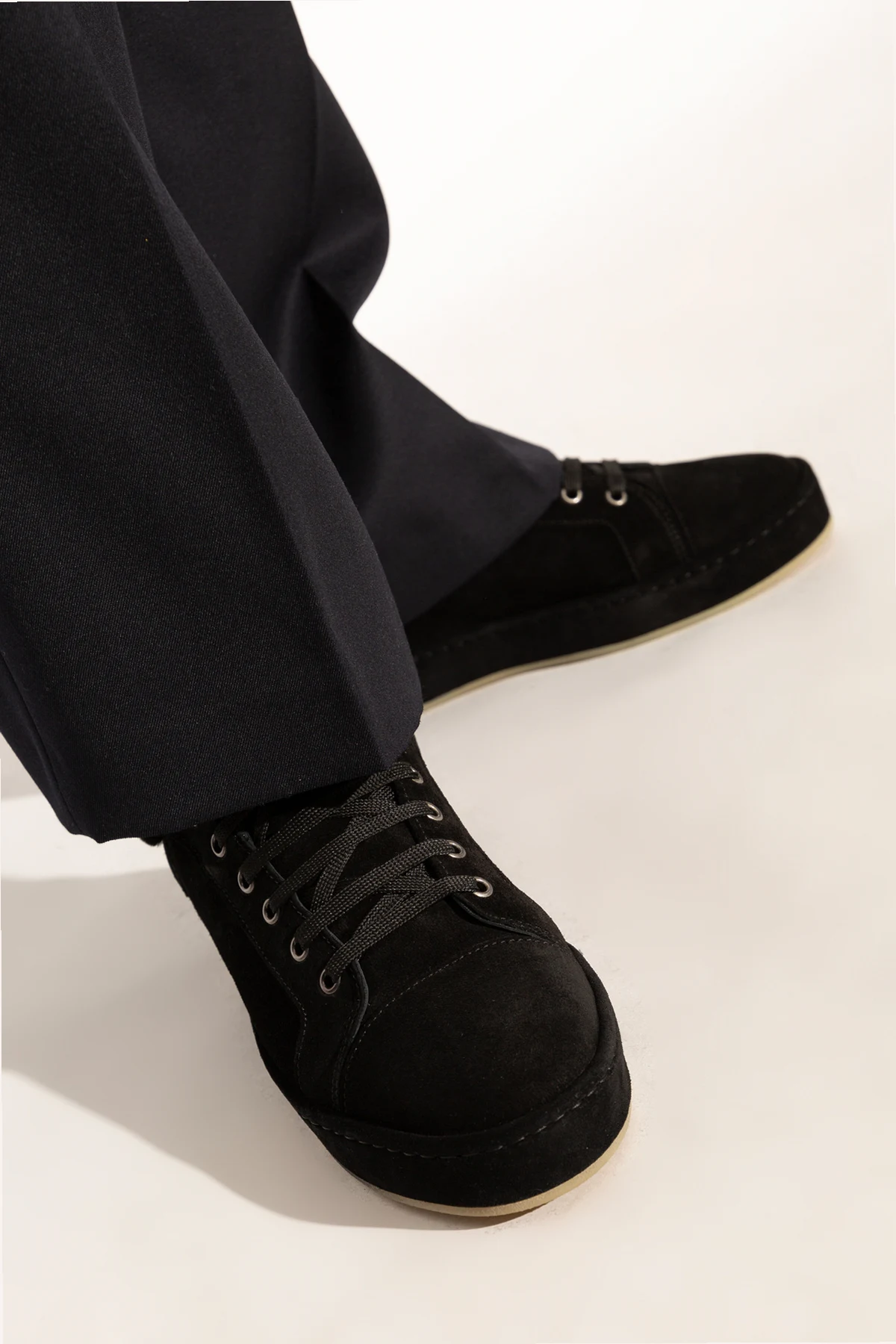 Wykonane z wysokiej jakości zamszu, charakteryzują się gładką, czarną powierzchnią bez dodatkowych wzorów, co podkreśla ich elegancki wygląd. Gumowa podeszwa w kolorze jasnego beżu tworzy wyrafinowany kontrast z resztą buta, a czarne, płaskie sznurowadła przewleczone przez metalowe oczka dodają im subtelnego charakteru.