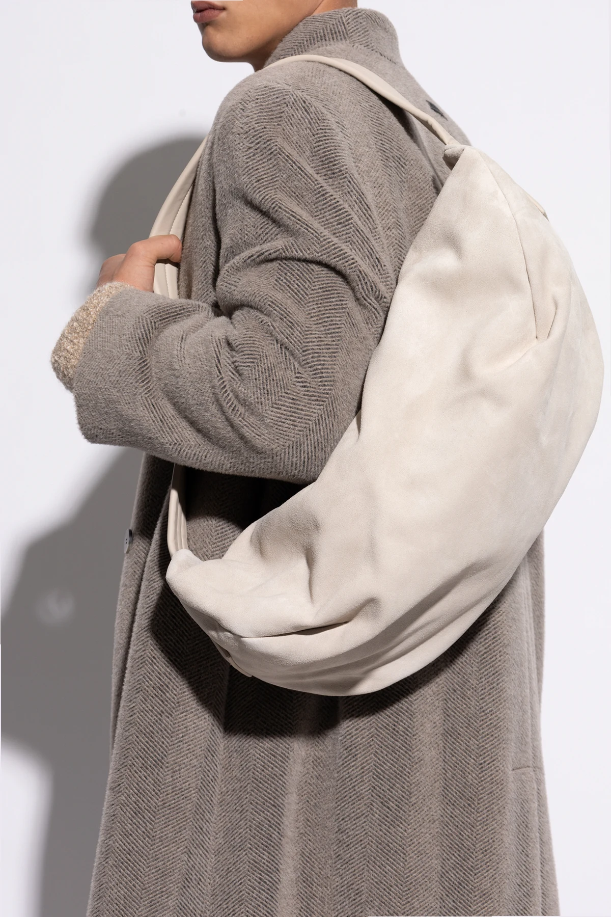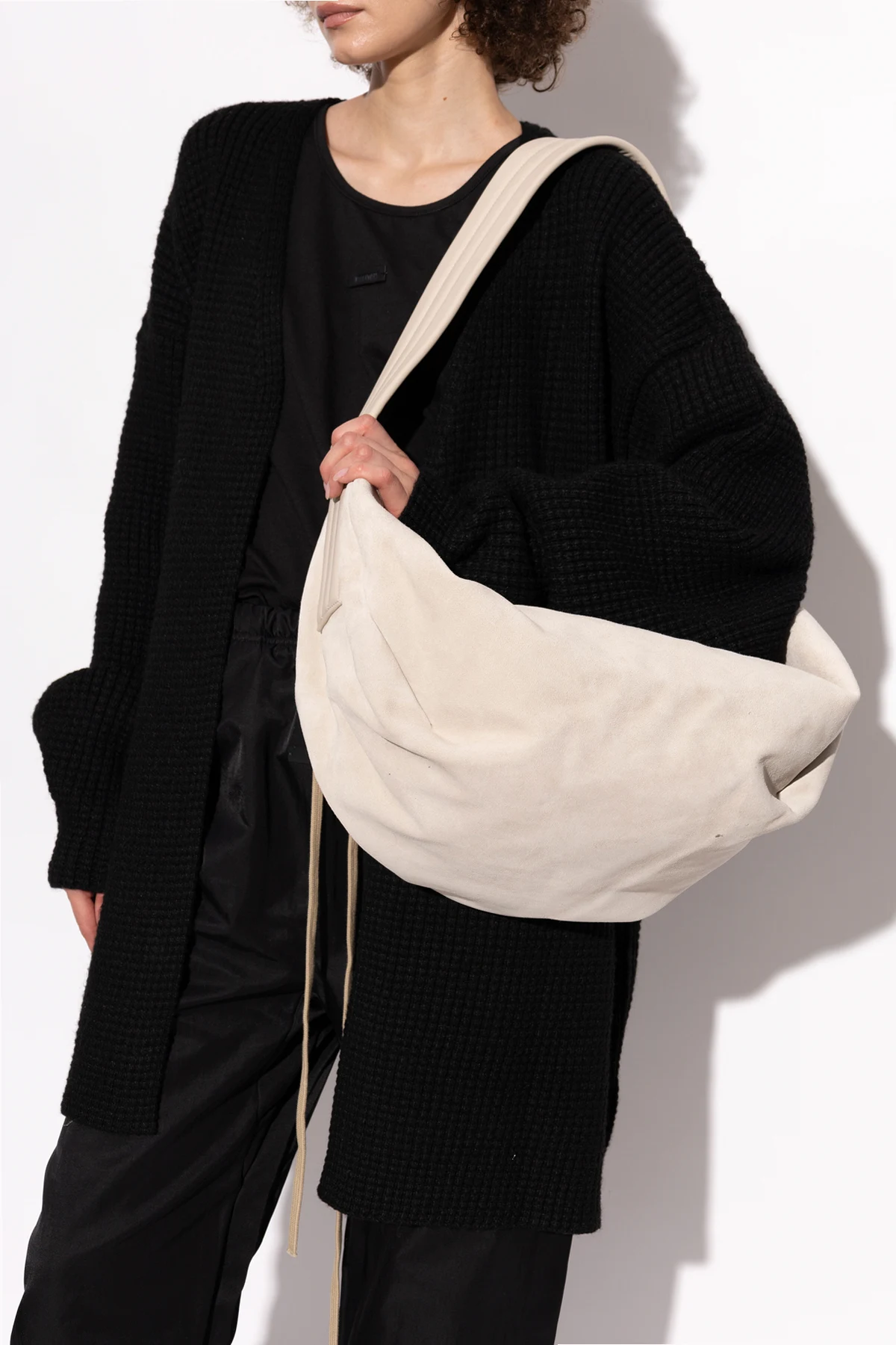 Na załączonych zdjęciach widoczna jest ekskluzywna skórzana torba na ramię z renomowanej kolekcji modowej Fear Of God . Ta torba, wykonana w całości z gładkiej, wysokiej jakości skóry, emanuje elegancją i luksusem, będąc idealnym dodatkiem zarówno na co dzień, jak i na bardziej formalne okazje.