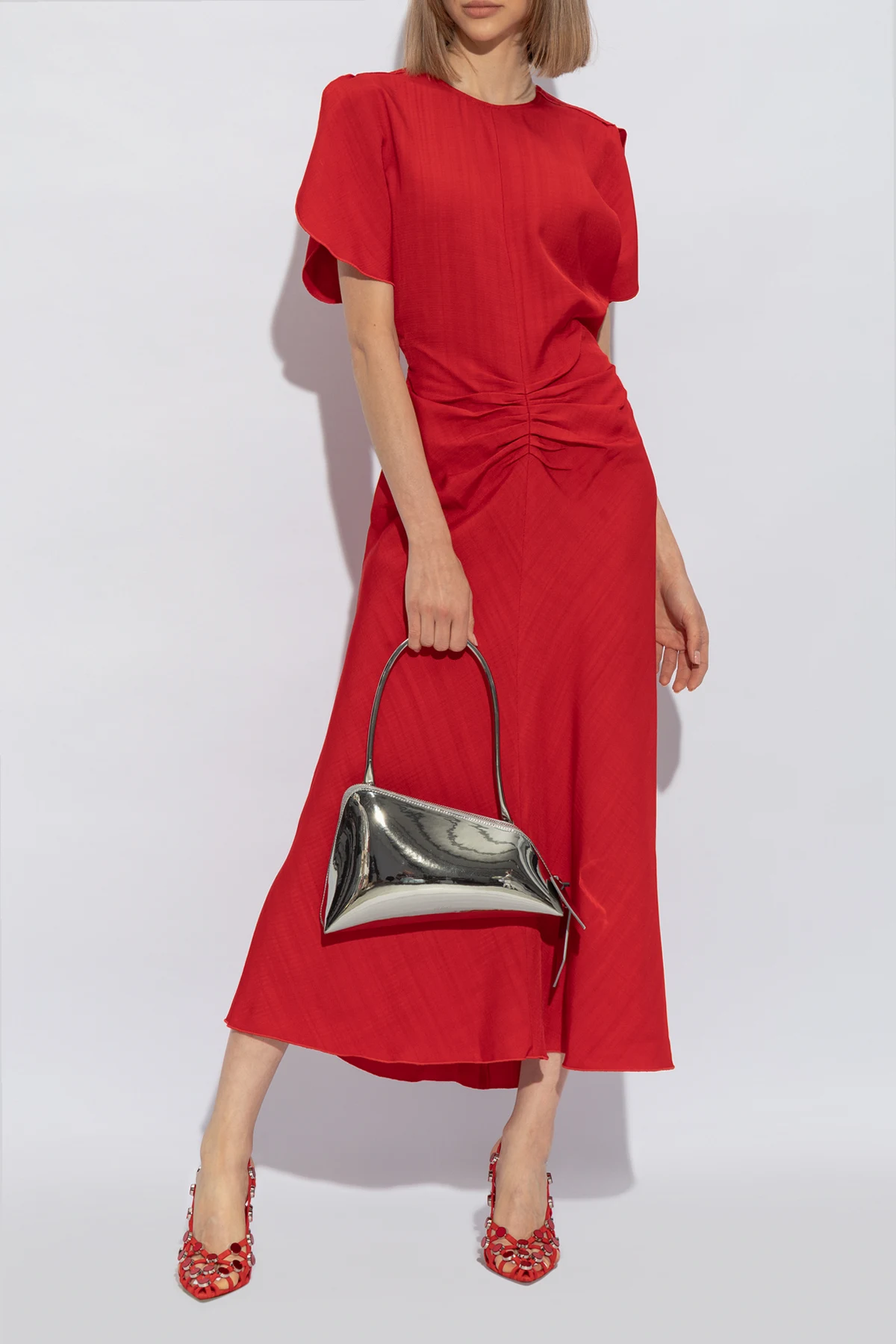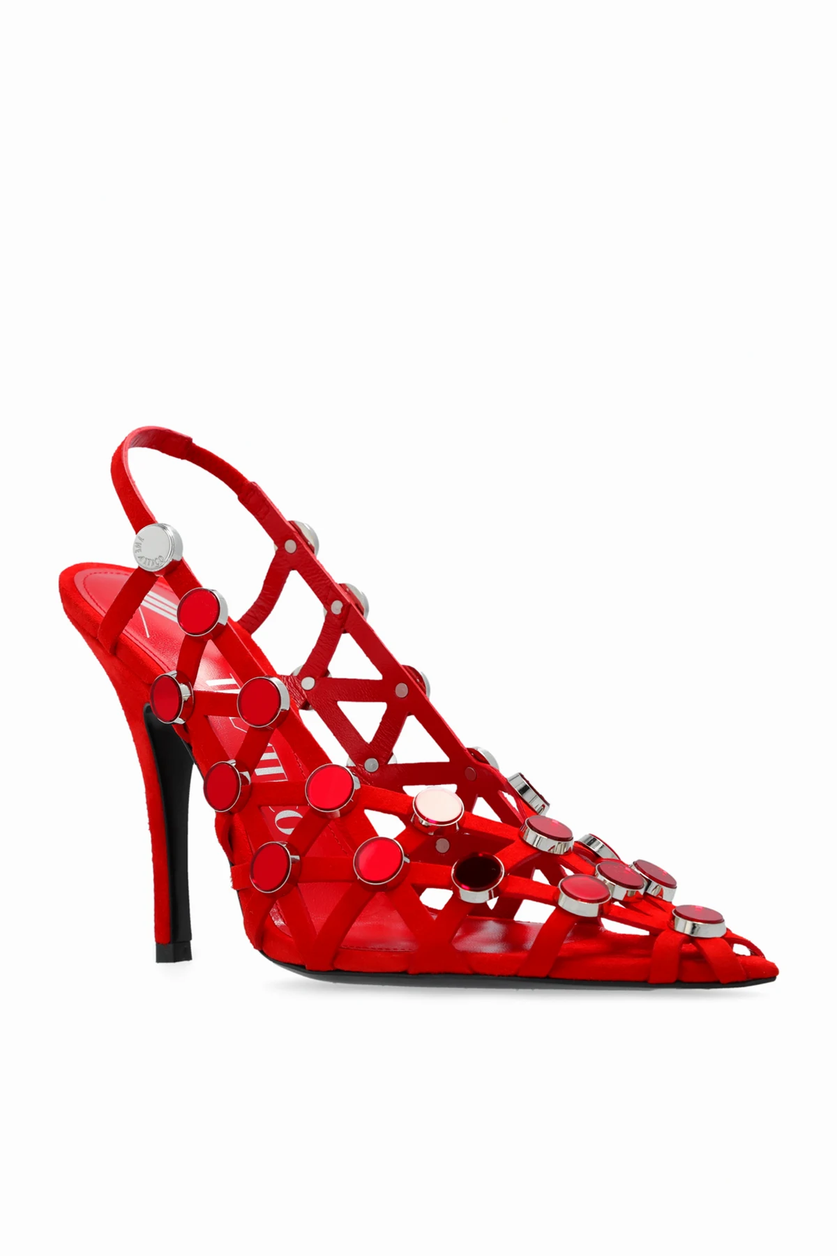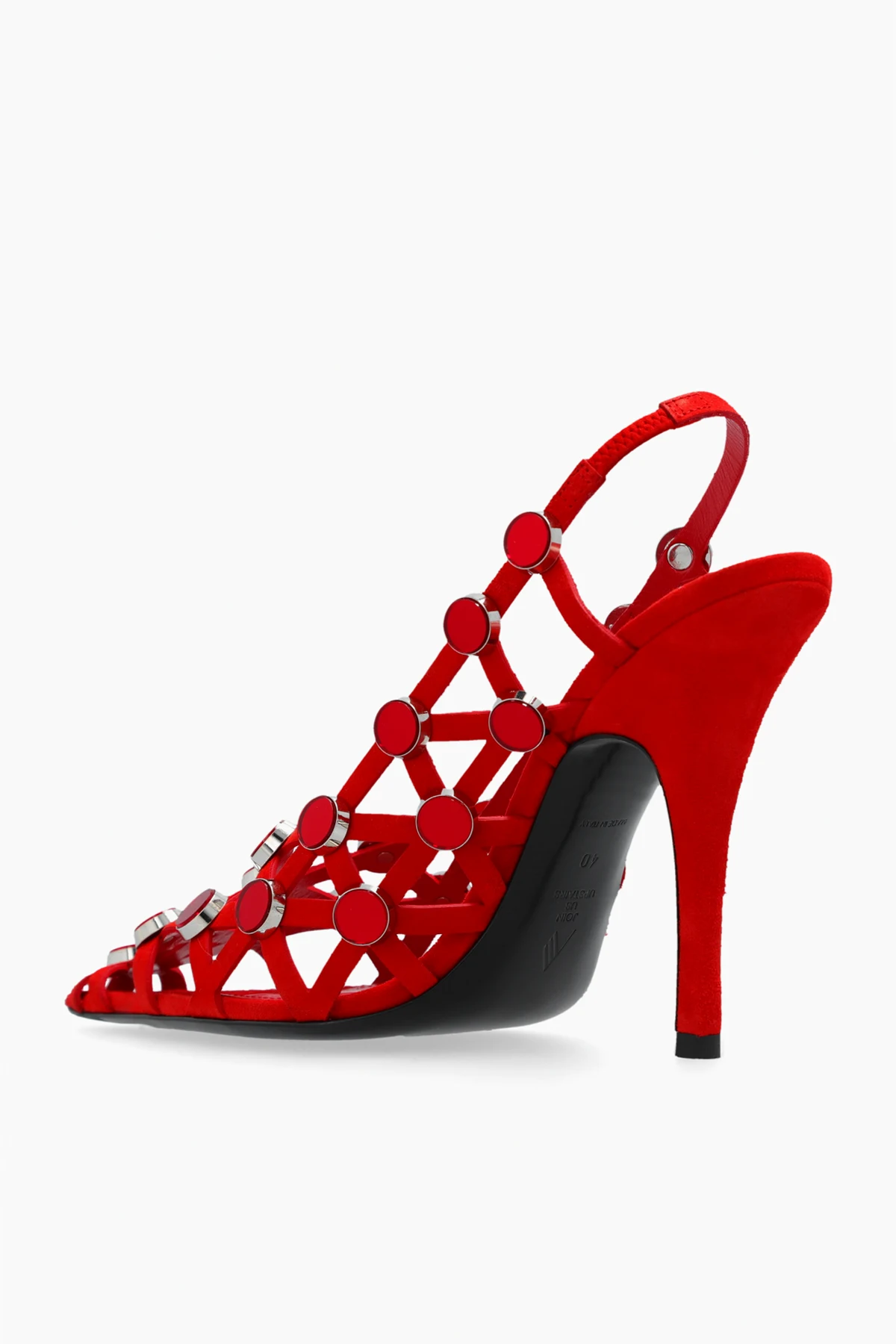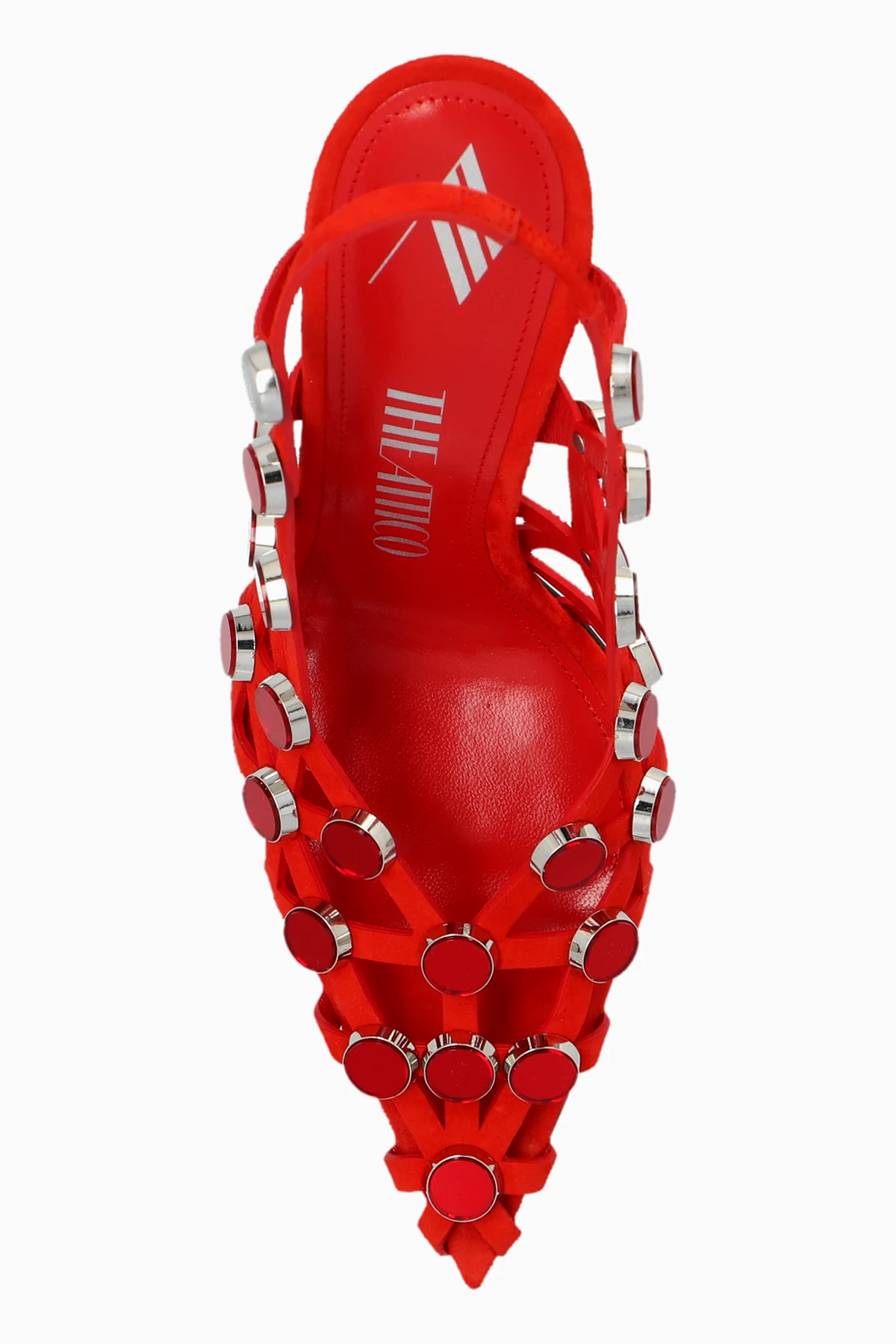 Niezwykła kreacja od The Attico , buty na obcasie "Grid" , stanowią apogeum wyszukanego stylu i niebanalnego designu. Ich głęboki, czerwony odcień urzeka intensywnością, a unikatowy wzór przypominający kratkę, stworzony przez czerwone paski połączone srebrnymi, możliwie metalowymi elementami, dodaje całej konstrukcji wyjątkowej elegancji. Ostro zakończony przód nadaje im charakteru, podkreślając dynamikę i zdecydowany charakter noszącej je osoby.