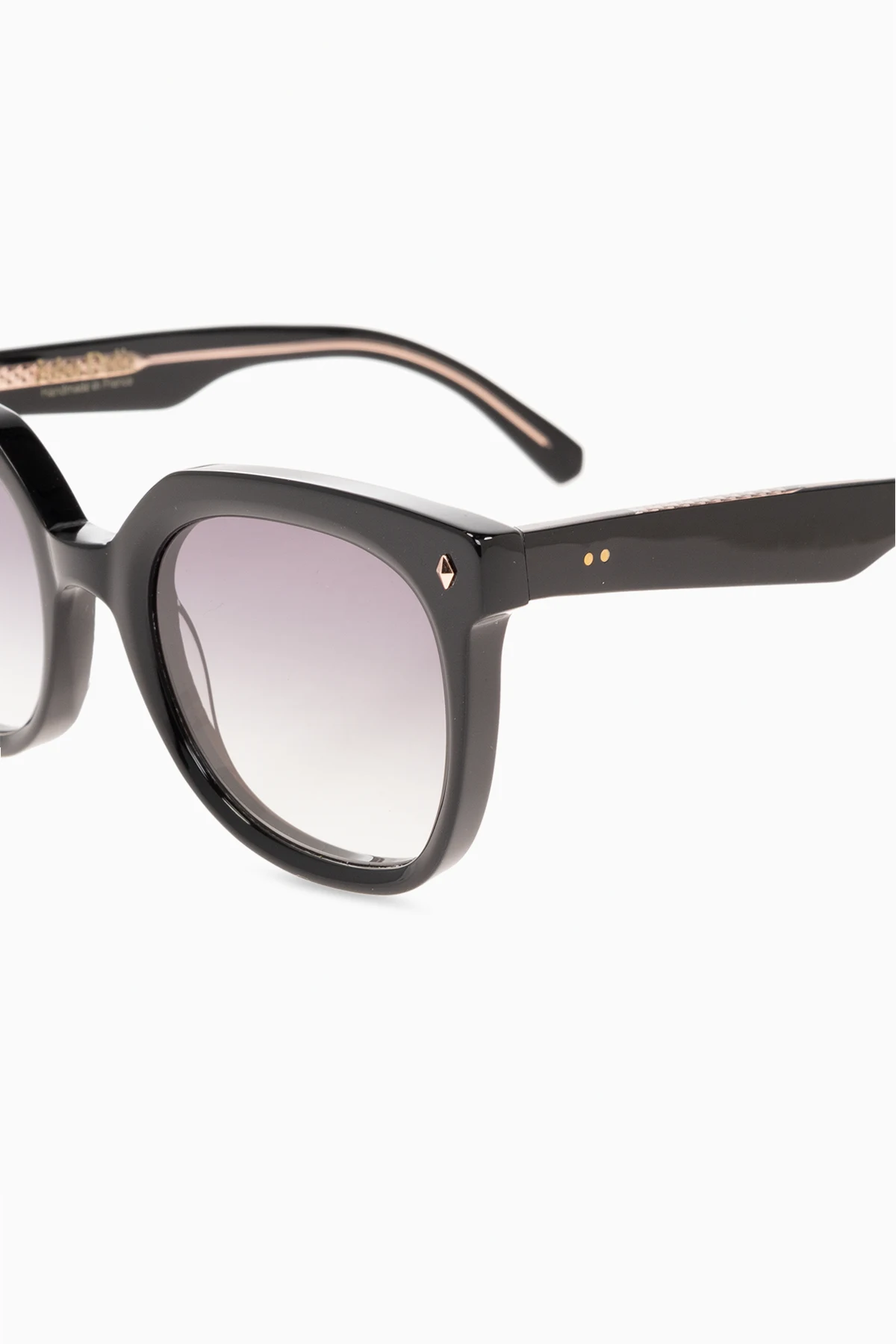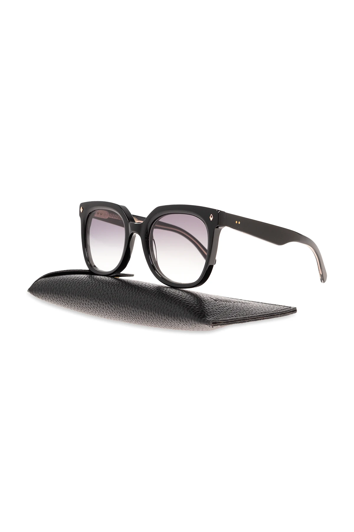 Czarne okulary przeciwsłoneczne, model ‘Monica’ John Dalia. Kwadratowe oprawki wykonane z 8-milimetrowej płyty octanowej, z pojedynczym mostkiem i zintegrowanymi noskami. Zauszniki z wtłoczoną ramą w kolorze różowego złota. Szare, gradientowe soczewki chroniące przed promieniami UV, refleksami i światłem niebieskim. Pozłacane metalowe wykończenie. Dołączone etui.