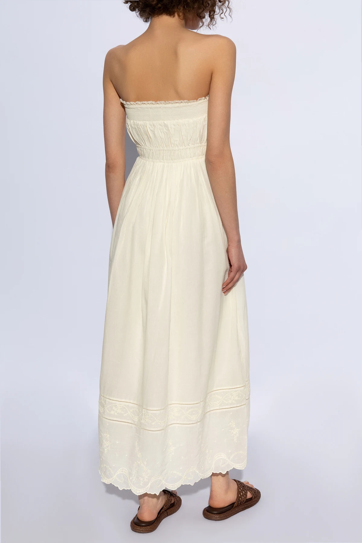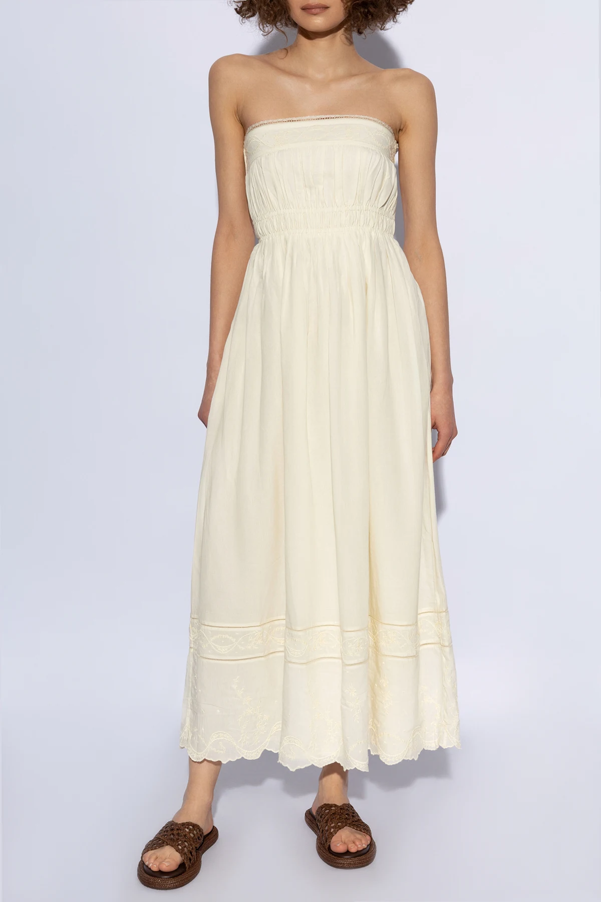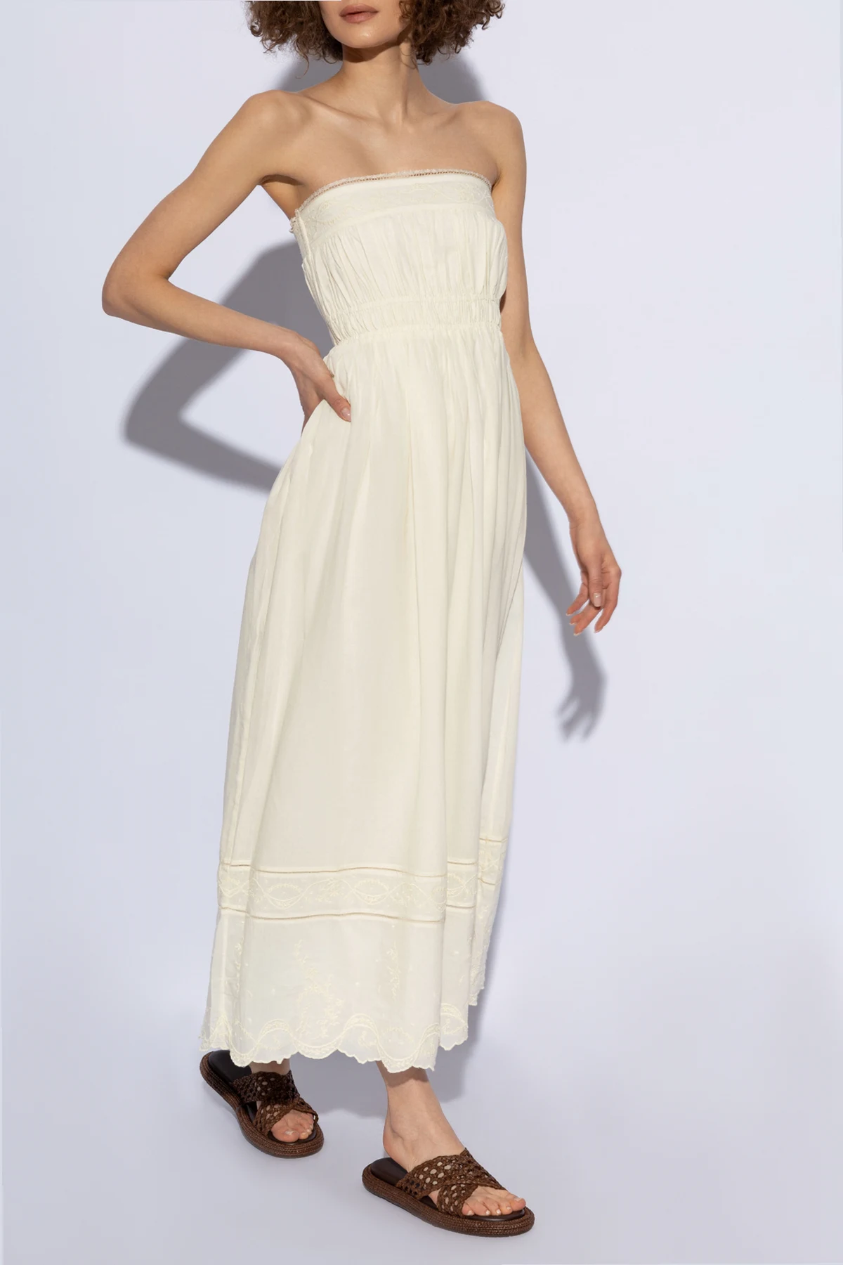 Sukienka Mylah zachwyca swym romantycznym i kobiecym stylem . Bezramienny krój z elastycznym pasem pod biustem zapewnia wygodę noszenia i doskonałe dopasowanie do różnych sylwetek. Dół sukienki delikatnie rozszerza się ku dołowi, dodając lekkości i swobody ruchów. Detale takie jak koronkowe wstawki oraz misterny haft na dole sukienki i w okolicach pasa, wprowadzają elementy subtelnej ozdobności, podkreślając jej unikatowy charakter.
