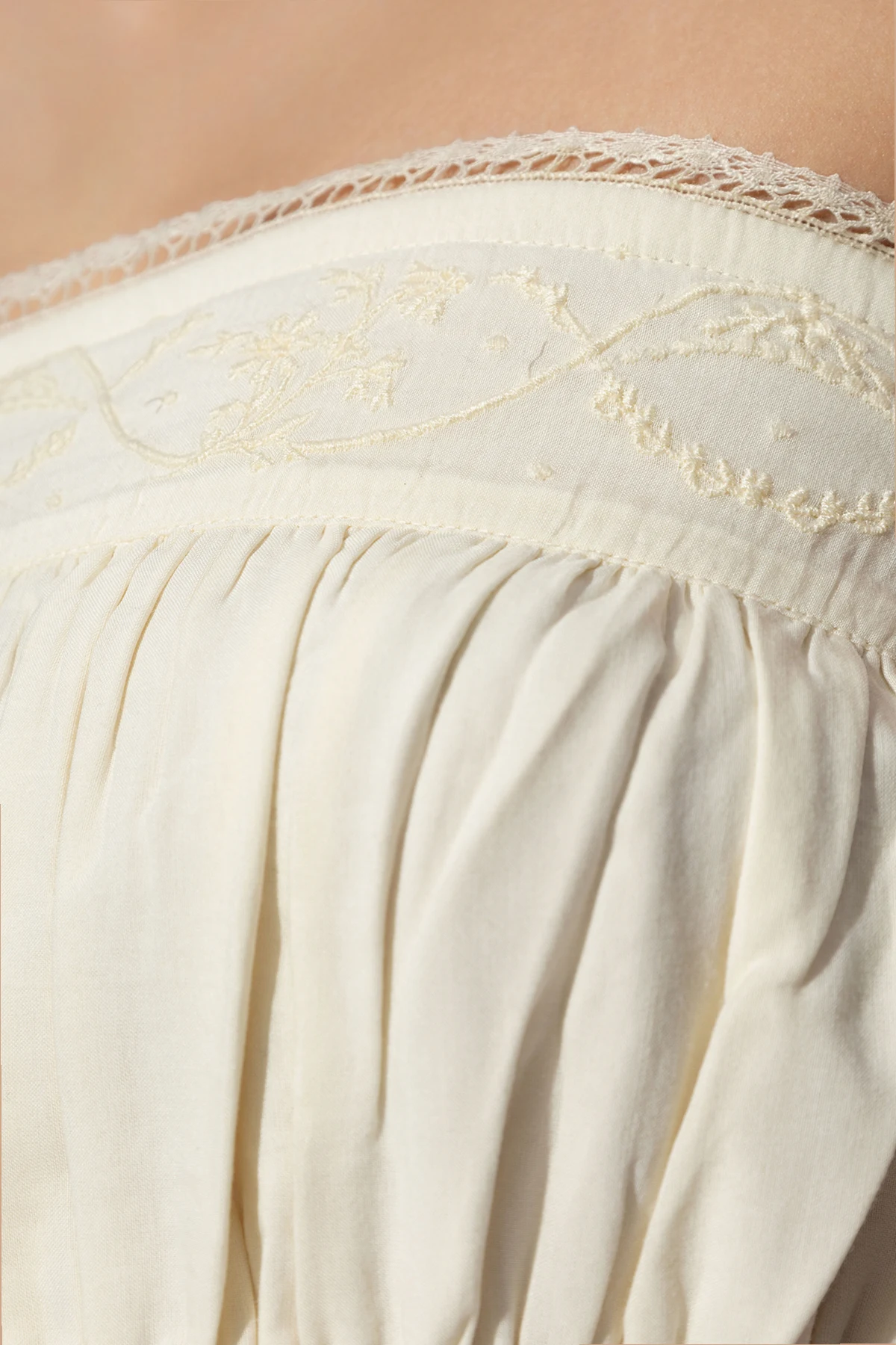 Subtelna elegancja: kremowy kolor i delikatne zdobienia haftem oraz koronką.