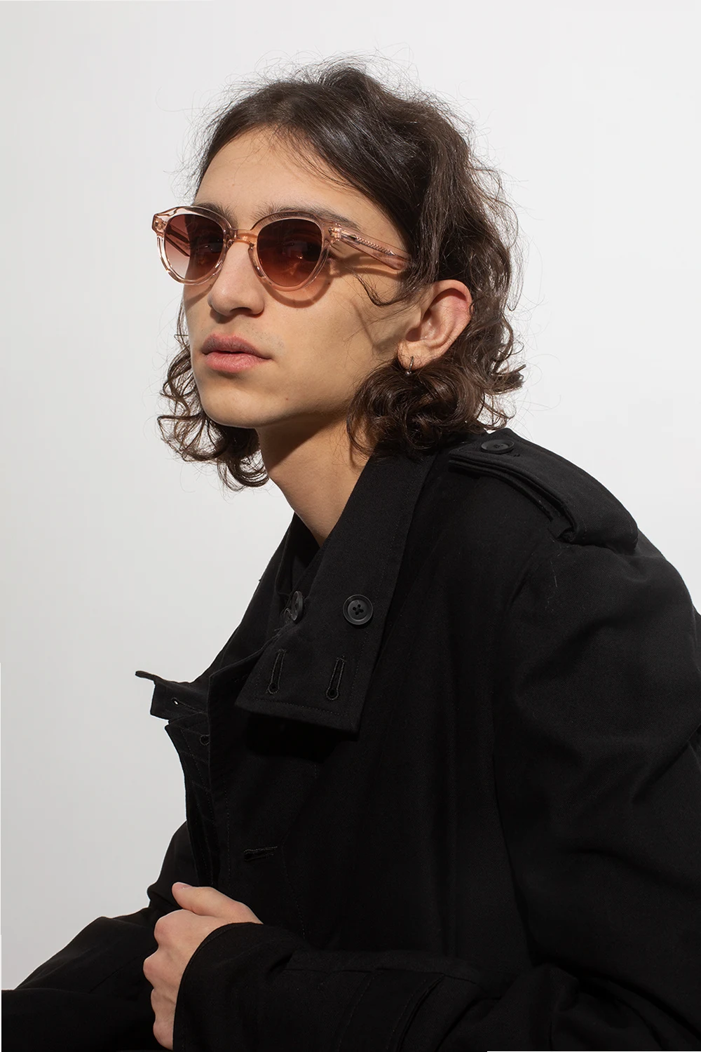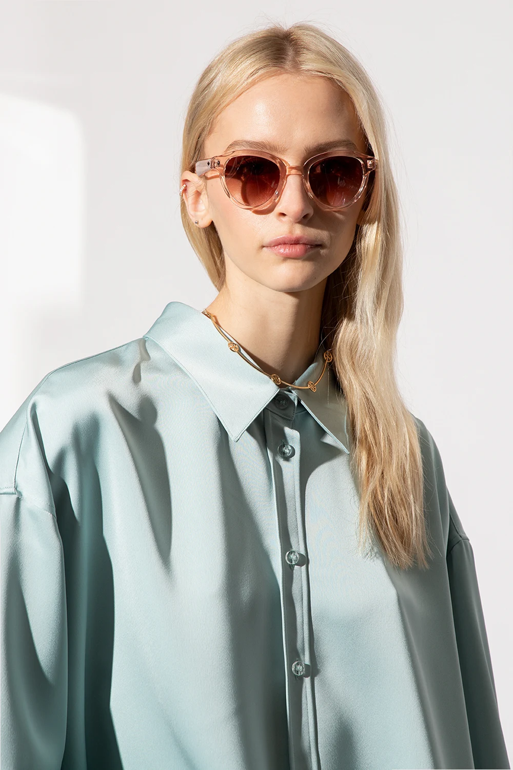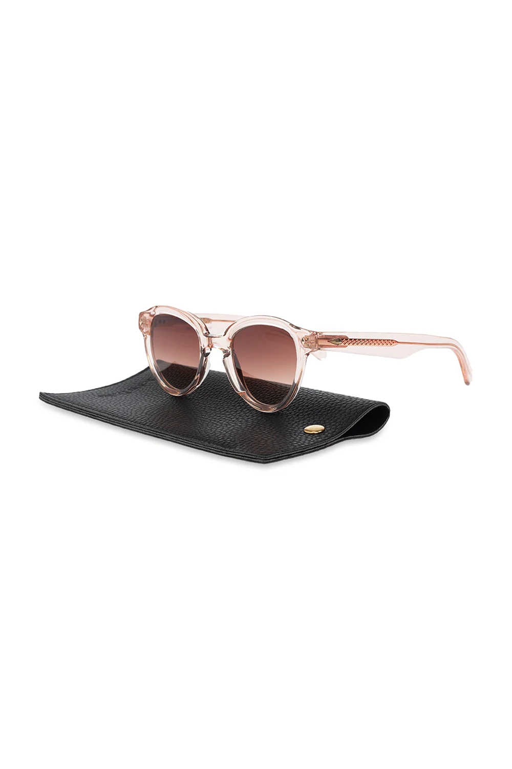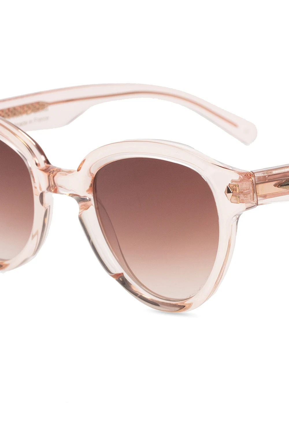 Różowe, transparentne okulary przeciwsłoneczne, model ‘Ornella’ John Dalia. Pokryte 22-karatowym złotem. Brązowe, gradientowe, certyfikowane soczewki 100% UVA i UVB. Dołączone etui.