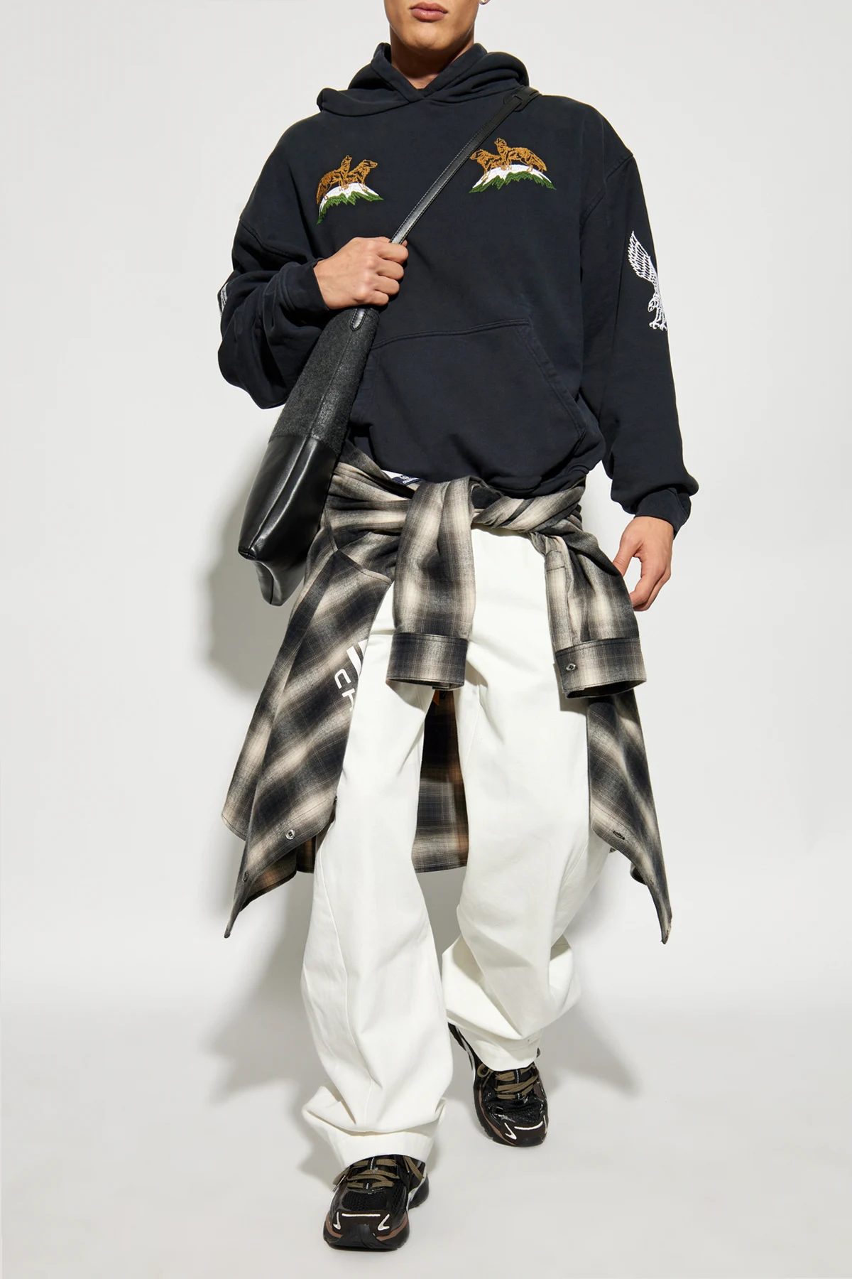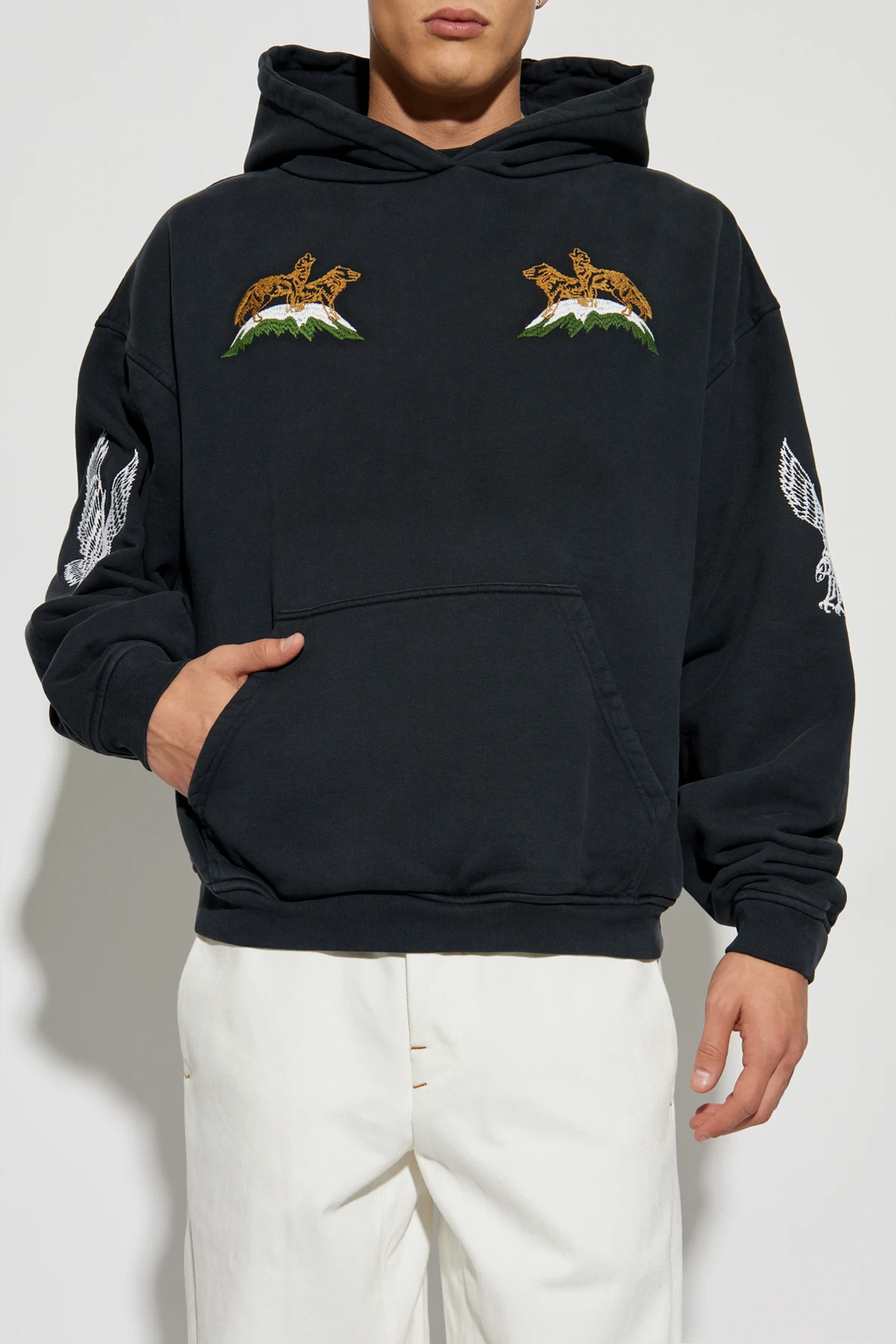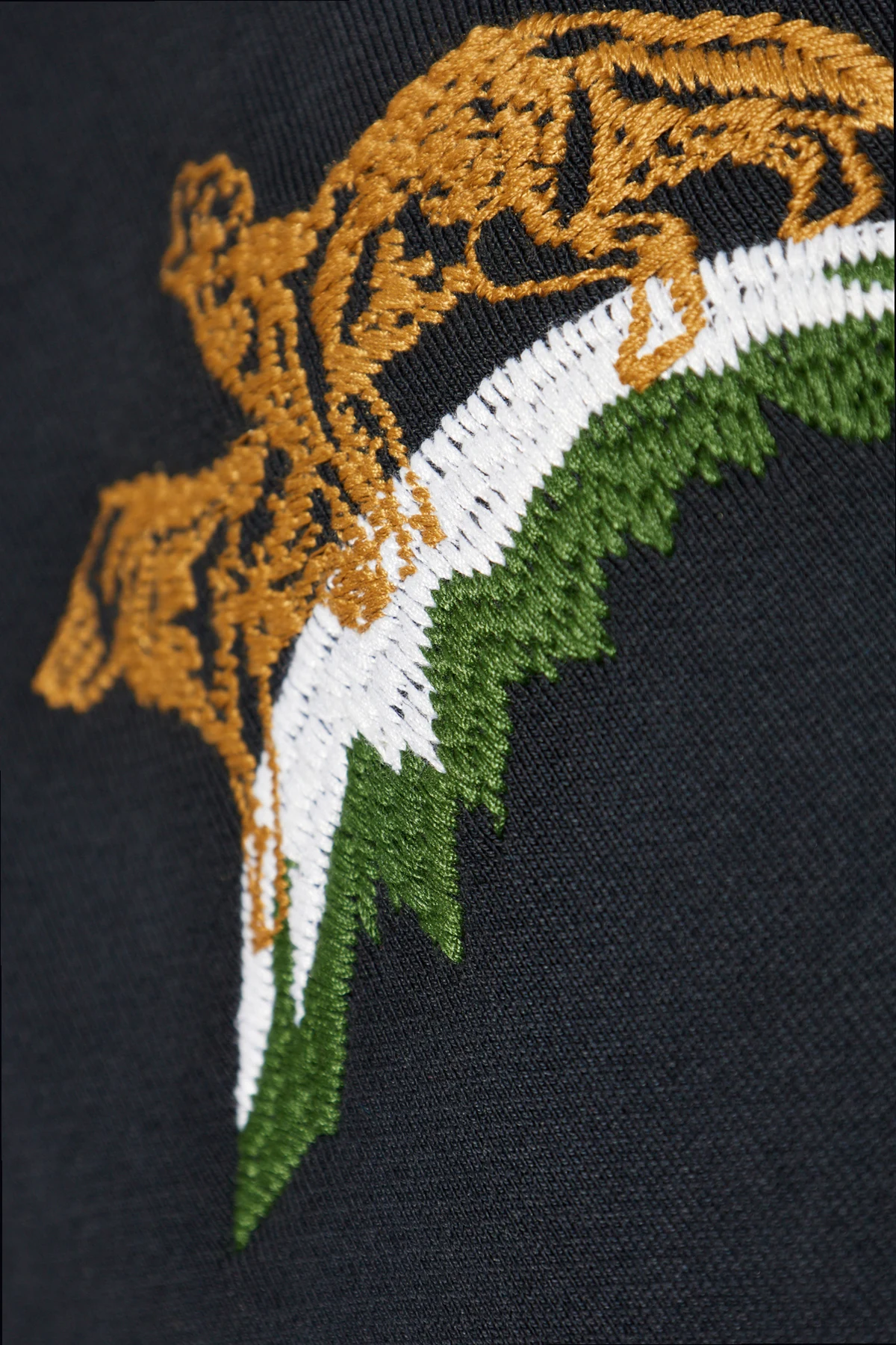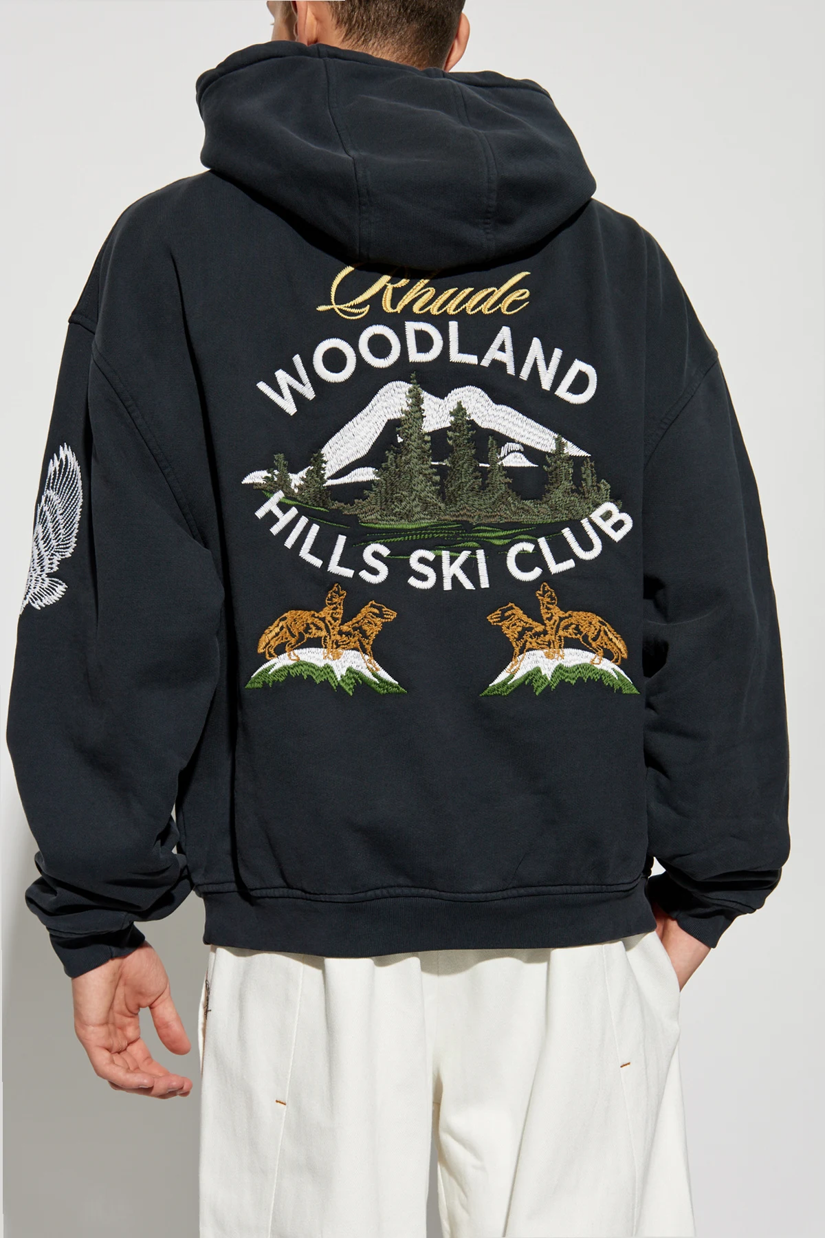 Dominujący czarny kolor idealnie komponuje się z kunsztownie wykonanymi haftami. Na przedniej części bluzy znajdują się dwa brązowe tygrysy na tle zielono-białych gór, tworząc wyjątkowy motyw. Oba rękawy zdobią haftowane białe pióra, dodające subtelnej elegancji. Tył bluzy przyciąga wzrok dużym napisem "WOODLAND HILLS SKI CLUB" oraz powtórzonym wzorem tygrysów, a nad napisem umieszczono dodatkowy tekst "Rhude".