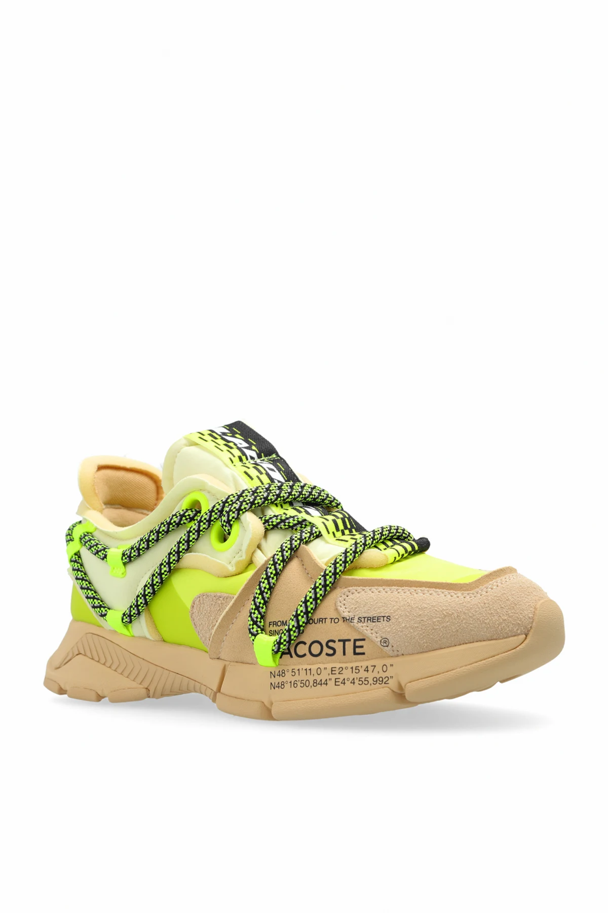 Wykonane z połączenia najwyższej jakości materiałów tekstylnych i syntetycznych, oferują niezwykłą lekkość i przewiewność. Gumowa podeszwa zapewnia doskonałą przyczepność, a zielono-czarne sznurowadła dodają im niepowtarzalnego charakteru. Detale, takie jak napis "LACOSTE" z współrzędnymi geograficznymi oraz logo marki w czarno-białej kolorystyce na języku, podkreślają ich unikatowość.
