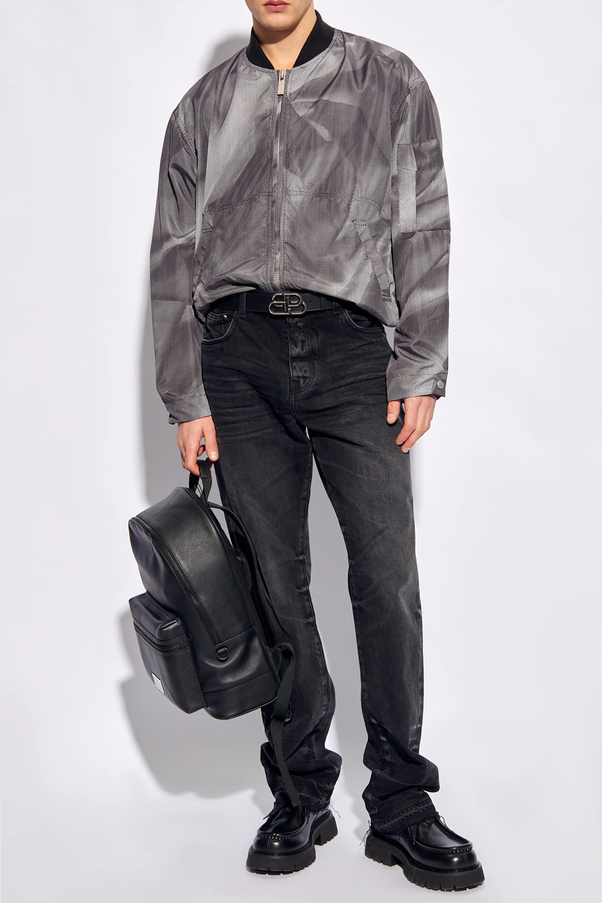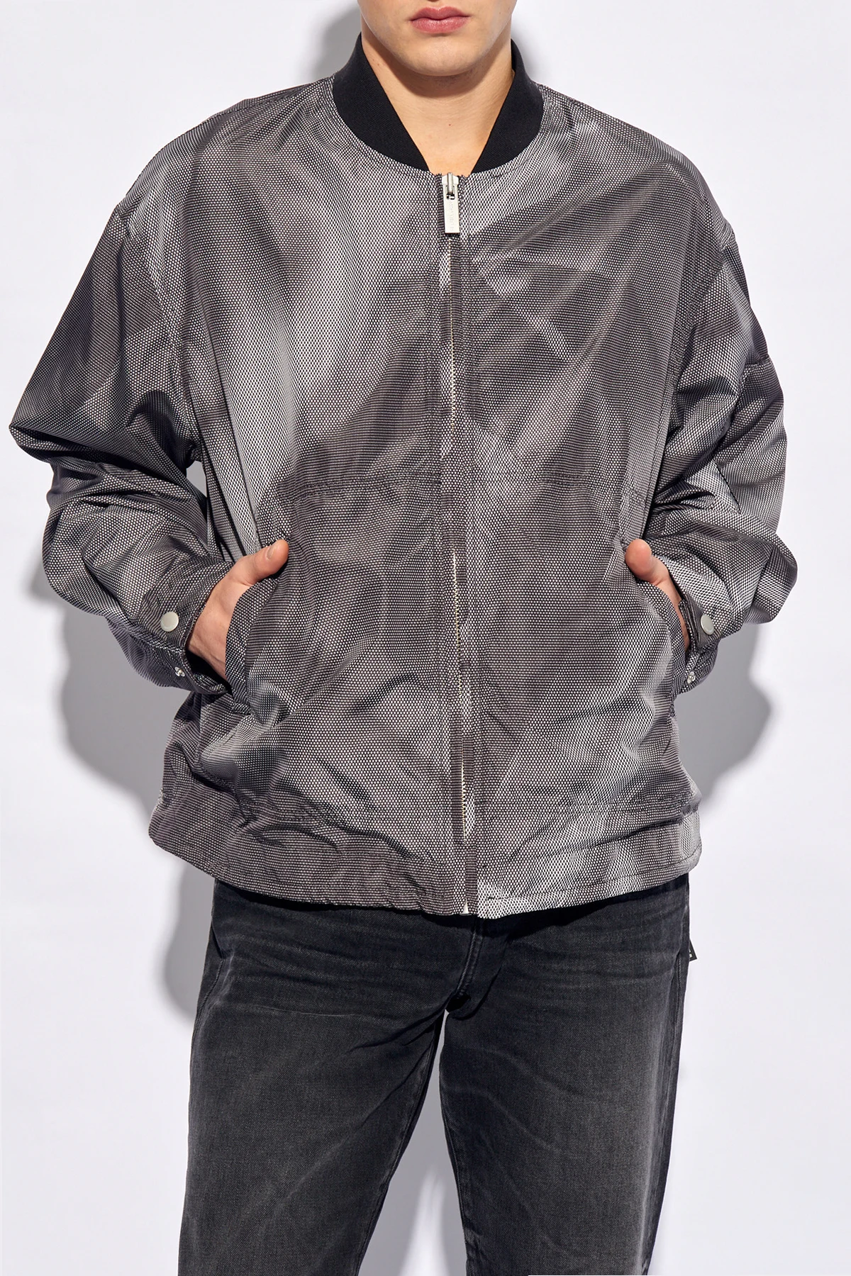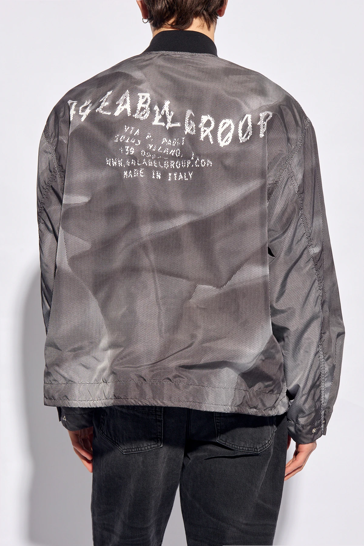Szaro-biała, lekka kurtka 44 Label Group. Wykonana z materiału z recyklingu. Zapinana na zamek. Ozdobiona wzorem z logo. Dwie wsuwane kieszenie. Dekolt wykończony ściągaczem. Dół ściągany trokami. Długie rękawy zakończone regulowanym zapięciem na zatrzask.