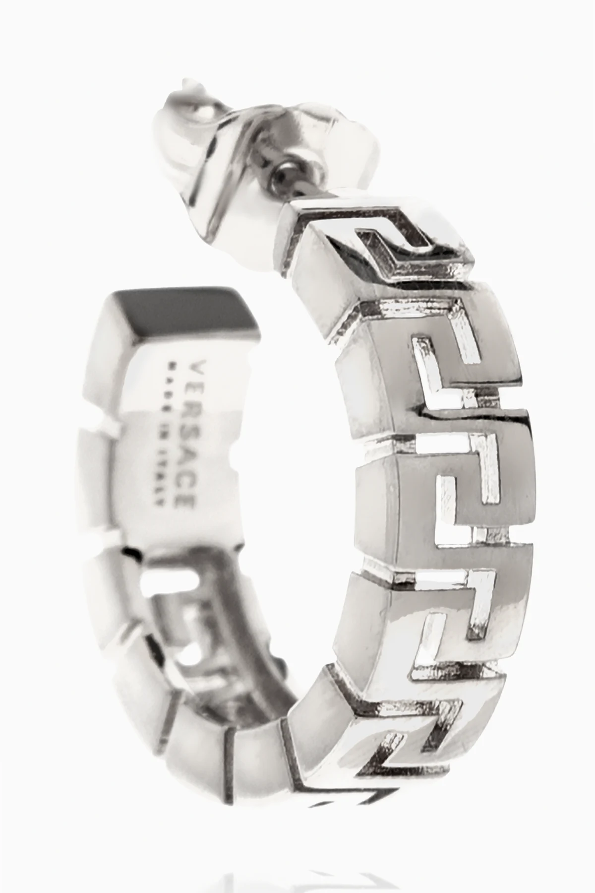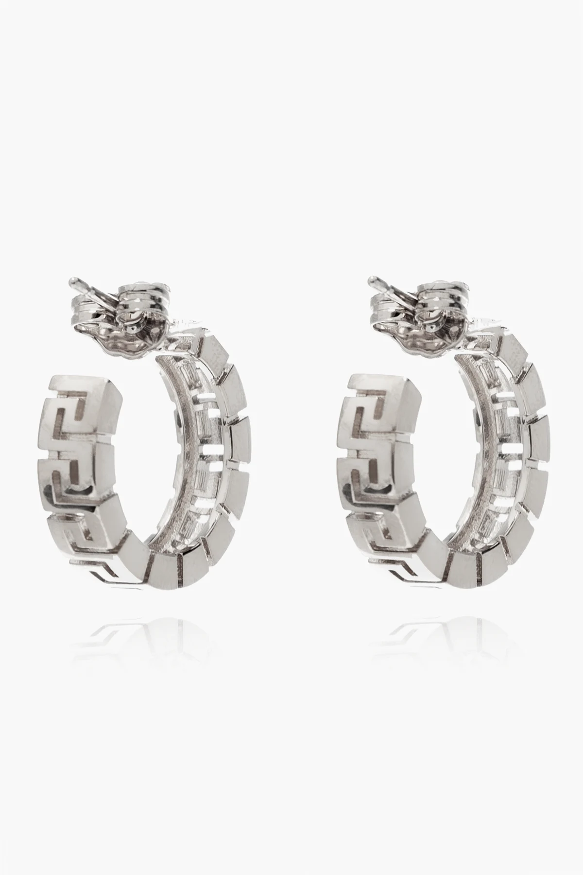 Kolczyki w kolorze srebrnym Versace. Ozdobione charakterystycznym greckim wzorem. Zapięcie na sztyft.