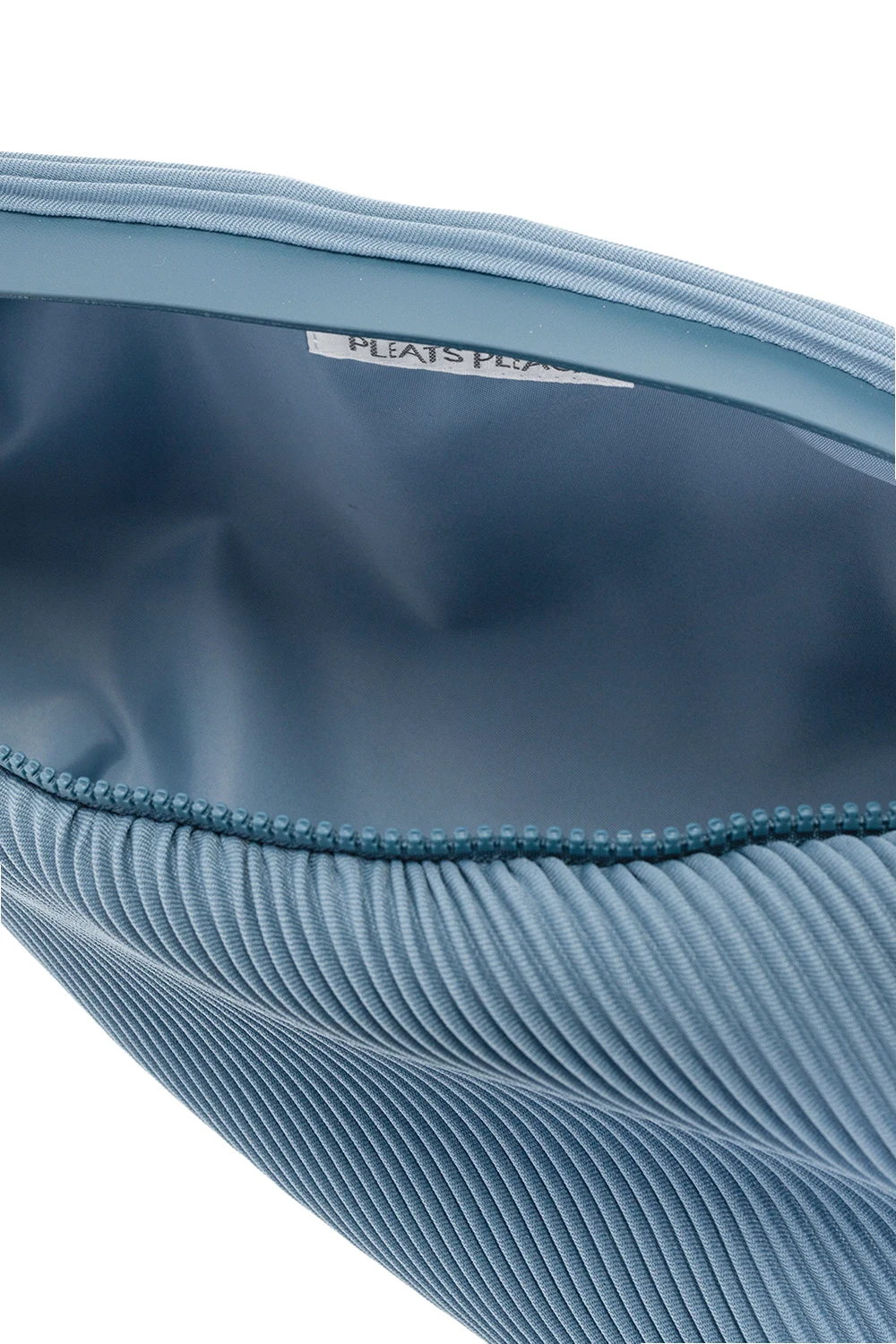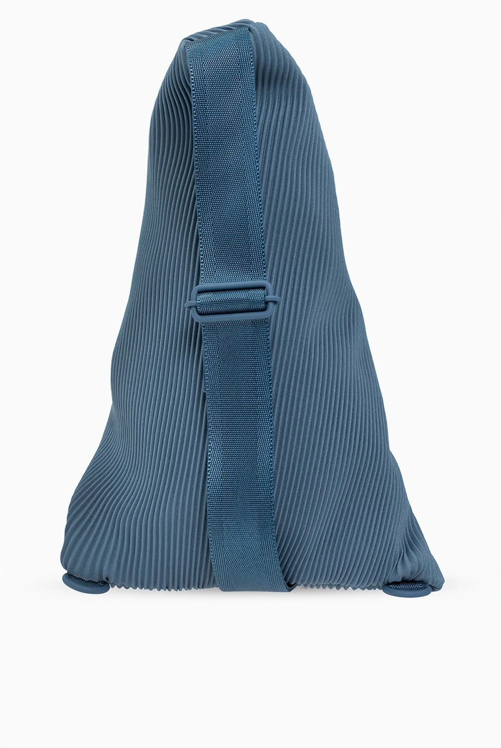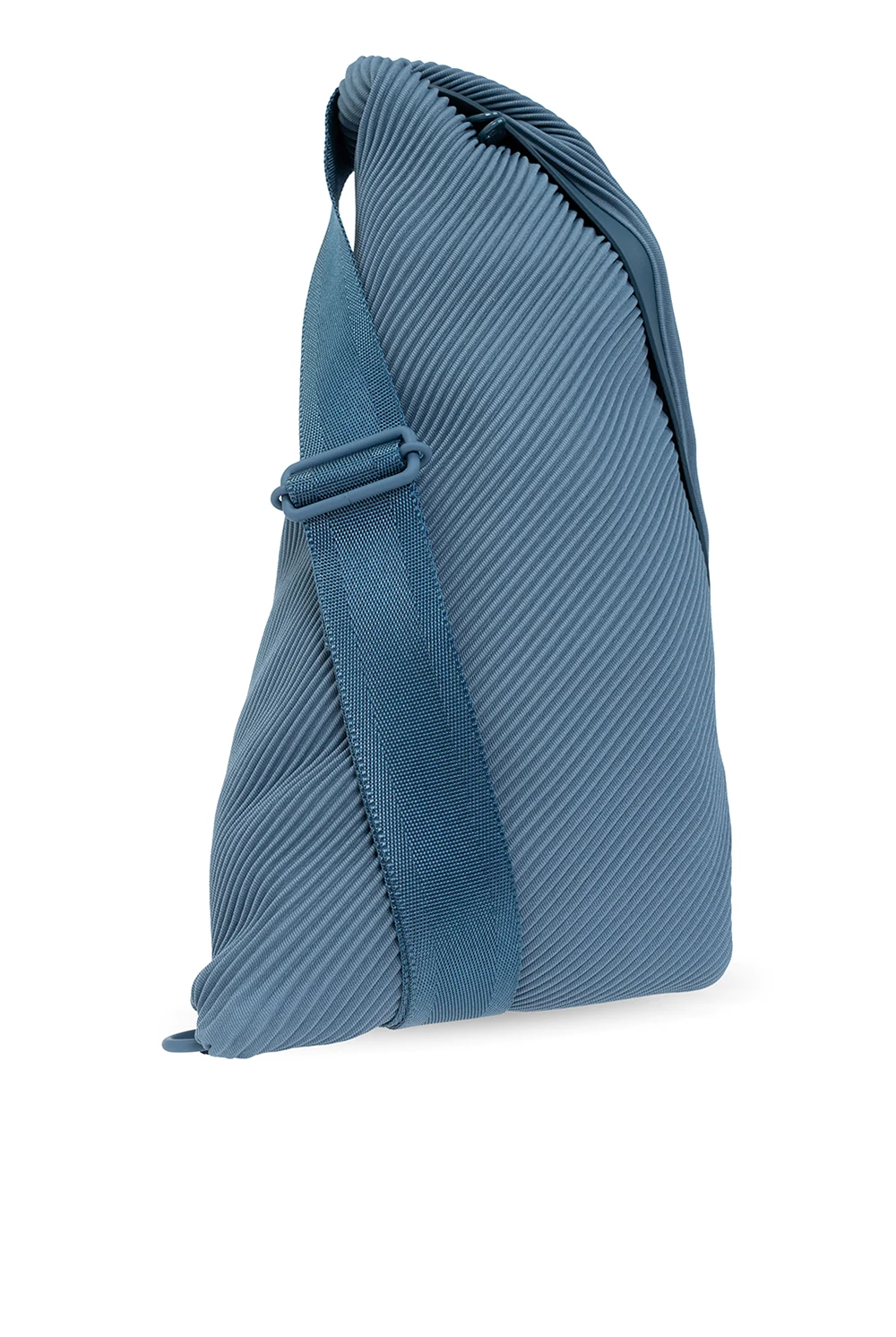 Niebieski, plisowany plecak Issey Miyake Pleats Please. Zamykany na dwubiegunowy zamek. Szelka na ramię z możliwością regulacji długości. Wewnątrz komora. Skórzane wykończenie.
