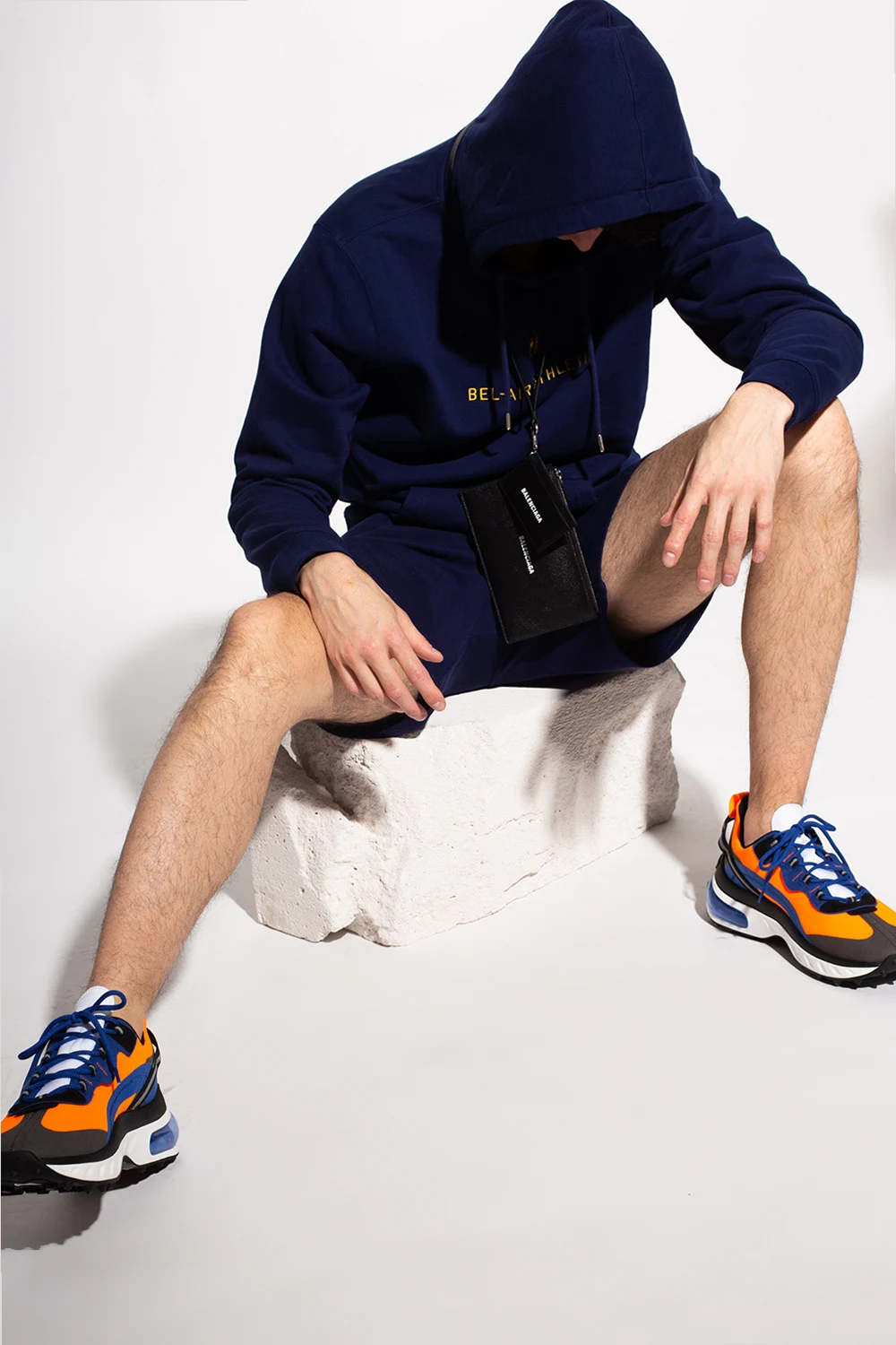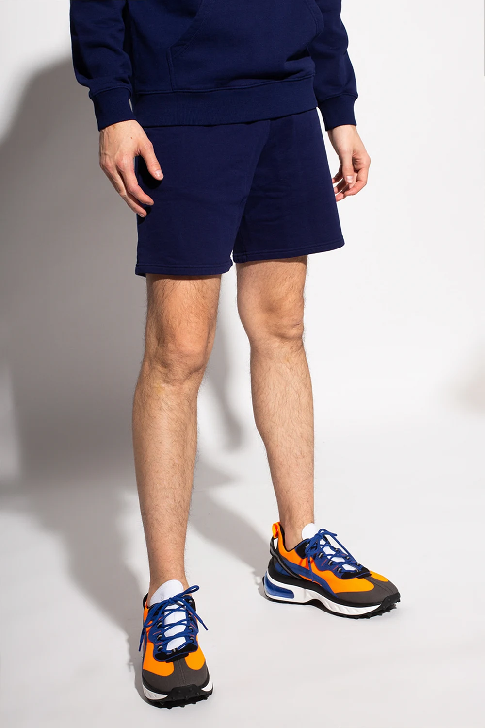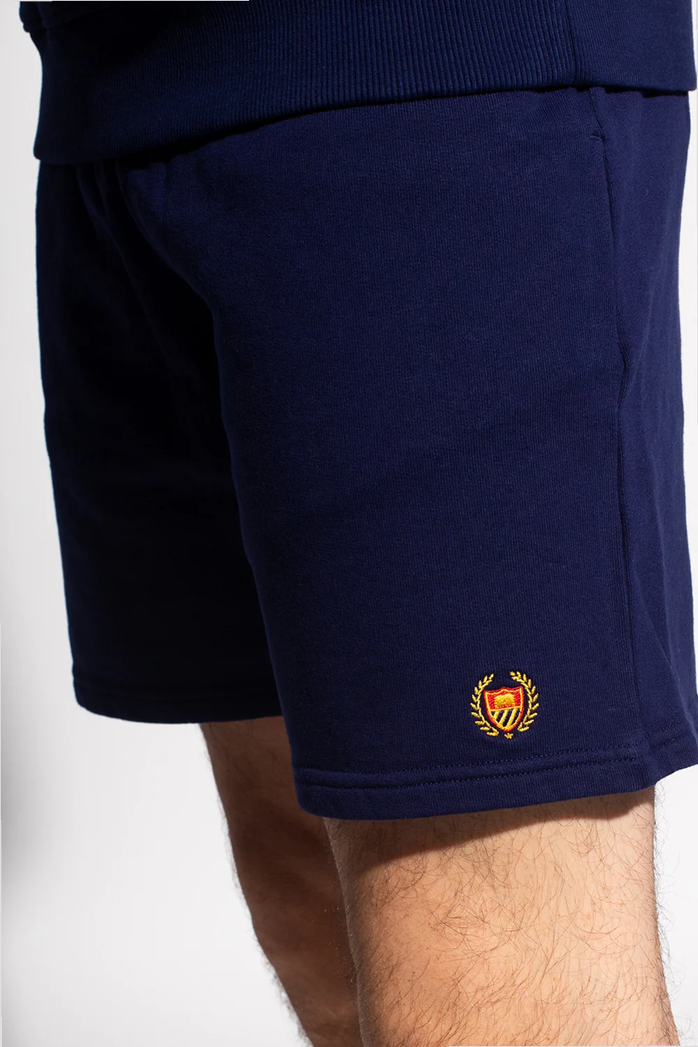 Granatowe, bawełniane szorty Bel-Air Athletics. W pasie ściągane trokami. Ozdobione wyszytym logo oraz marszczeniami. Z przodu dwie wsuwane kieszenie.
