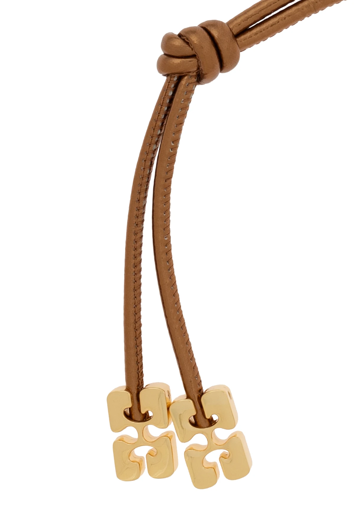 Brelok ma podłużny kształt węzła, zakończony kilkoma skórzanymi frędzlami, które ozdobione są złotymi metalowymi elementami w kształcie liter lub symboli. Prosty, elegancki wzór bez dodatkowych ornamentów, podkreślony jest brązową skórą i złotymi metalowymi detalami. Centralnym punktem breloka jest złoty klocek z wyraźnym logo projektanta, który dodaje mu wyjątkowego charakteru.