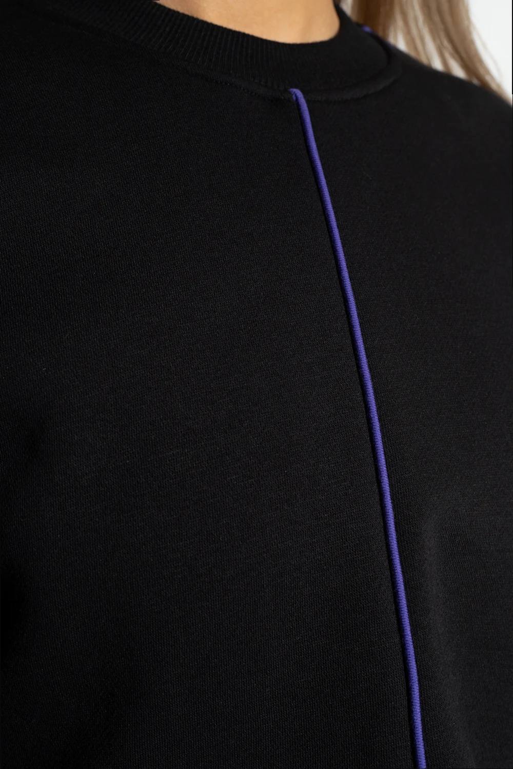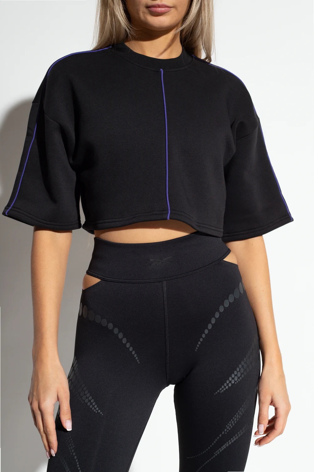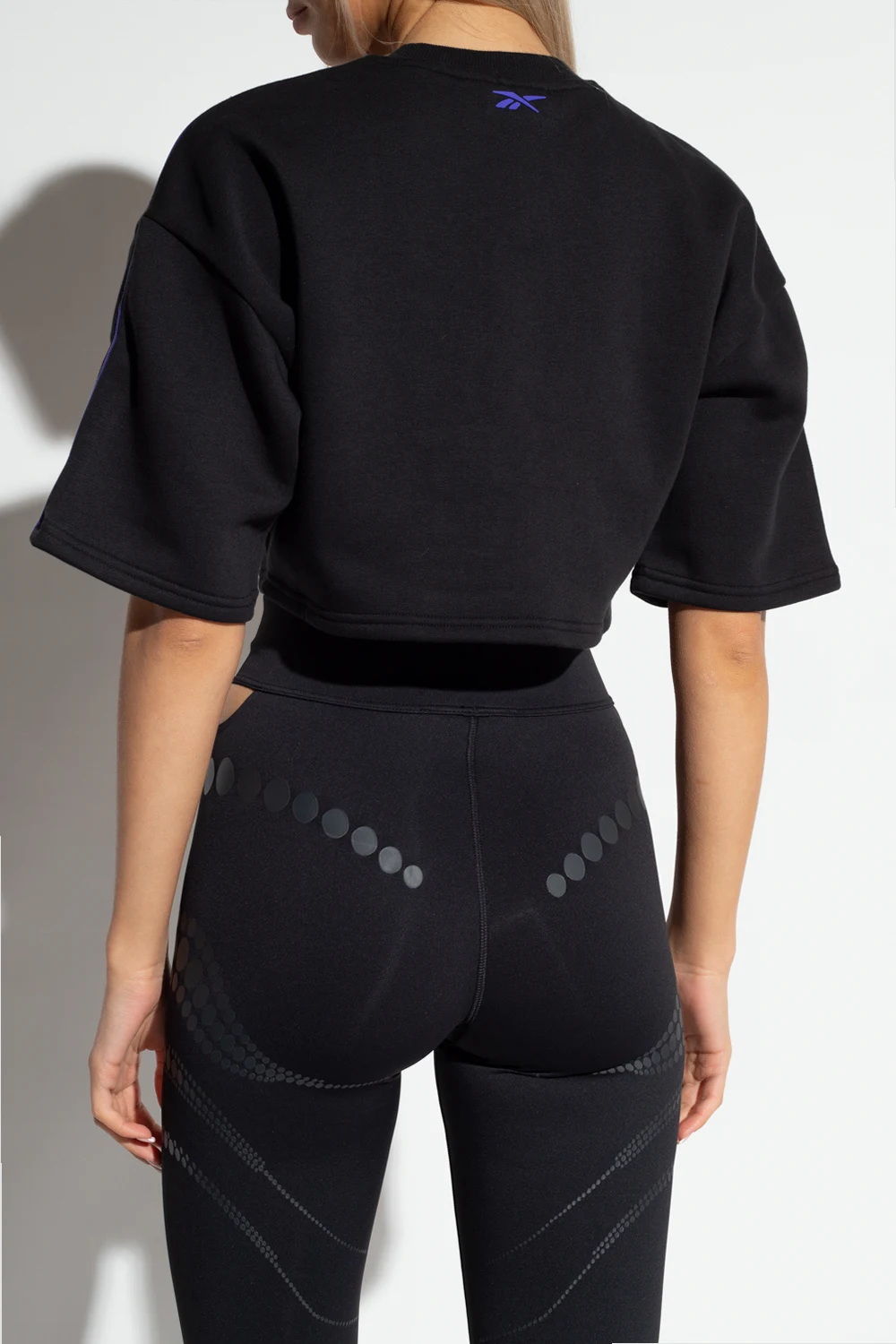Czarny, krótki t-shirt o luźnym kroju Reebok x Cardi B. Wykonany z mieszanki bawełny i materiału pochodzącego z recyklingu. Dekoracyjne lamówki z przodu i na ramionach. Z tyłu fioletowa naszywka z logo o gumowym wykończeniu. Okrągły dekolt wykończony ściągaczem, krótkie rękawy.