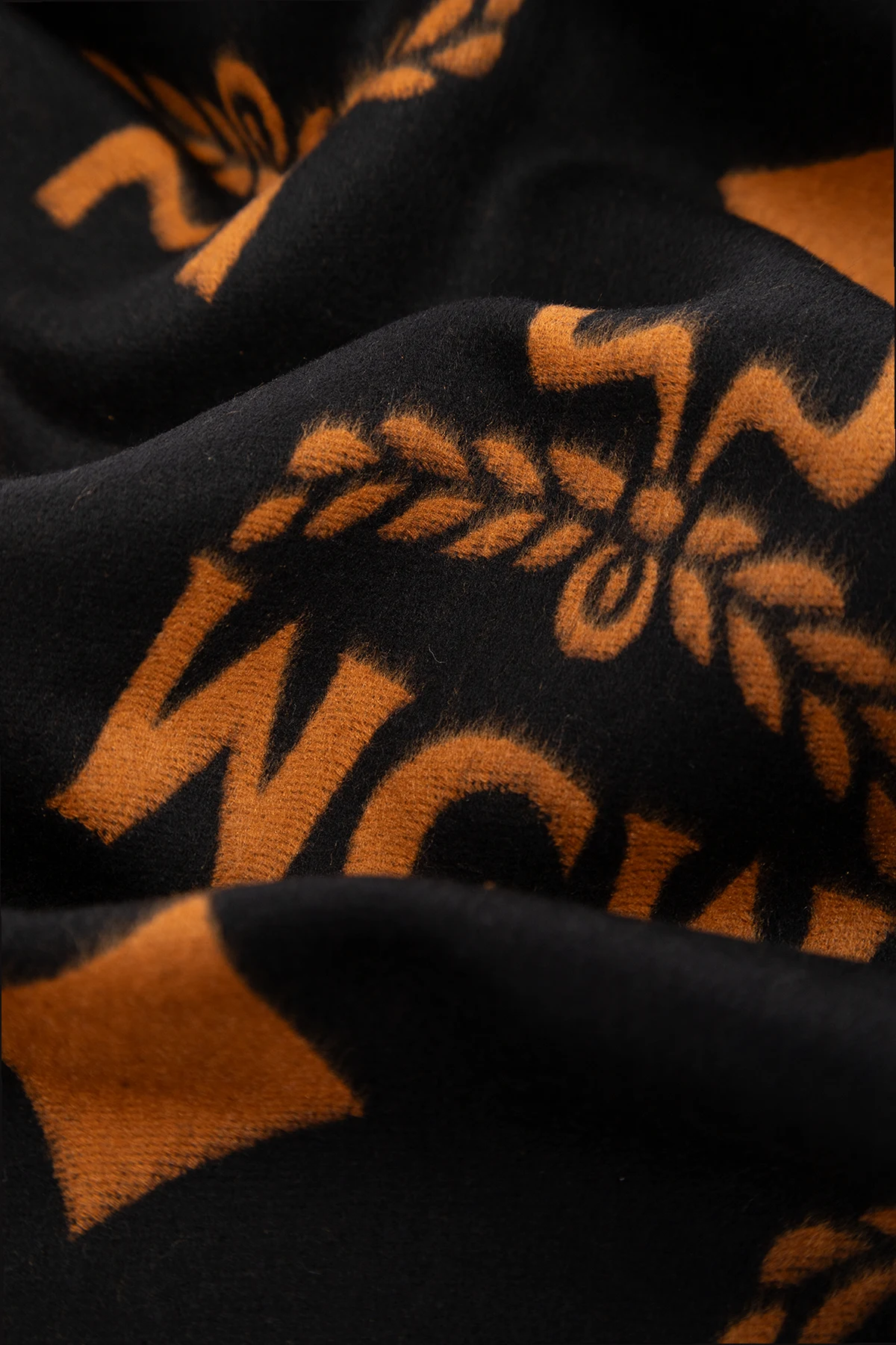 Brązowo-czarny szal MCM. Wykonany z jedwabiu. Ozdobiony wzorem z monogramem. Brzegi z surowym wykończeniem.