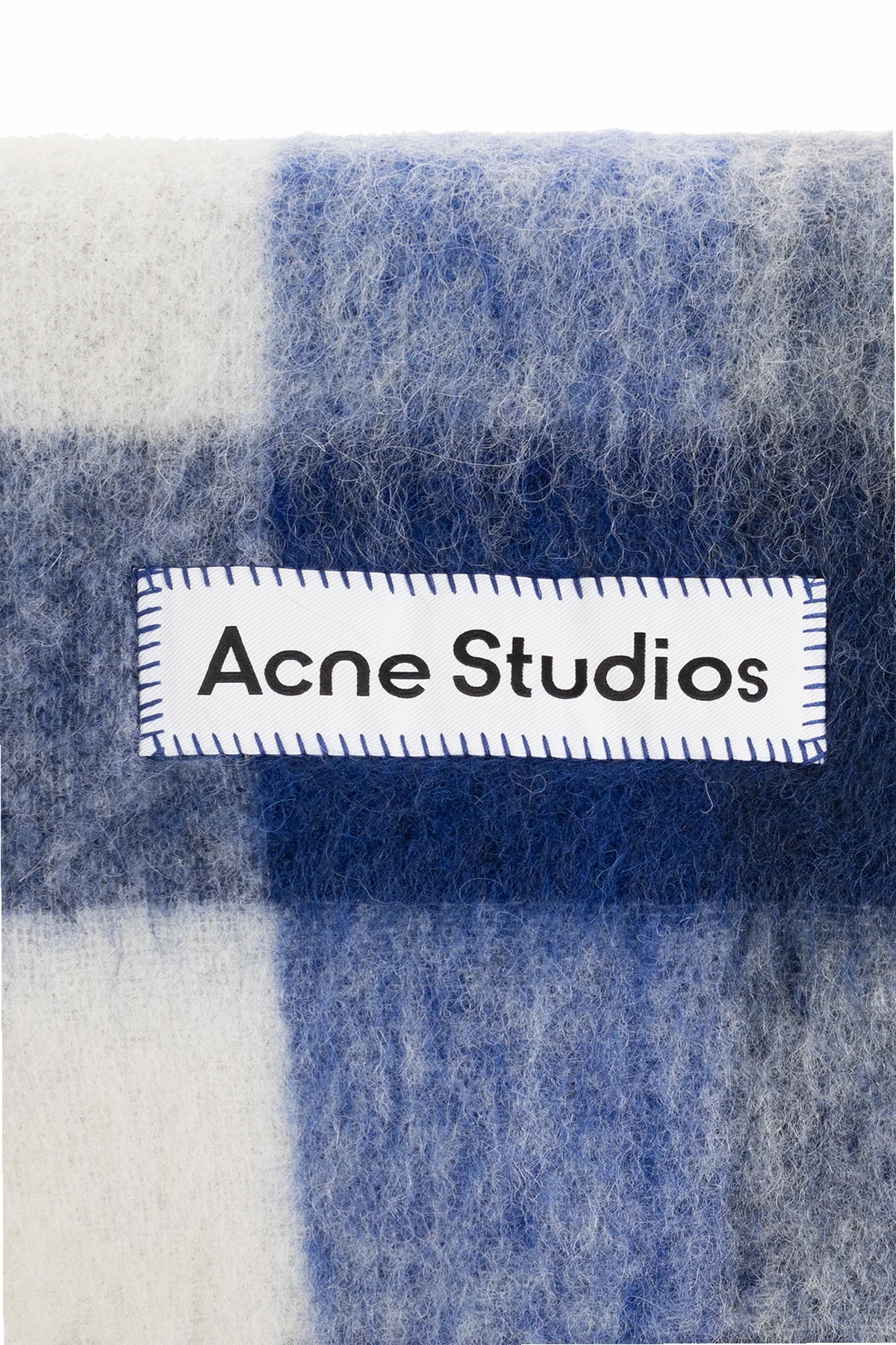 Biało-granatowo-szary szal Acne Studios. Wykonany z mieszanki alpaki, wełny i moheru. Ozdobiony wzorem w kratę i naszywką z logo. Wykończony frędzlami.