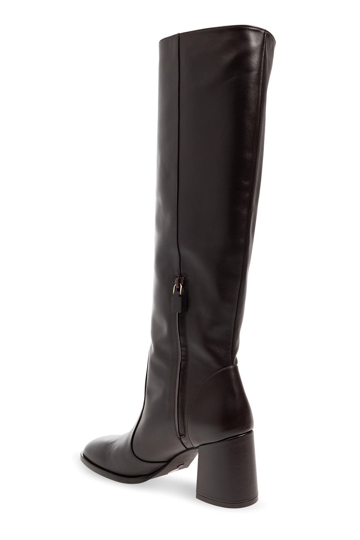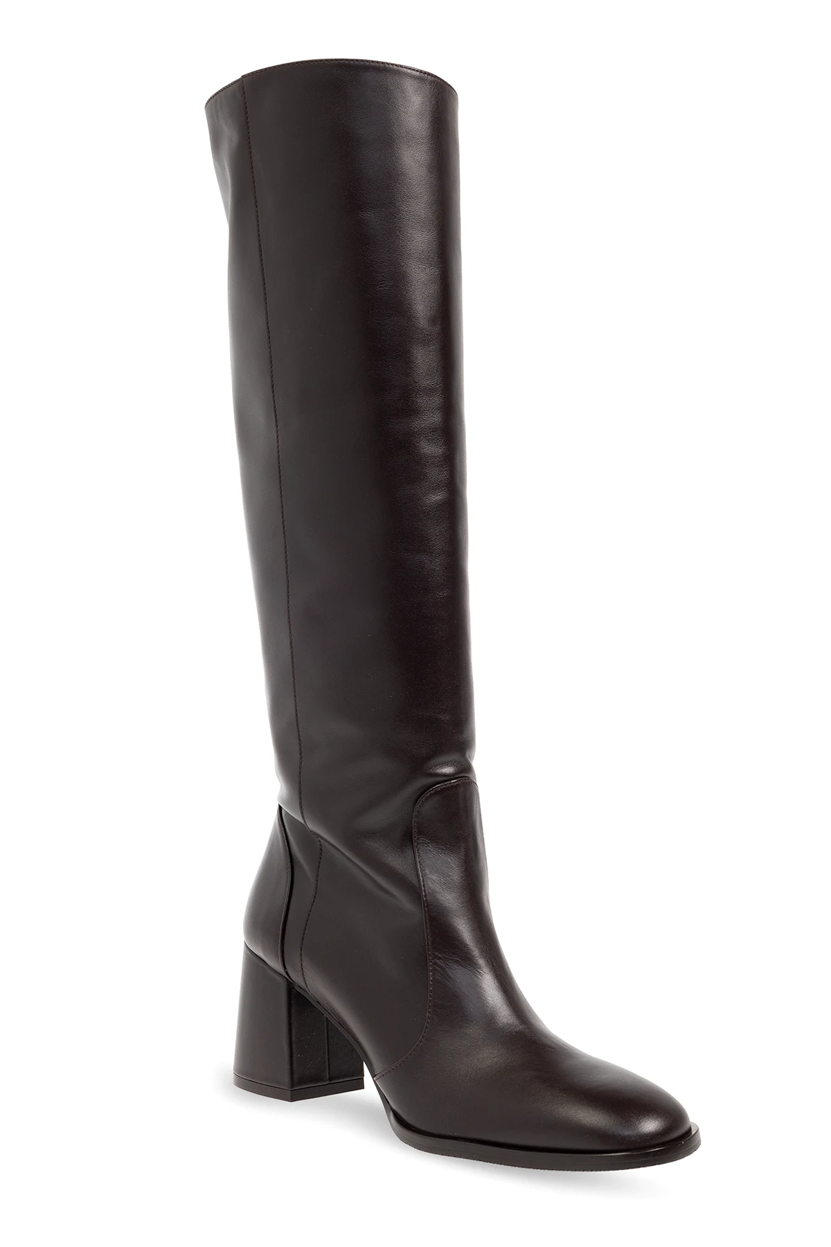 Ciemnobrązowe kozaki na obcasie, model ‘Nola’ Stuart Weitzman. Wykonane ze skóry. Z boku zapinane na zamek. Ciemnobrązowa, gumowa podeszwa.