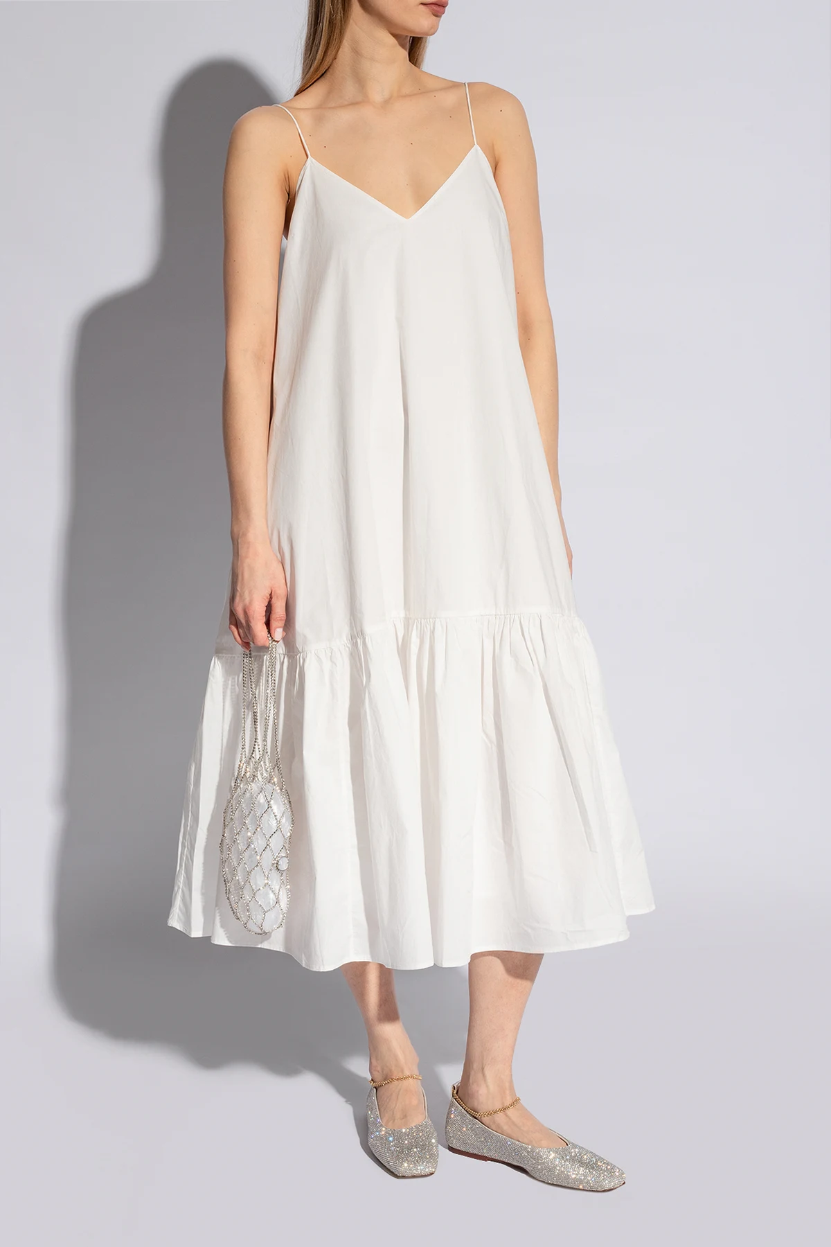 Luksusowe detale, takie jak złoty łańcuszek na pięcie, dodające wyrafinowania.