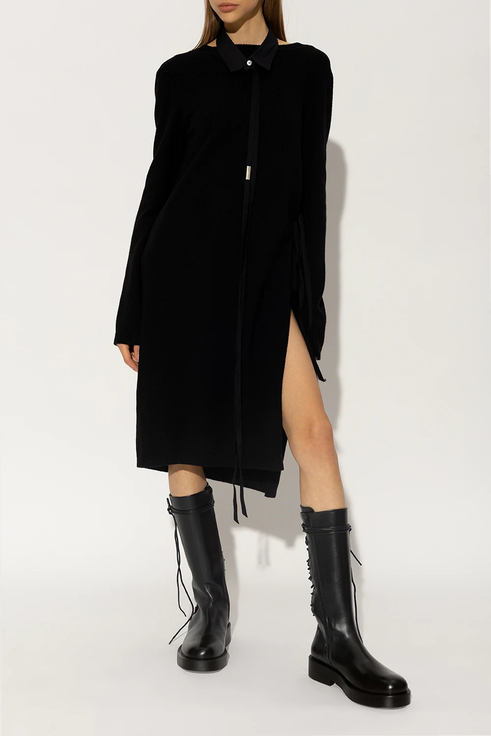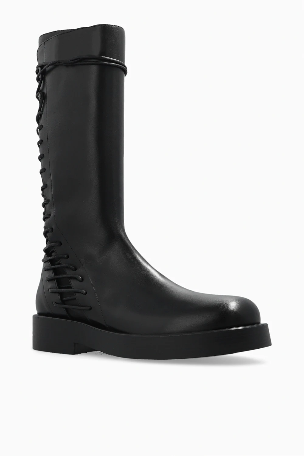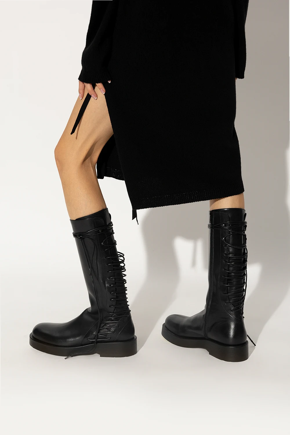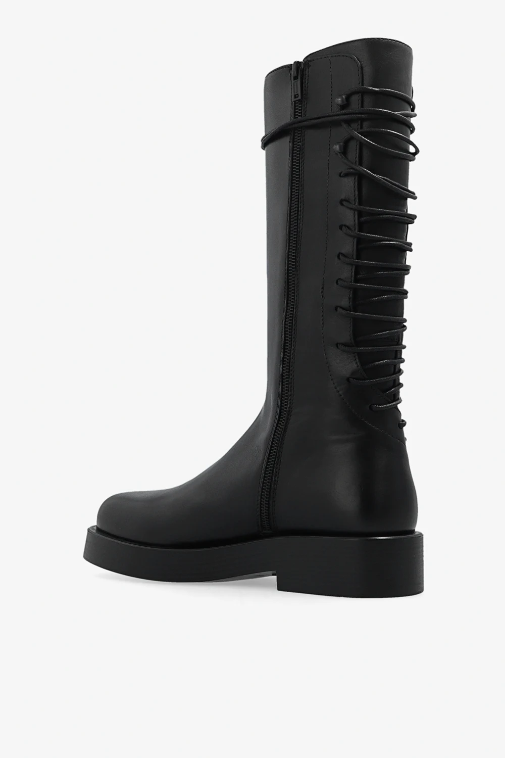 Czarne, sznurowane kozaki, model ‘Louise’ Ann Demeulemeester. Wykonane ze skóry. Z boku zapinane na zamek. Czarna, gumowa podeszwa.