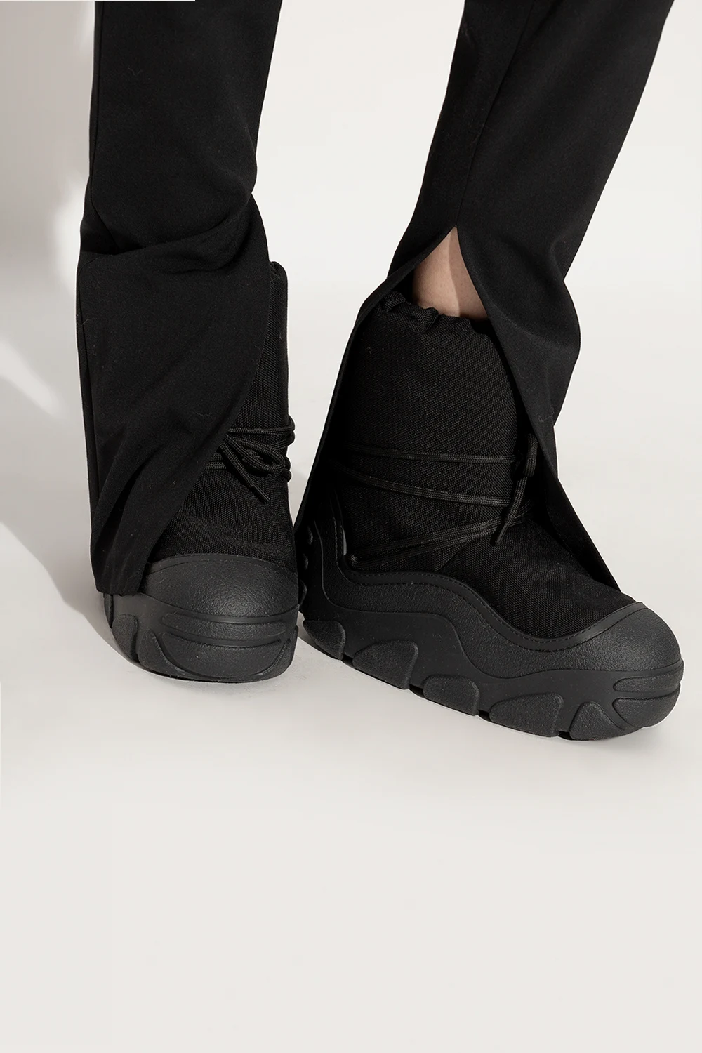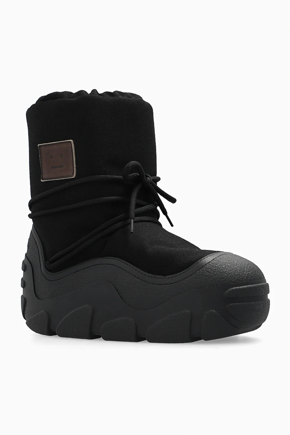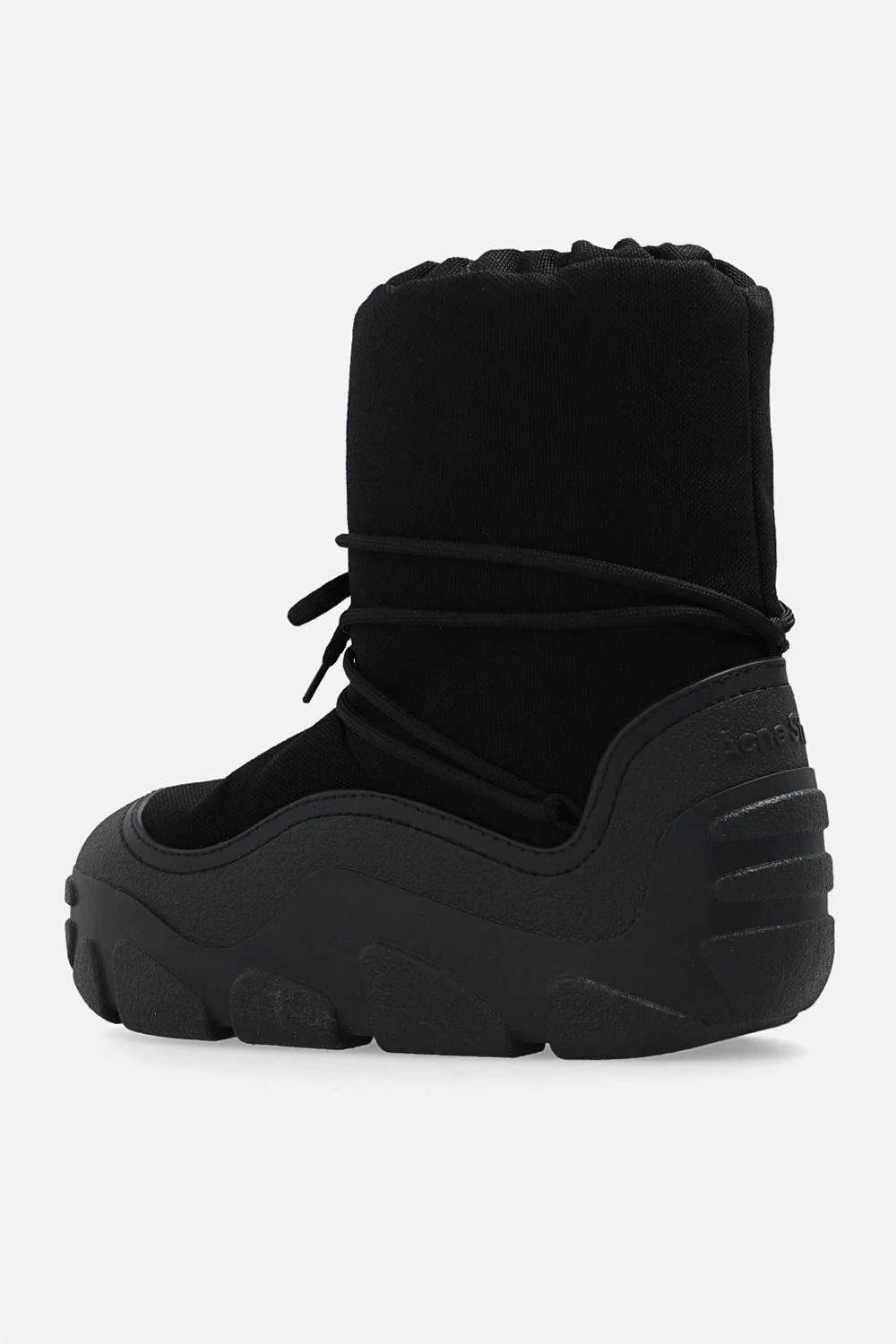 Czarne, sznurowane śniegowce Acne Studios. Ozdobione naszywką z logo. Czarna, gumowa podeszwa.