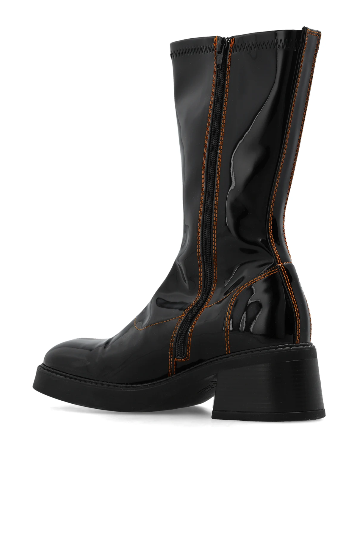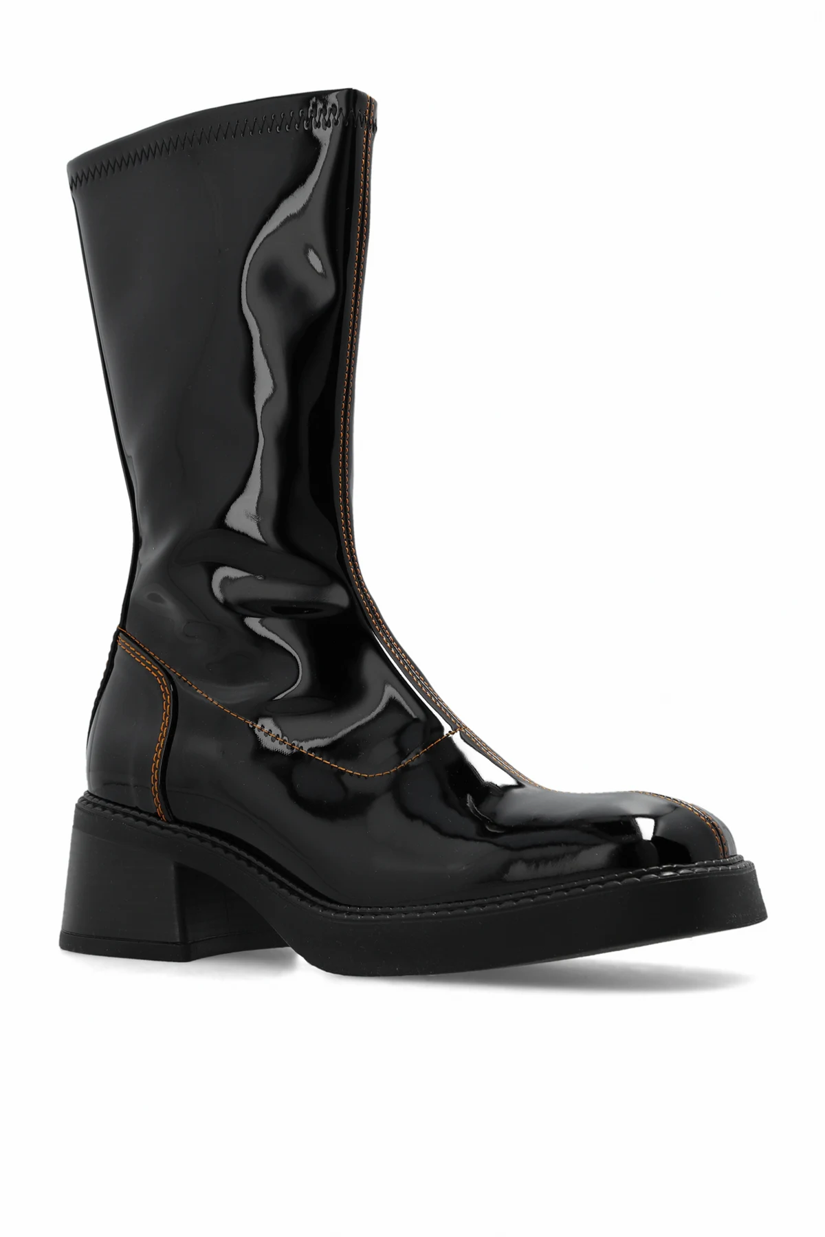 Czarne botki na obcasie, model ‘Vero’ Miista. Wykonane z lakierowanego materiału. Zapinane z boku na zamek. Ozdobione przeszyciami w kolorze pomarańczowym. Kwadratowy nosek. Podeszwa wykonana z gumy w kolorze czarnym.