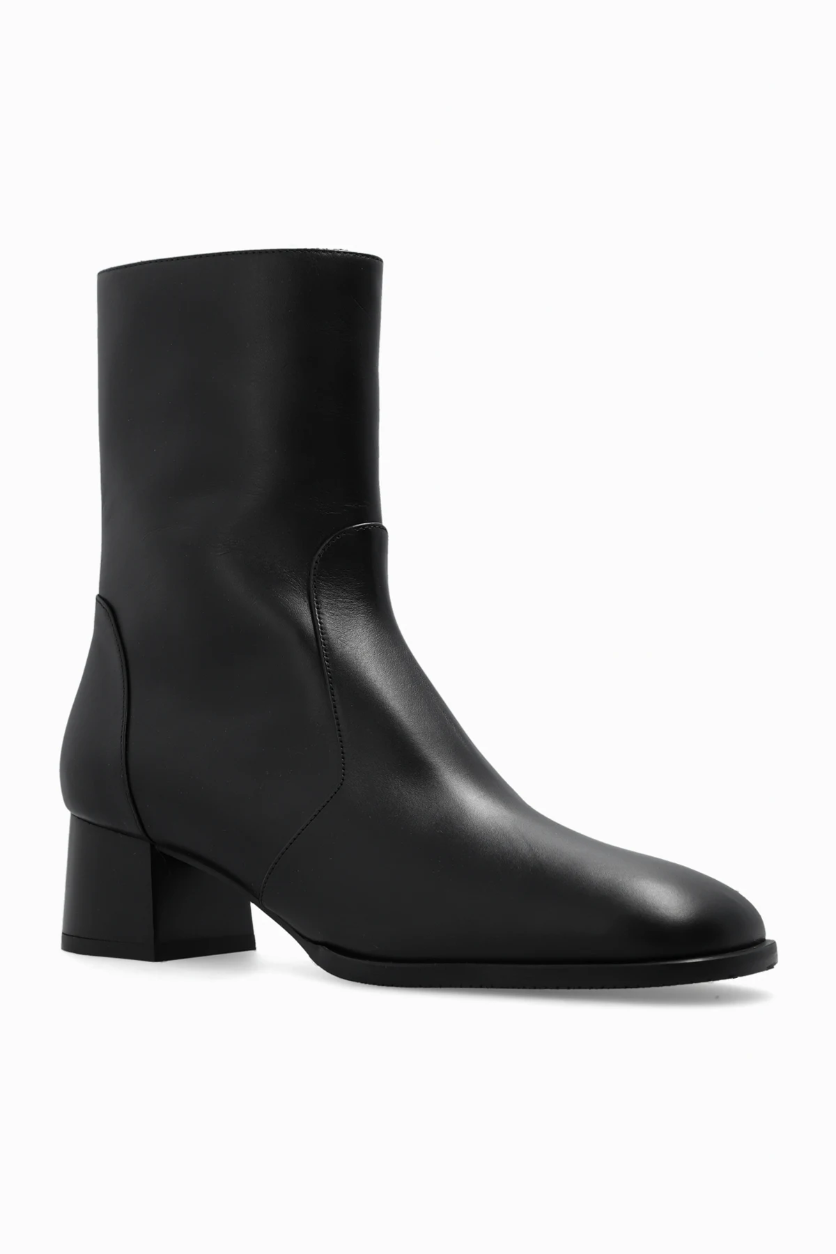 Czarne botki na obcasie, model ‘Nola’ Stuart Weitzman. Wykonane ze skóry. Z boku zapinane na guzik. Kwadratowy nosek. Czarna, gumowa podeszwa.