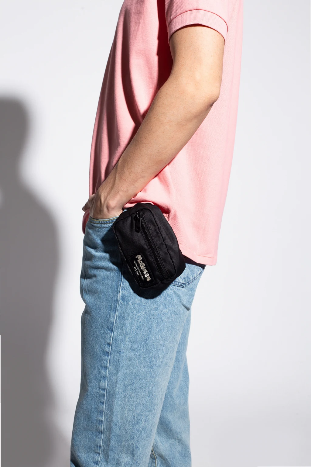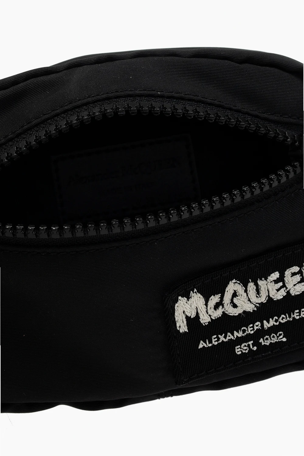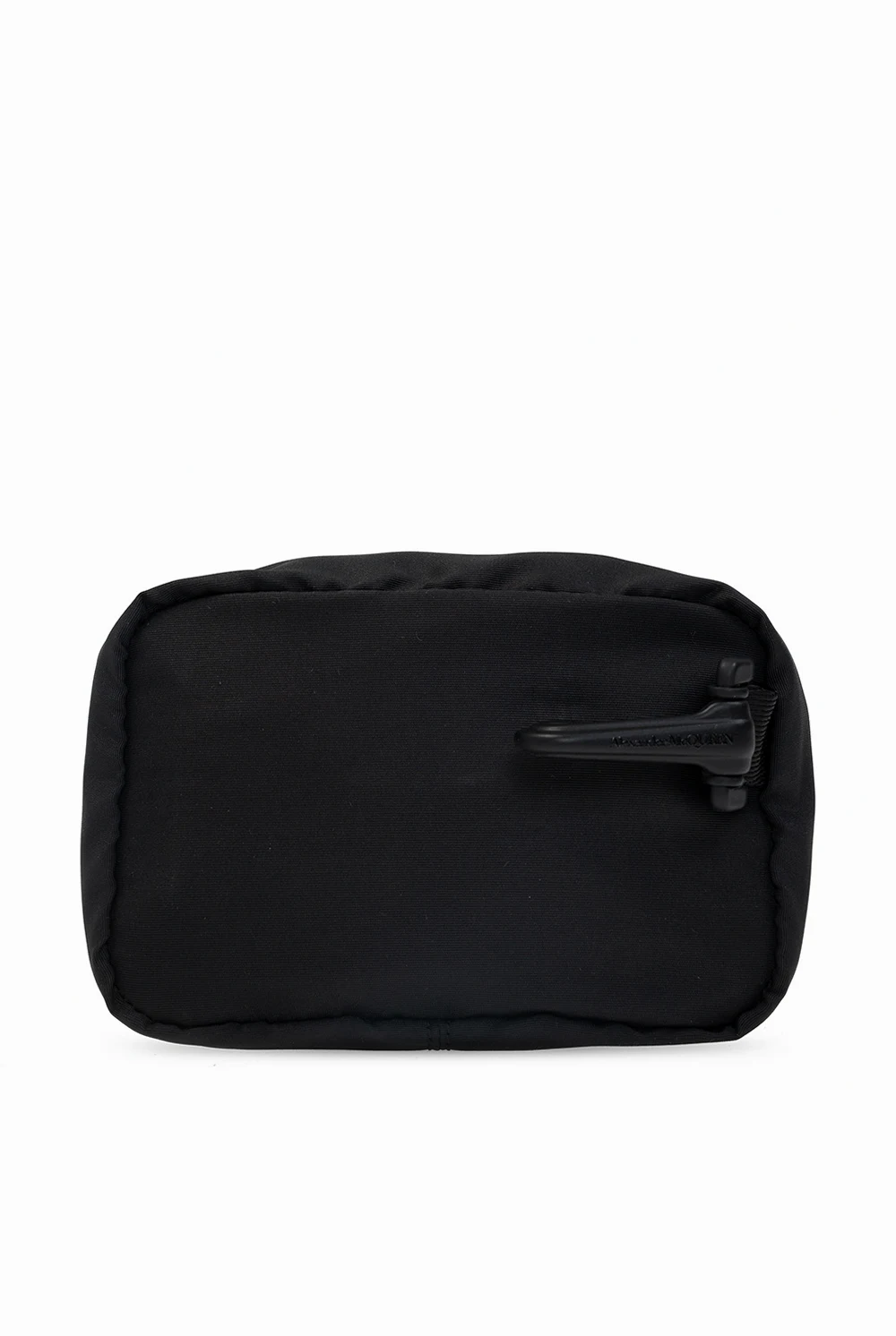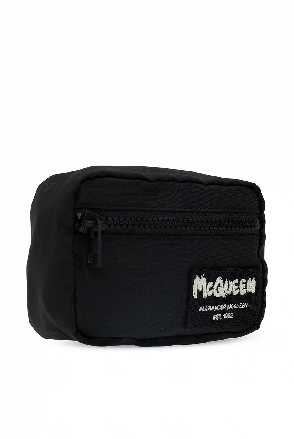 Czarna saszetka z karabińczykiem Alexander McQueen. Zapinana na zamek. Z przodu naszywka z wyszytym logo.