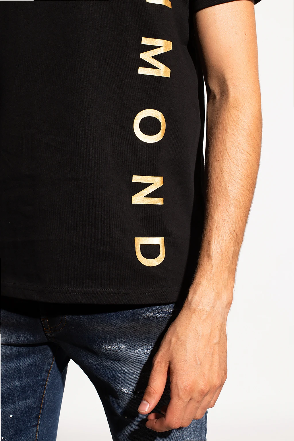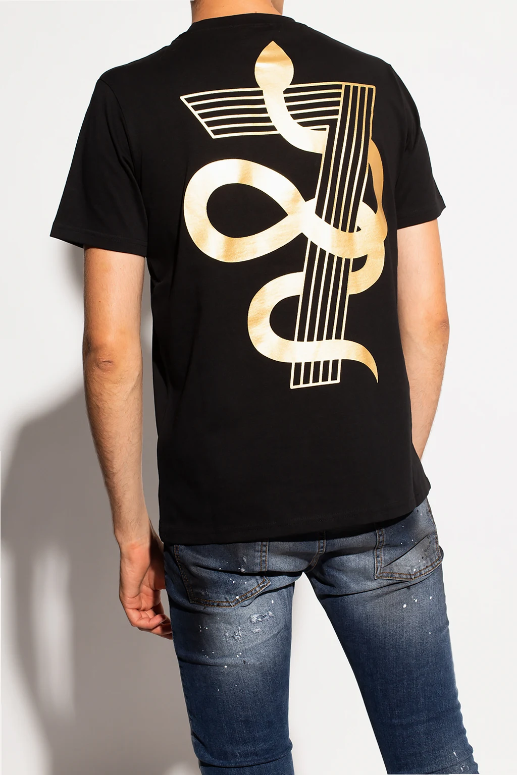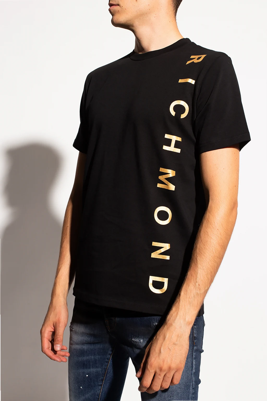 Czarny t-shirt John Richmond. Wykonany z bawełny. Ozdobiony wzorem z logo w kolorze złotym. Okrągły dekolt wykończony ściągaczem. Krótkie rękawy.