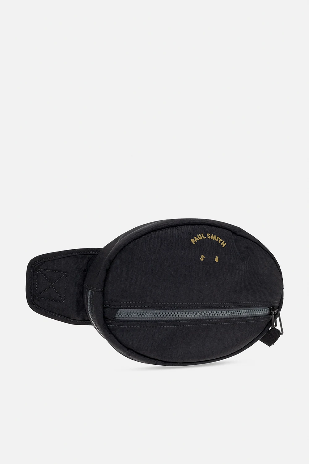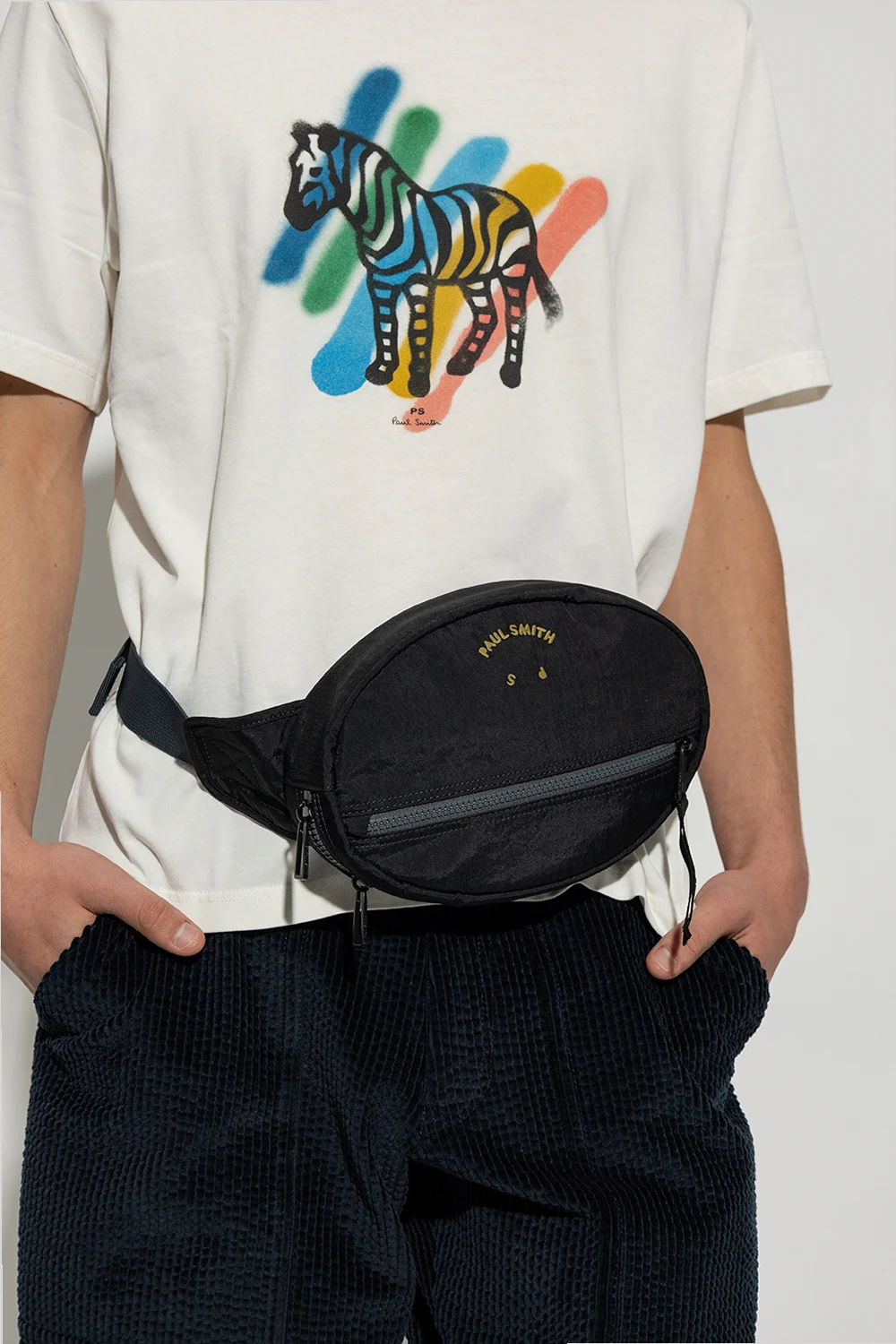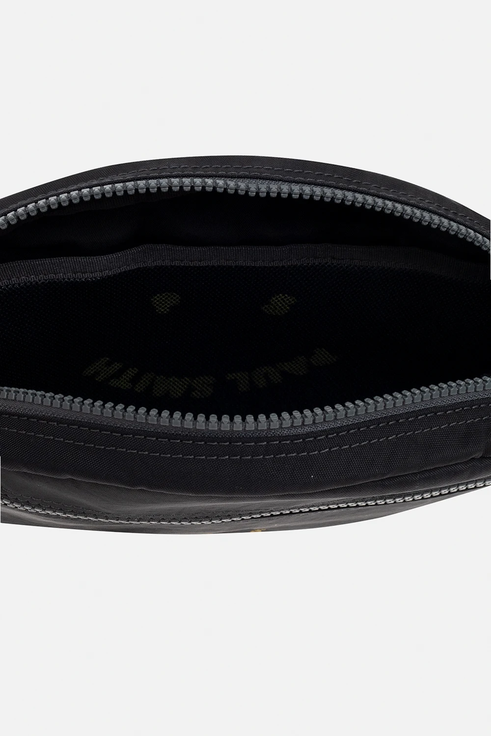 Czarno-szara torba na pas PS Paul Smith. Zapinana na dwubiegunowy zamek. Z przodu kieszeń zamykana na zamek i wyszyte beżowe logo. Z tyłu półokrągła rączka. Regulowany pas. Wewnątrz komora i wsuwana kieszeń.