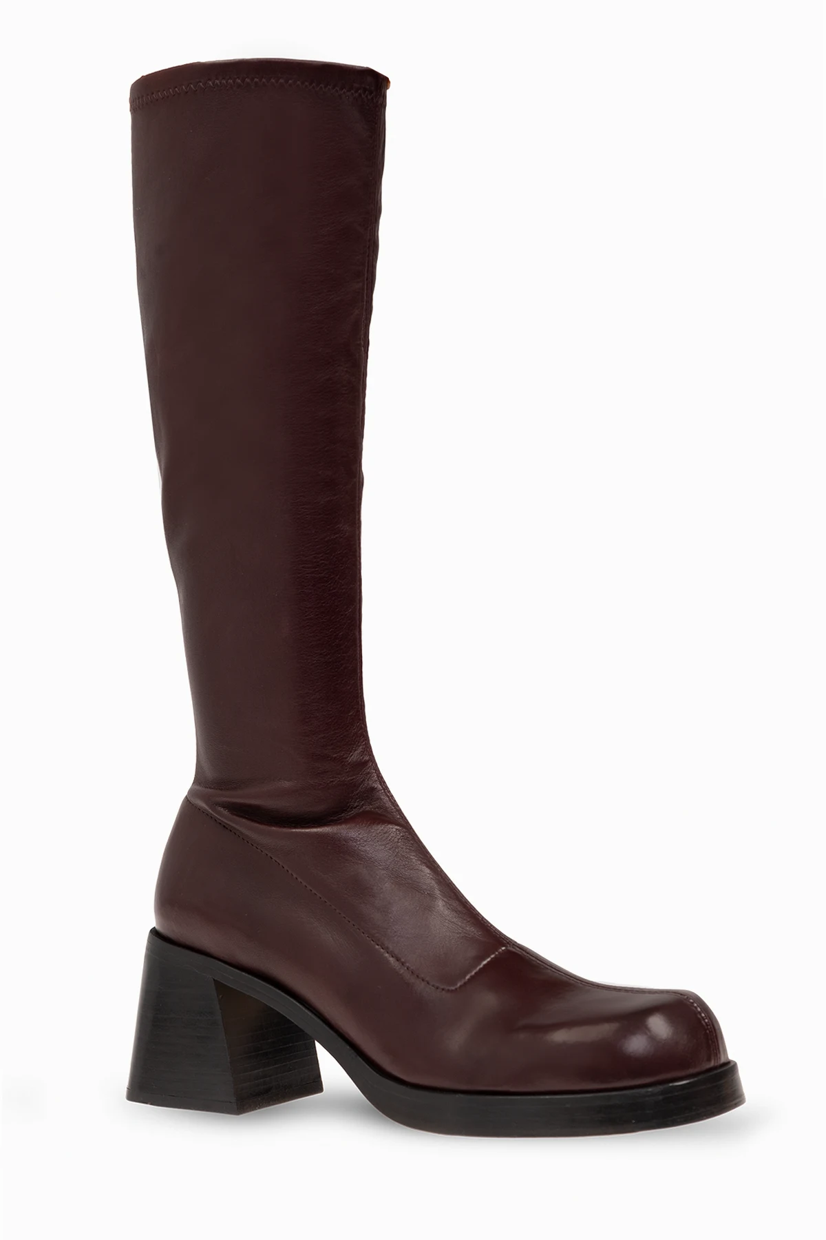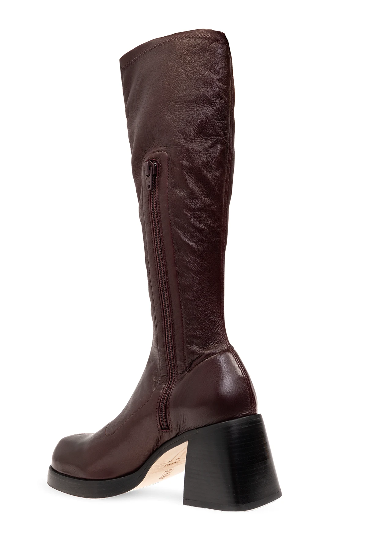 Bordowe kozaki, model ‘Hedy’ Miista. Wykonane ze skóry. Dekoracyjne przeszycia. Kwadratowy nosek z zaokrąglonym wykończeniem. Zapinane na boczny zamek. Słupkowy obcas. Kremowa, skórzana podeszwa.