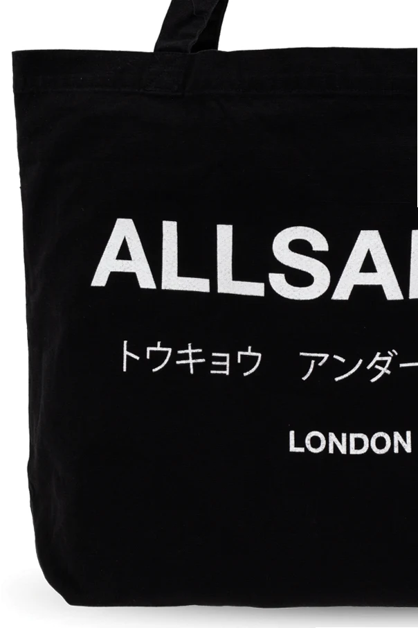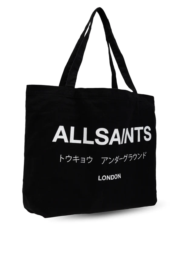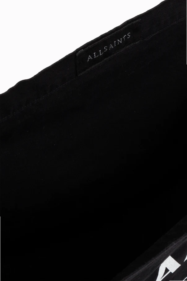 Torba wykonana z wysokiej jakości materiałów, w tym bawełny oraz bawełny organicznej, zachwyca minimalistycznym, prostokątnym kształtem i klasyczną czernią. Na przedniej stronie torby widnieje duże, białe logo „ALLSAINTS”, pod którym umieszczono napisy w języku japońskim oraz słowo „LONDON”. Wewnętrzna metka z napisem „ALLSAINTS” podkreśla jej ekskluzywny charakter.