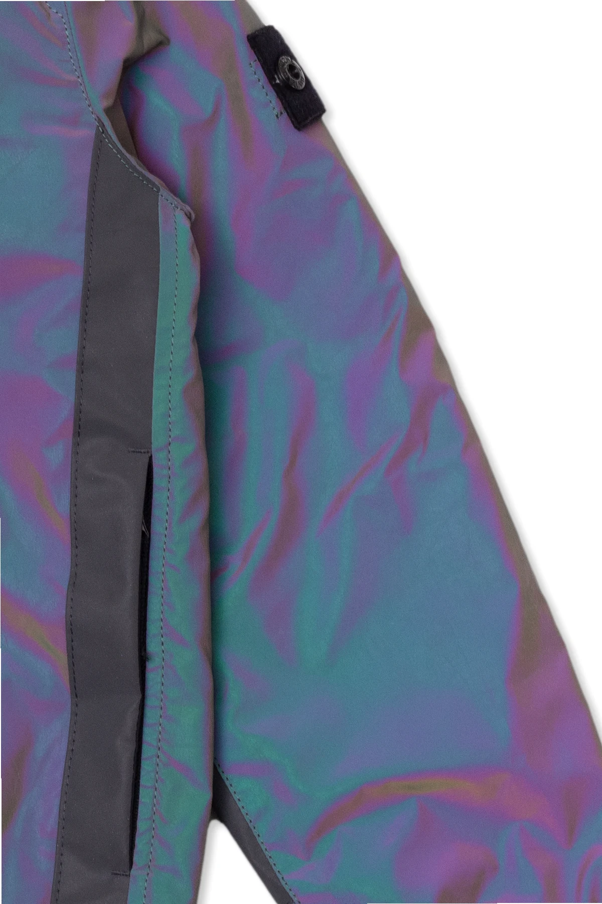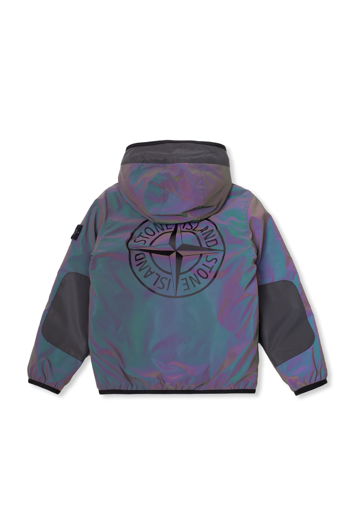 Kolorowa, odblaskowa kurtka Stone Island Kids. Zapinana na zamek. Ozdobiona czarno-białą naszywką. Dwie kieszenie z zamknięciem na zamek. Z tyłu nadruk. Wykończona lamówką.