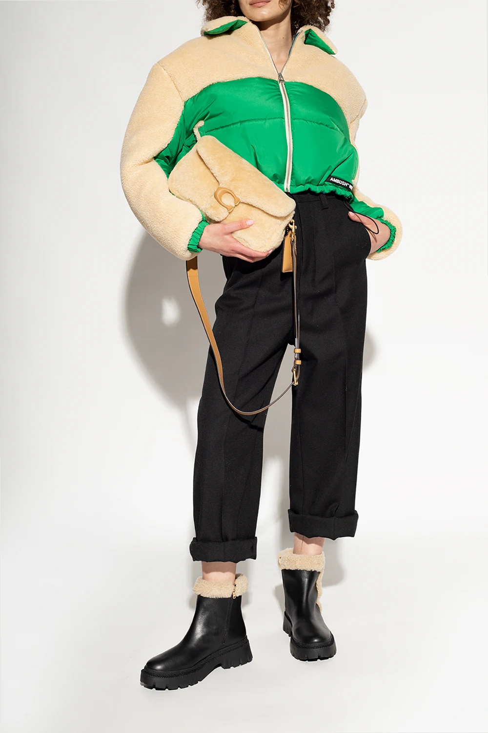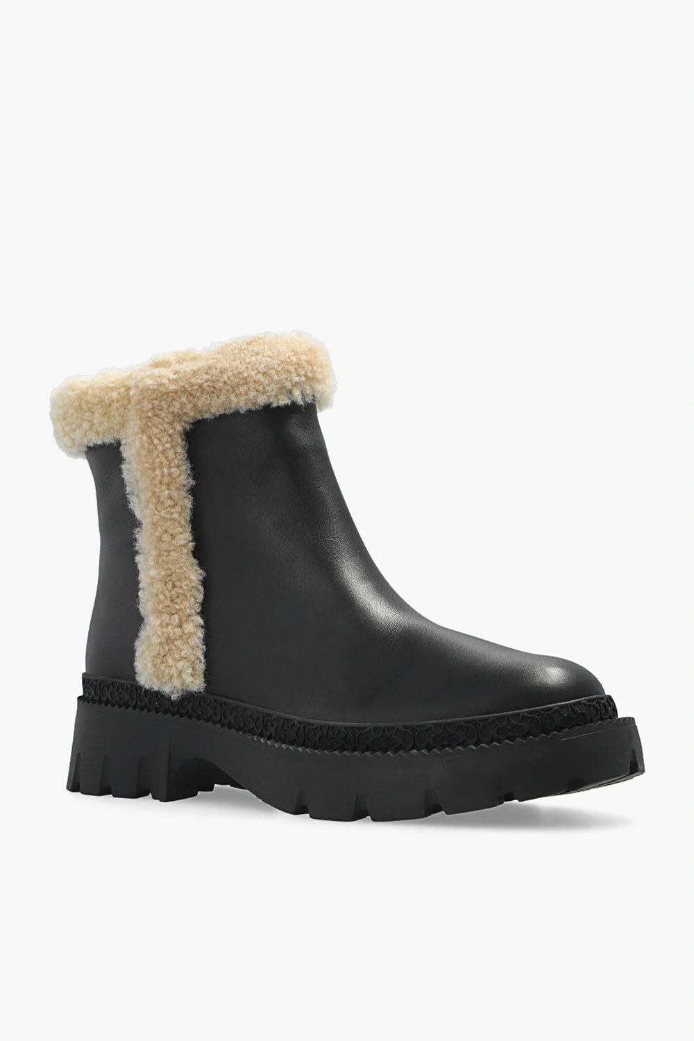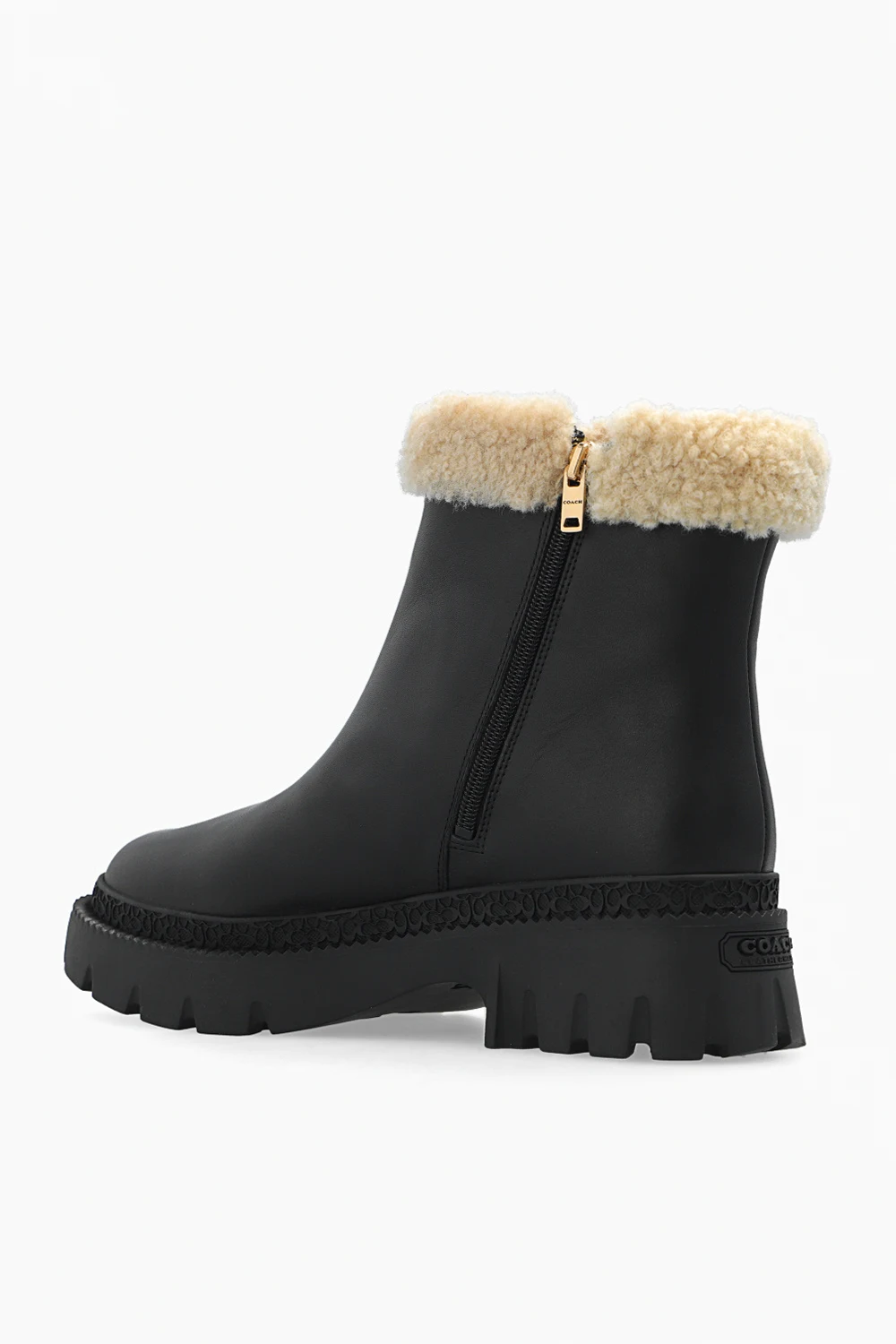 Czarne, skórzane botki, model ‘Jane’ Coach. Zapinane z boku na zamek. Wykończone kremowym futrem. Czarna, gumowa podeszwa ozdobiona logo.