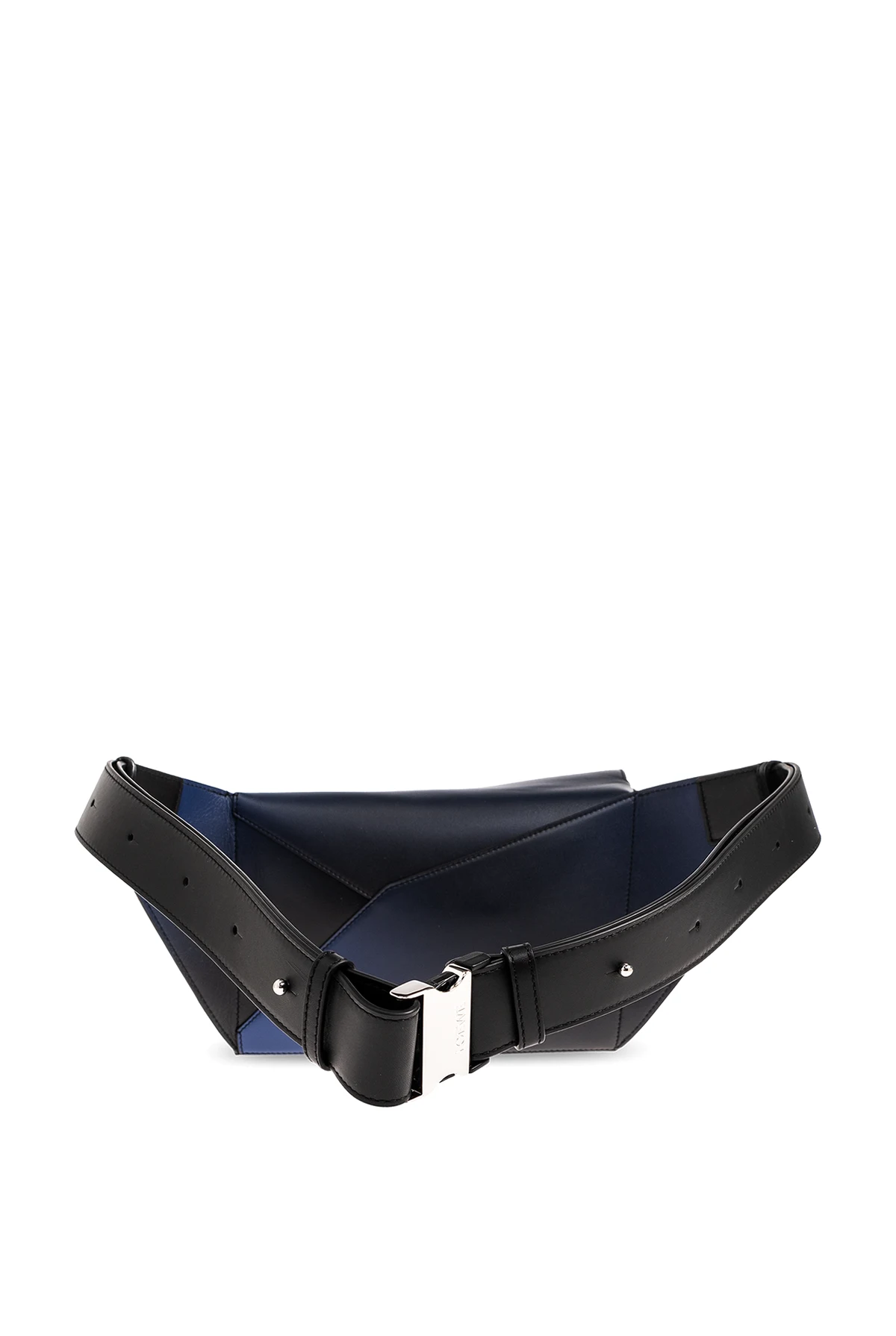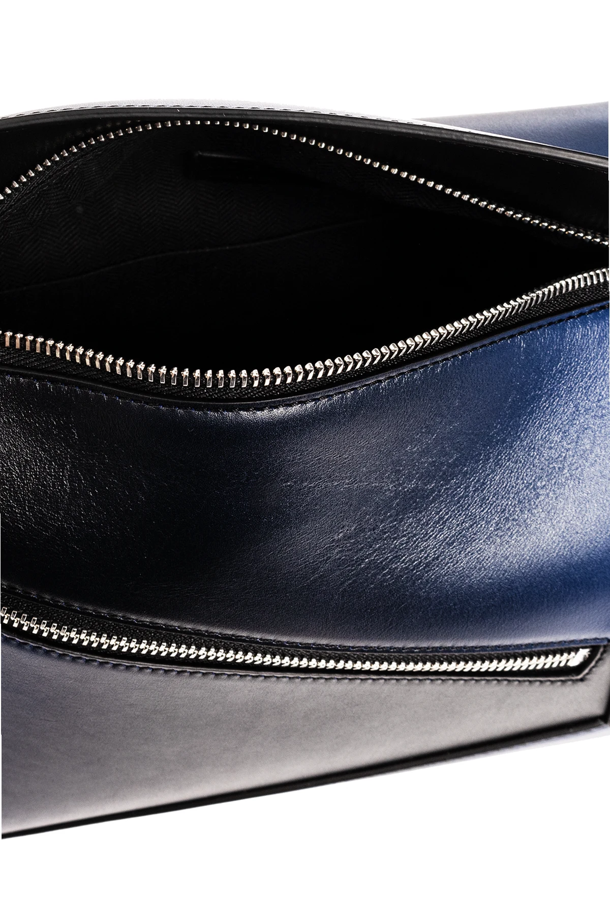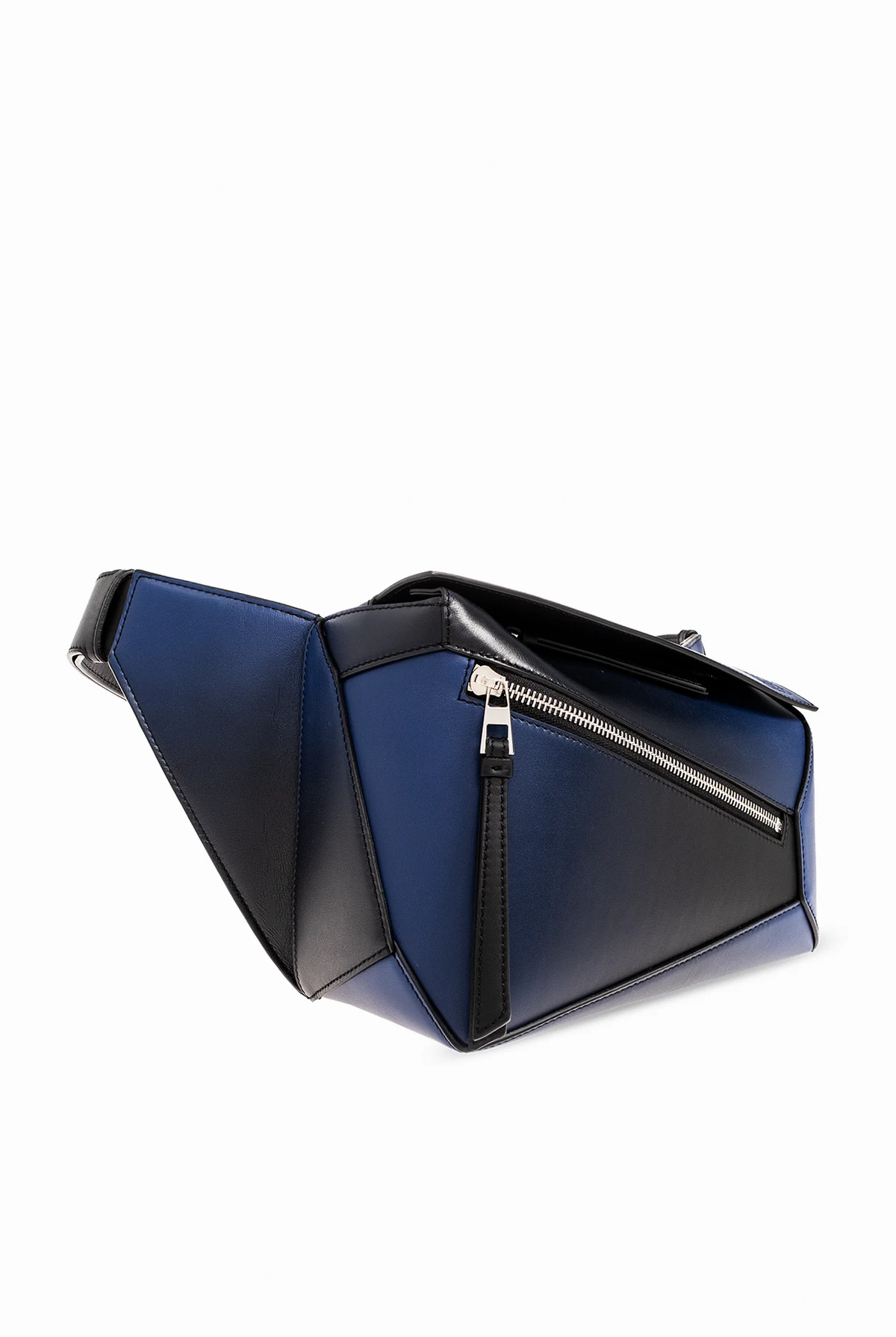 Granatowo-czarna, gradientowa torba na pas, model ‘Puzzle Edge’ Loewe. Wykonana ze skóry cielęcej. Zamykana na zamek. Ozdobiona asymetrycznymi naszywkami i wytłoczonym logo. Z przodu kieszeń zamykana na zamek. Regulowany pas na pas. Wewnątrz komora ze wsuwaną kieszenią. Metalowe wykończenie w kolorze srebrnym.