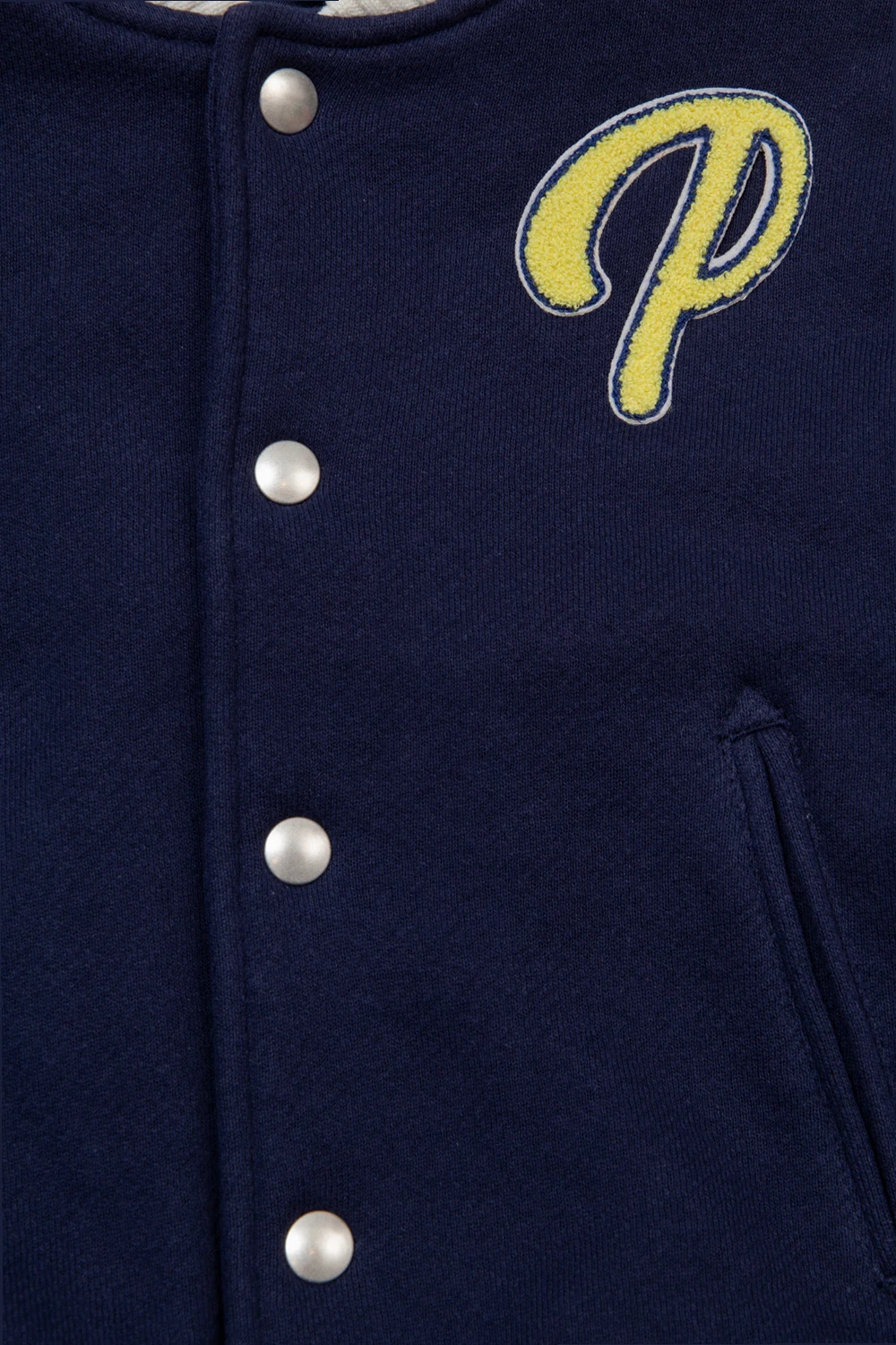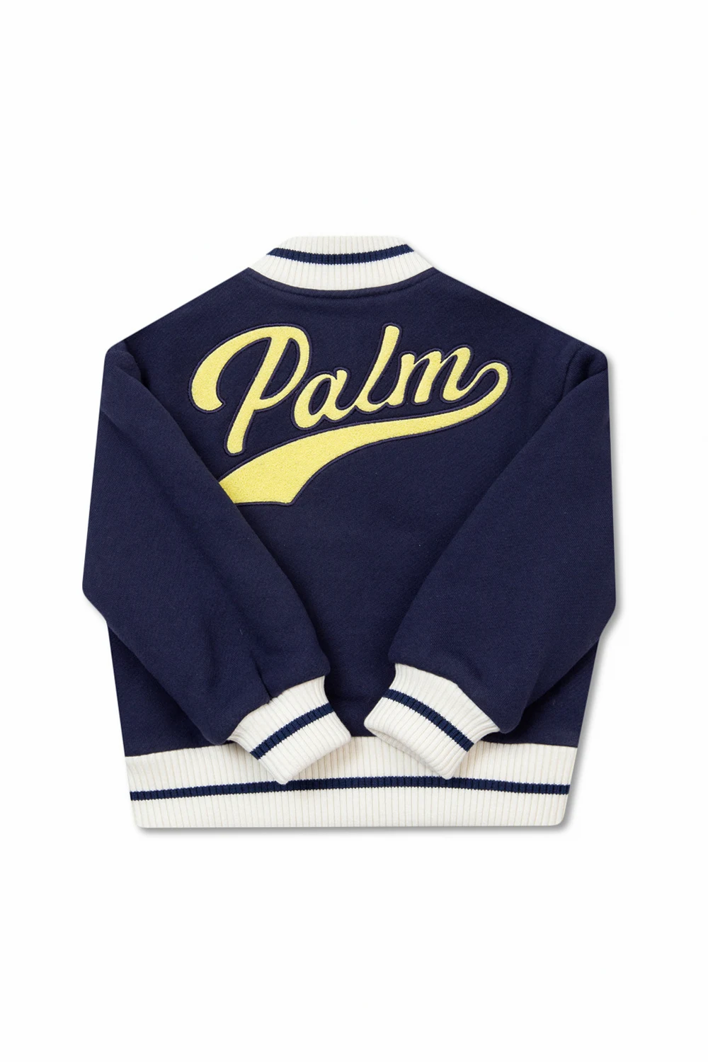 Granatowa, bawełniana kurtka typu ‘bomber’ Palm Angels Kids. Zapinana na zatrzaski. Ozdobiona naszytym żółtym logo. Z przodu dwie kieszenie. Kołnierz, długie rękawy i dół kurtki zakończone biało-granatowym ściągaczem.