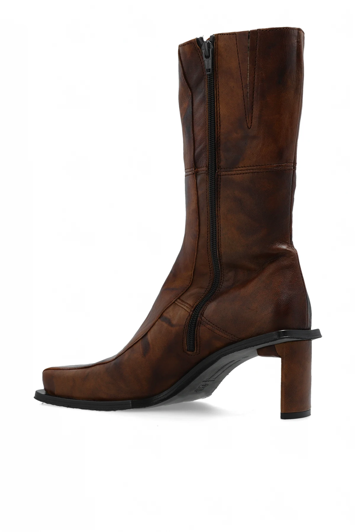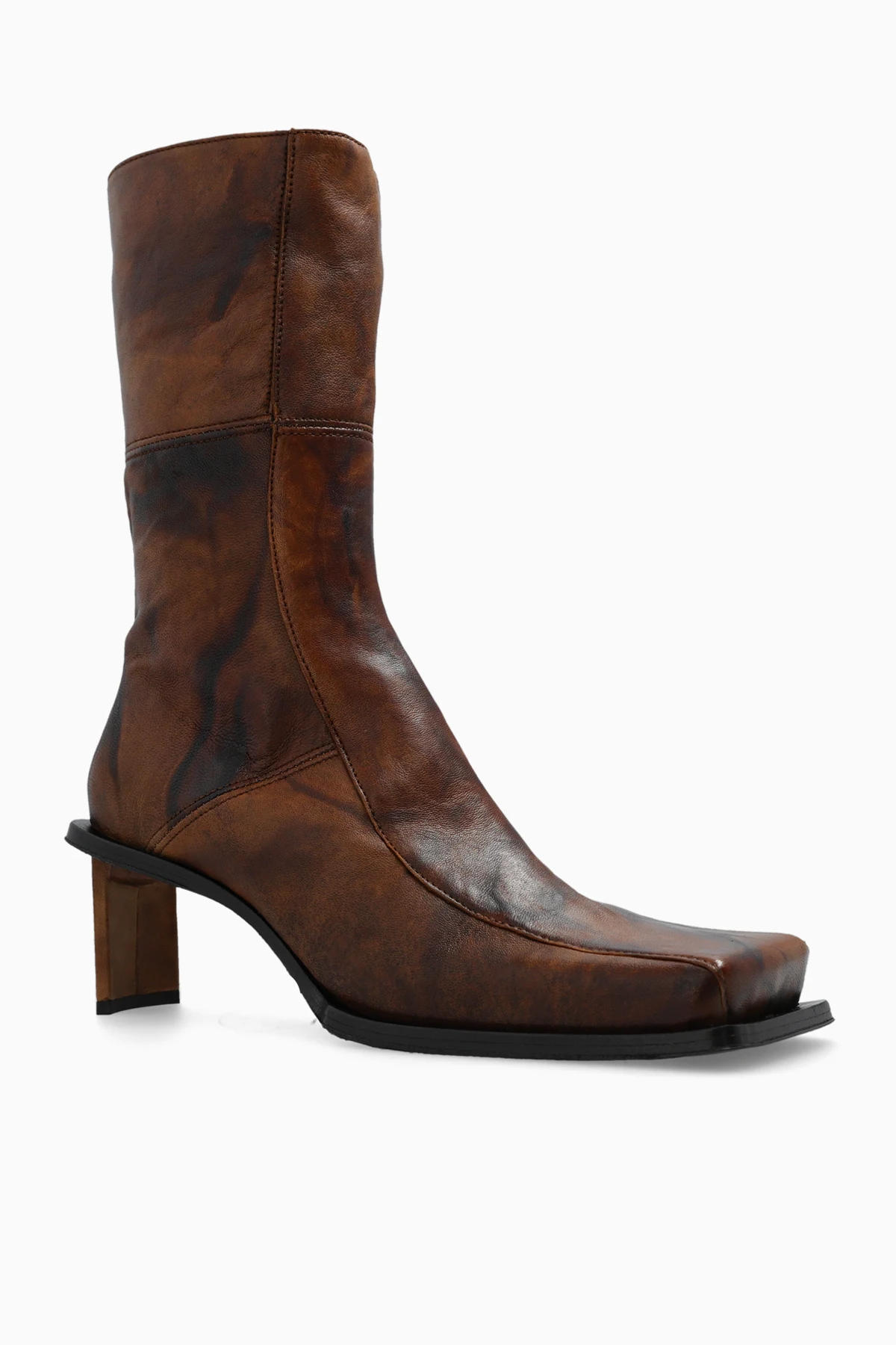 Brązowe botki na dekoracyjnym obcasie, model ‘Amparo’ Miista. Wykonane ze skóry. Z boku zapięcie na zamek. Ozdobione efektem ‘vintage’. Kwadratowy nosek. Czarna, gumowa podeszwa.