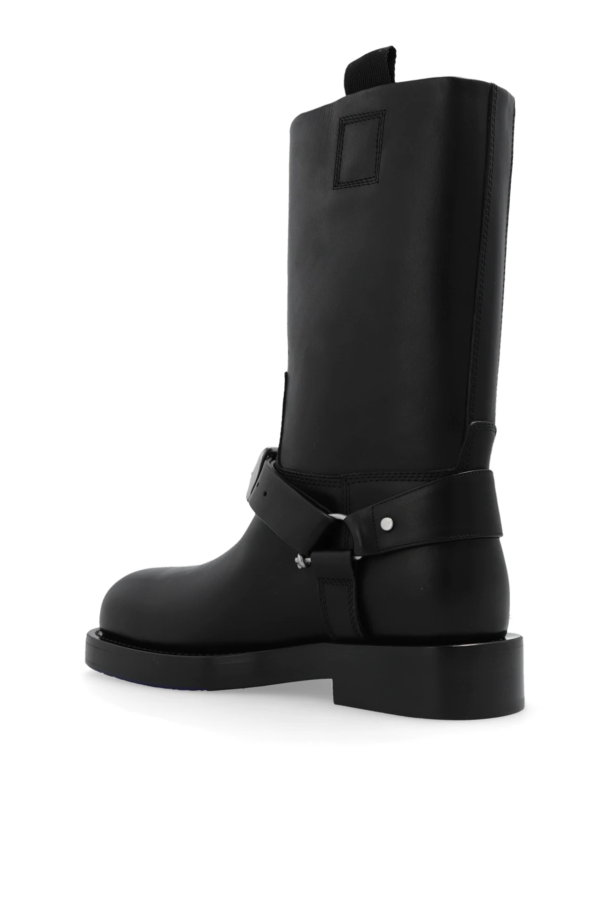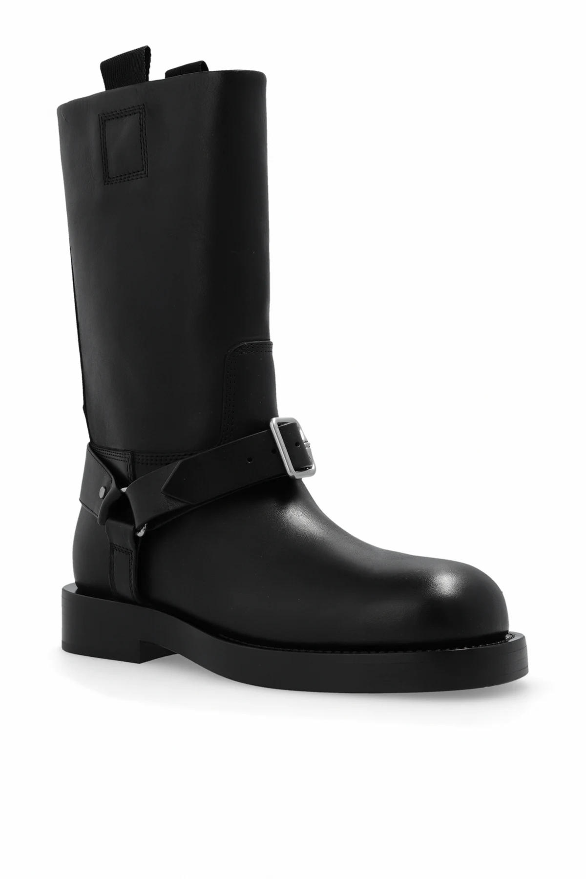 Czarne, wsuwane buty typu ‘biker’, model ‘Saddle’ Burberry. Wykonane ze skóry. Ozdobione dekoracyjnym paskiem z klamrą. Czarna podeszwa wykonana z powlekanej skóry.
