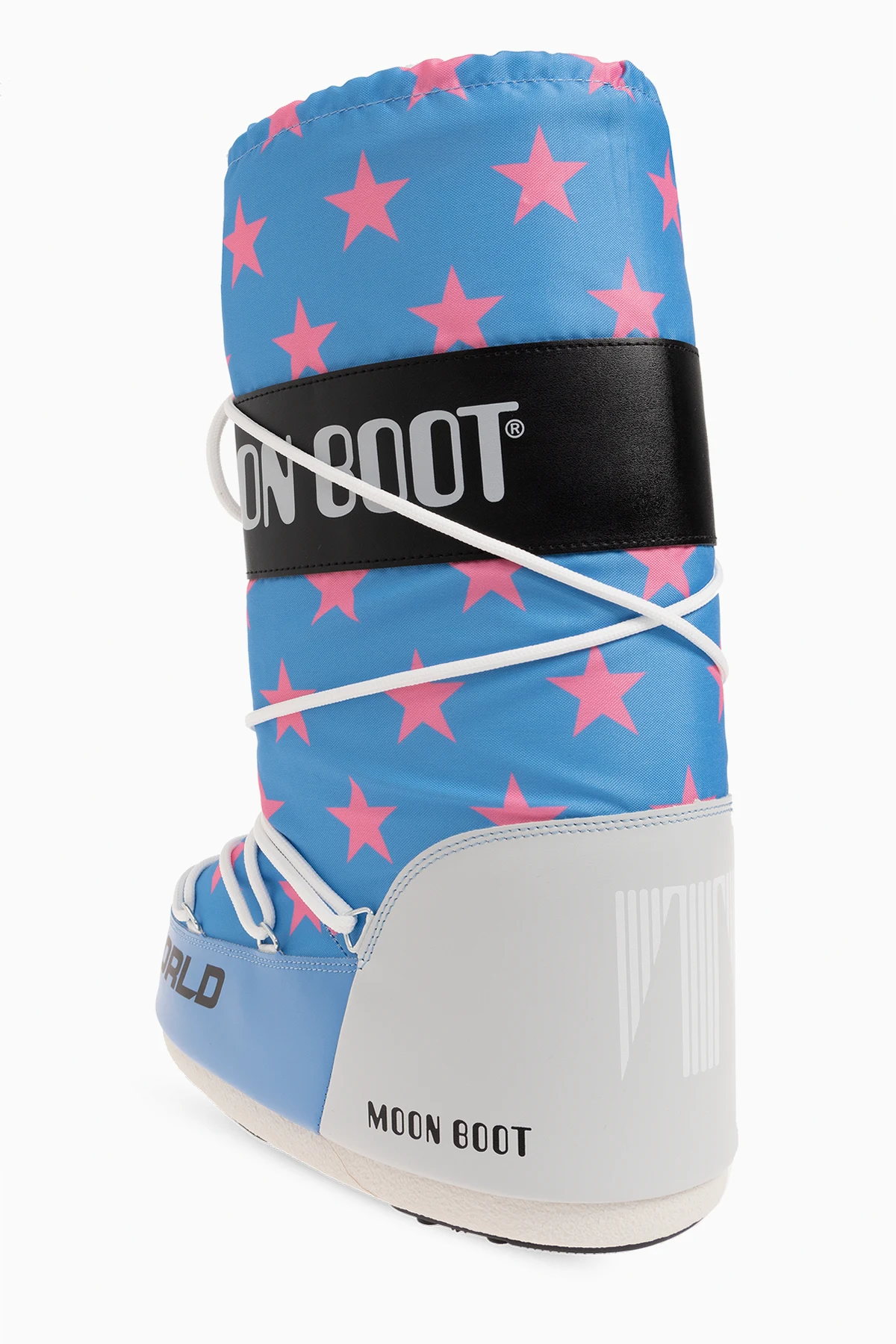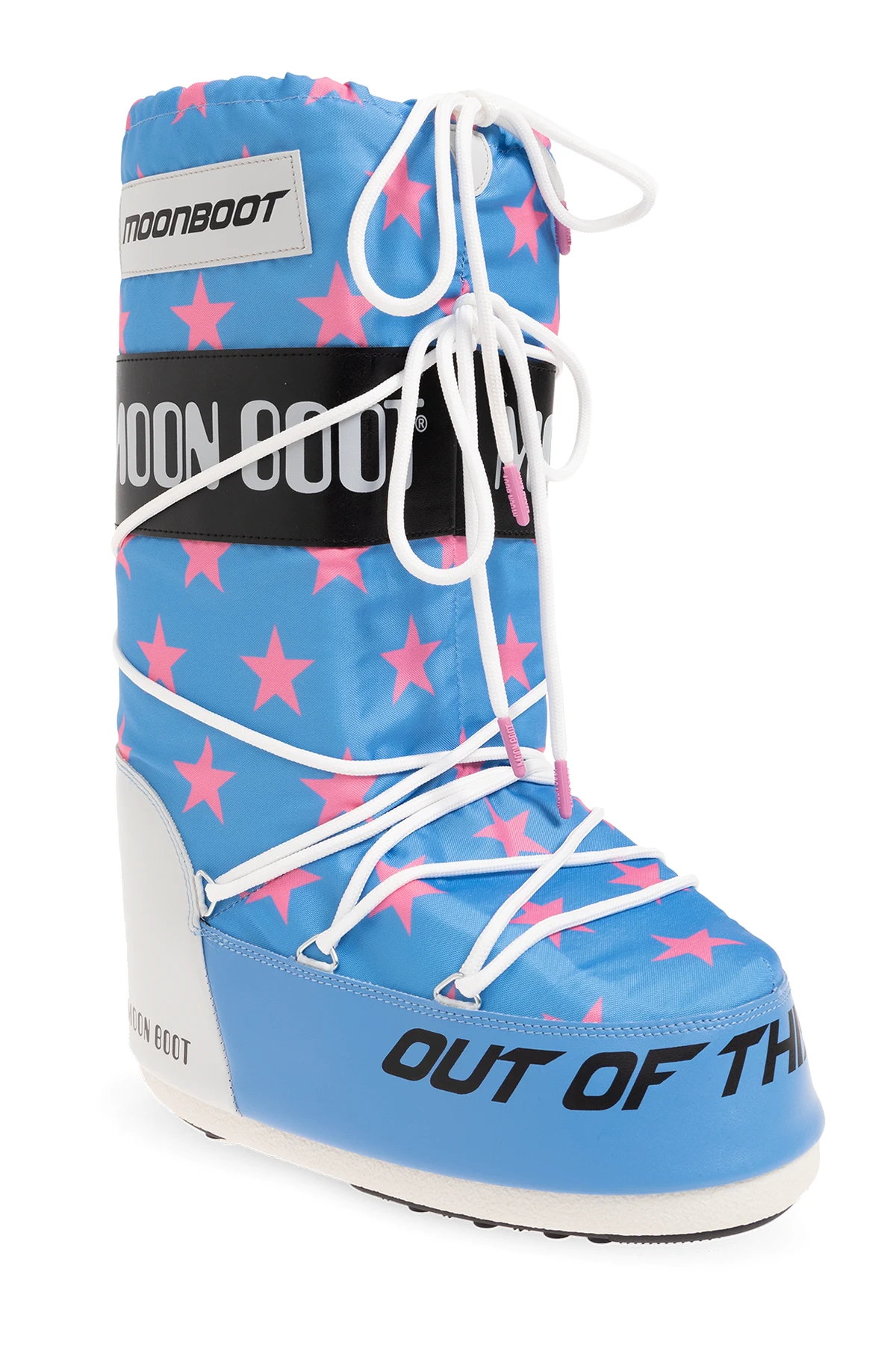 Niebieskie, sznurowane śniegowce, model ‘Icon Retrobiker’ Moon Boot. Wykonane z wodoodpornego materiału. Ozdobione różowym wzorem z motywem gwiazd i logo. Cholewka ściągana trokami. Szary zapiętek. Biała podeszwa z tworzywa wykończona bieżnikiem z gumy termoplastycznej w kolorze czarnym.