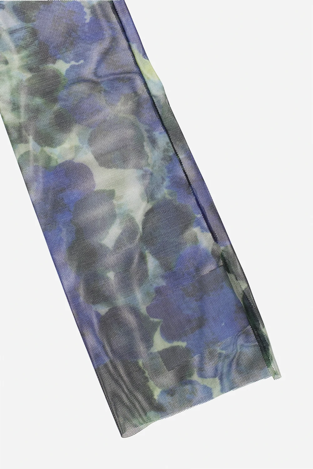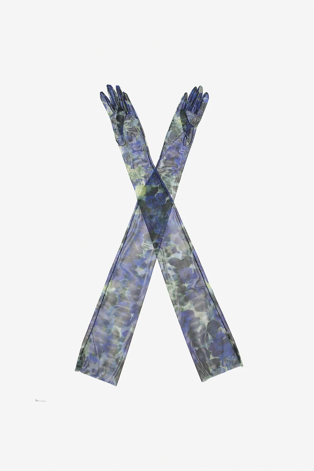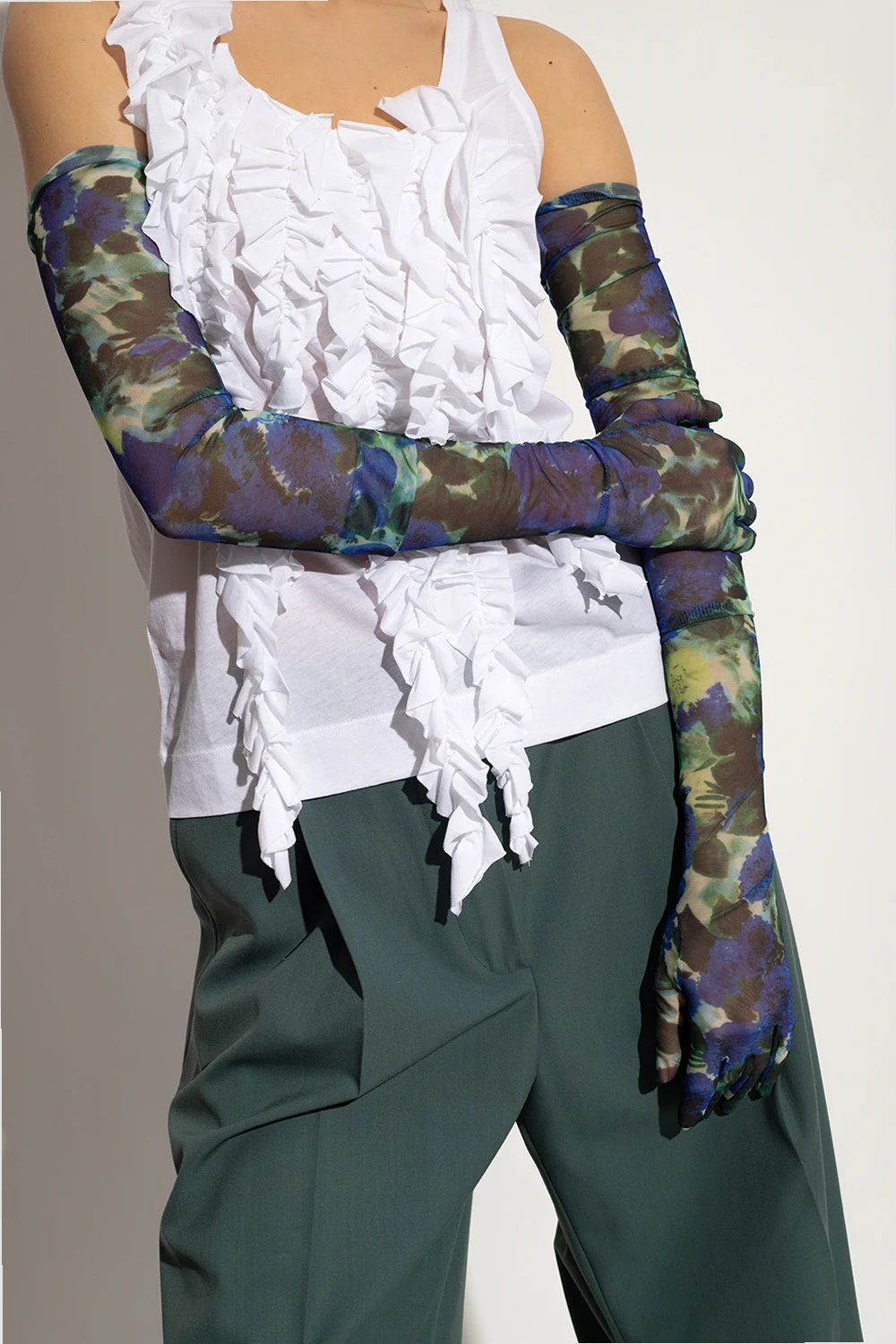 Niebiesko-zielone, długie rękawiczki Dries Van Noten. Wykonane z tiulu. Ozdobione wzorem z motywem kwiatowym.