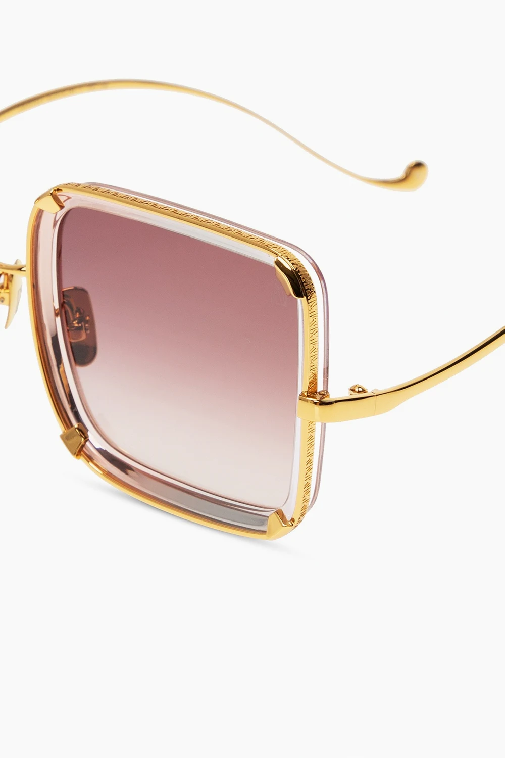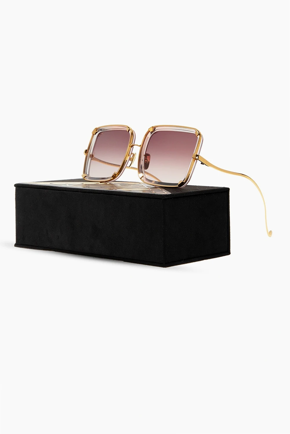 Okulary przeciwsłoneczne w kolorze złotym, model ‘White Moon’ Anna Karin Karlsson. Edycja limitowana. Oprawki wykonane ręcznie w Japonii oraz we Włoszech. Pozłacane 24-karatowym złotem. Wyposażone w różowe soczewki Carl ZEISS z powłoką lazurową. Dołączone etui. Indywidualny numer produktu na zausznikach.