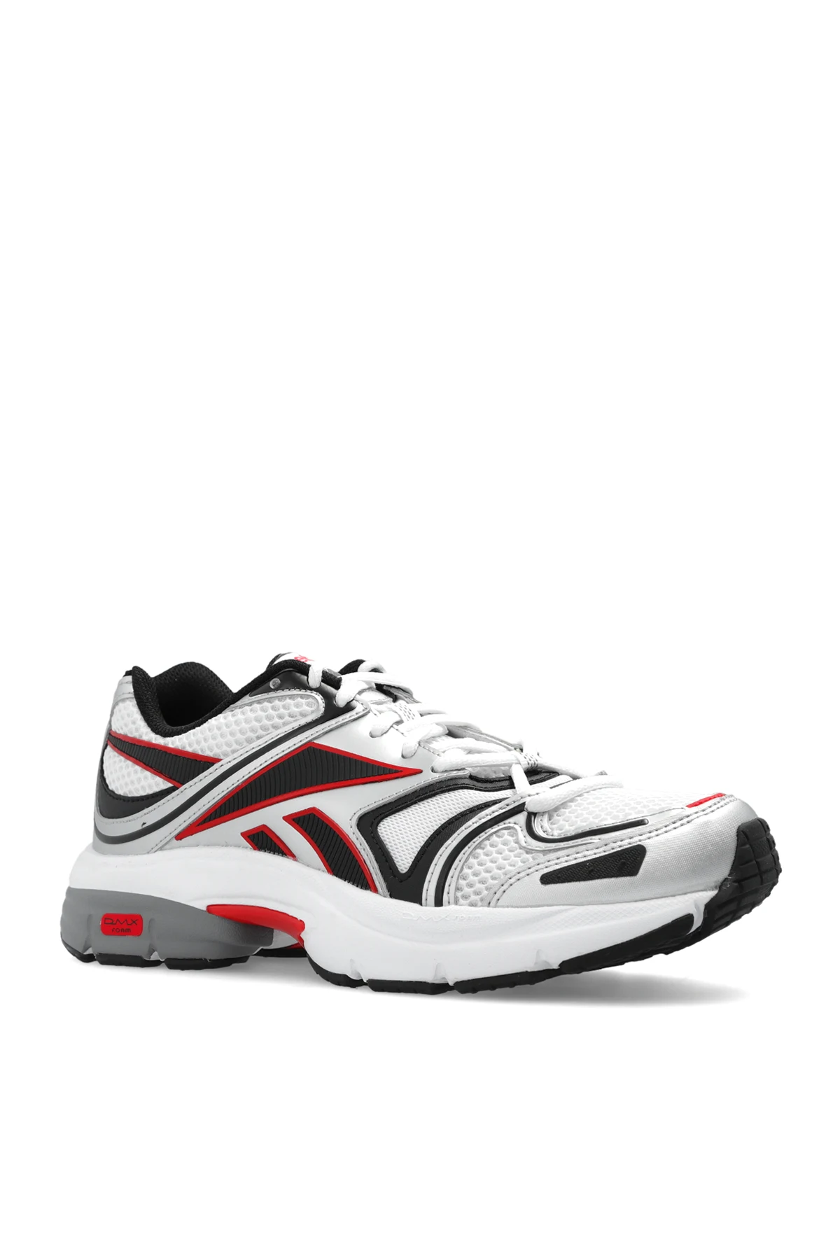 Sznurowane buty sportowe w kolorze srebrno-czarno-czerwonym, model ‘RBK PREMIER ROAD PLUS VI’ Reebok. Wykonane z materiału i syntetyku. Ozdobione charakterystycznymi przeszyciami oraz syntetycznymi wstawkami. Biało-czarno-czerwona, gumowa podeszwa.