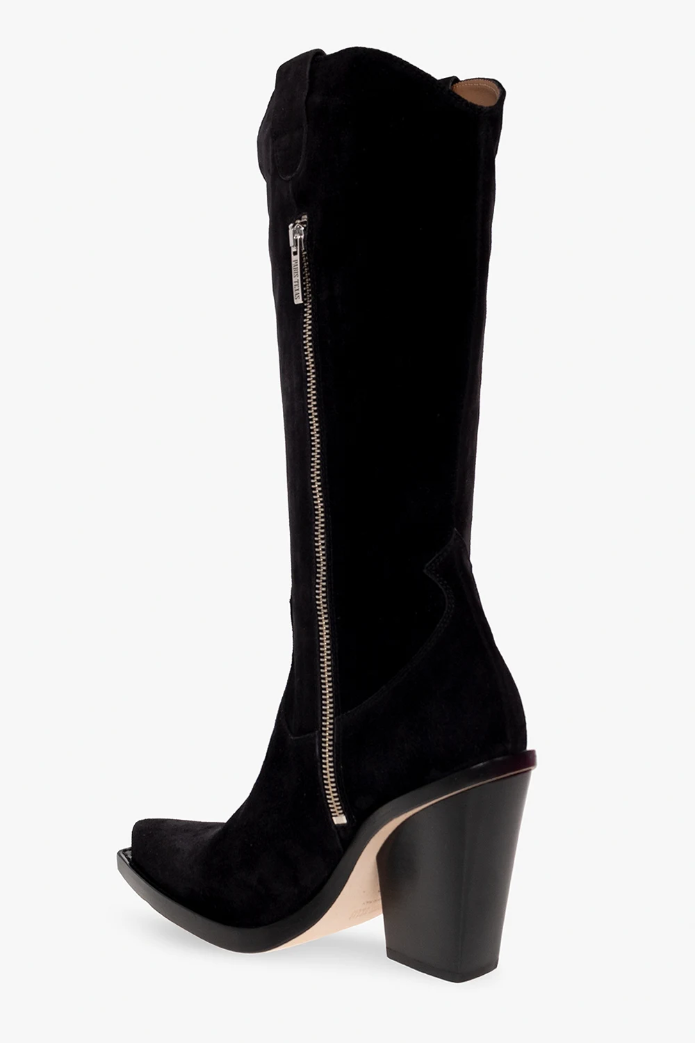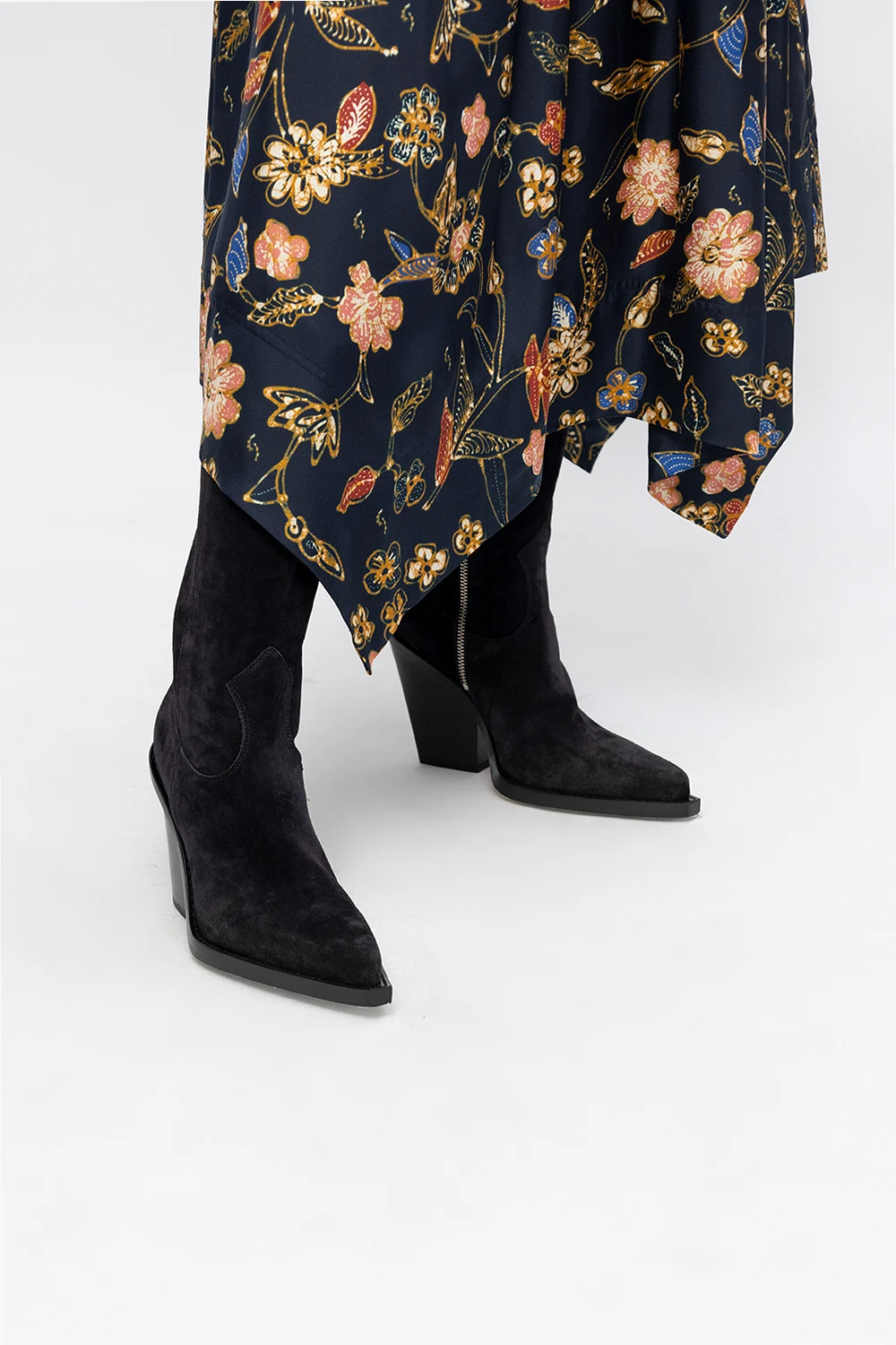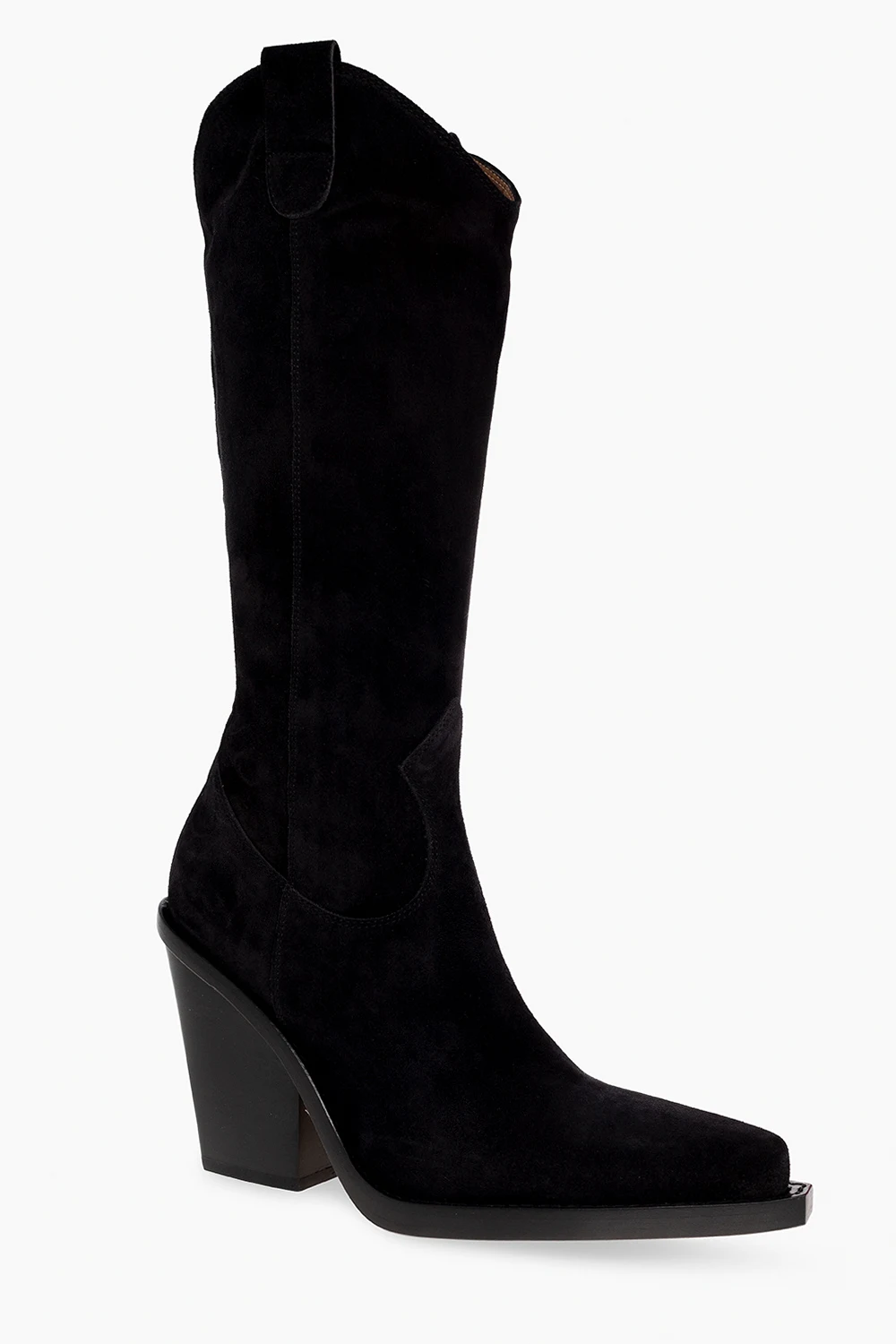 Czarne kozaki na obcasie, model ‘Vegas’ Paris Texas. Wykonane z zamszu. Z boku zapinane na zamek. Nosek w szpic. Beżowa, skórzana podeszwa.