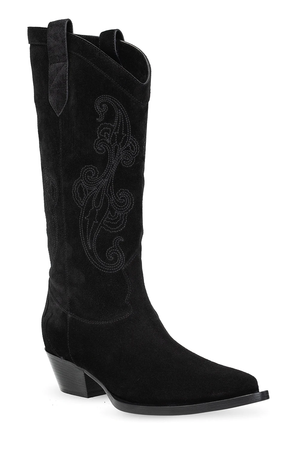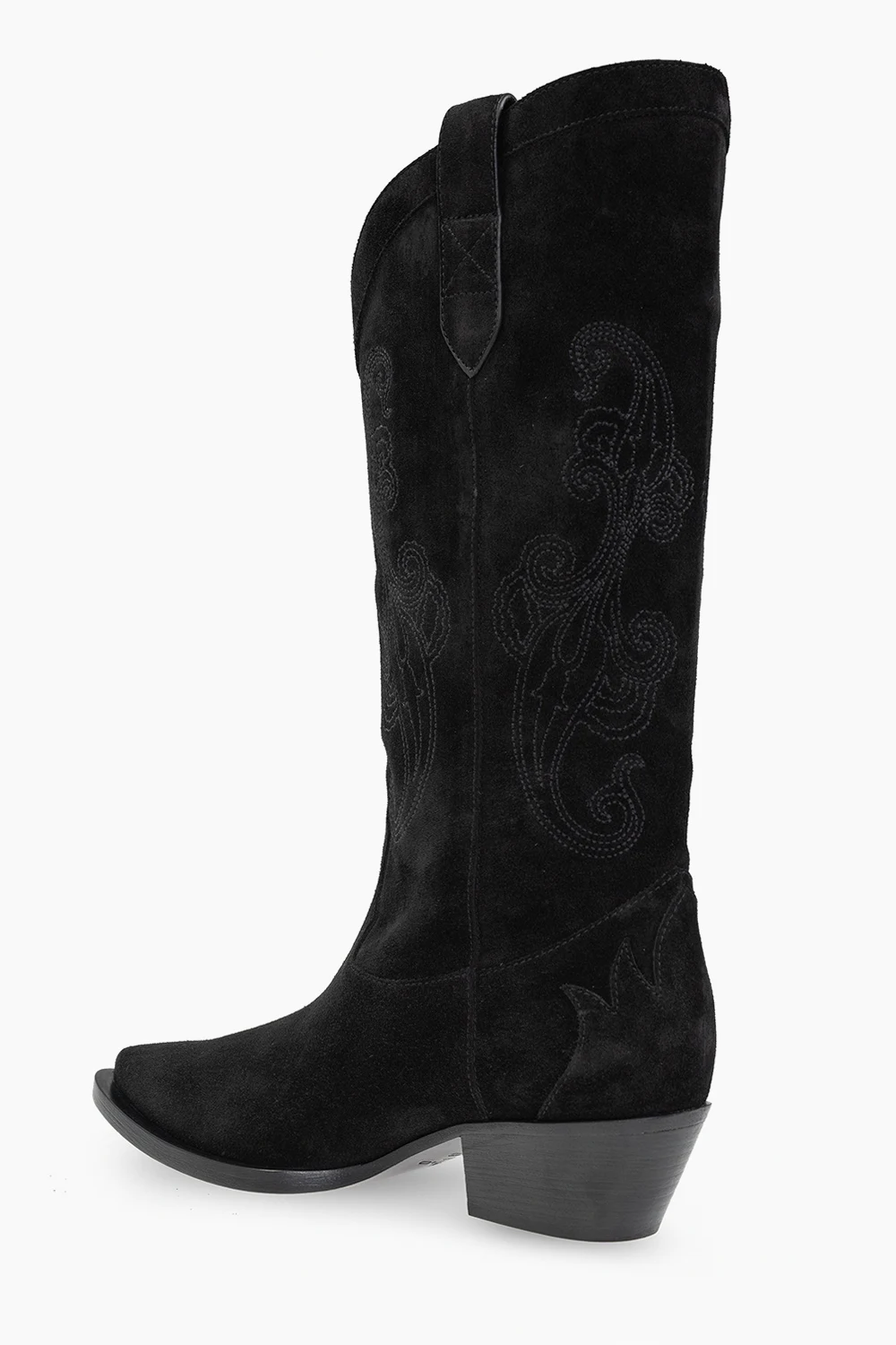 – Brązowe zamszowe botki z obcasem kubańskim i kowbojskim przeszyciem