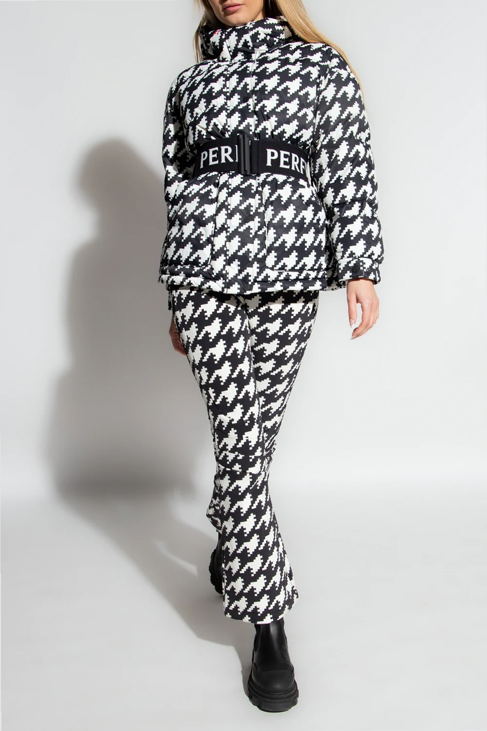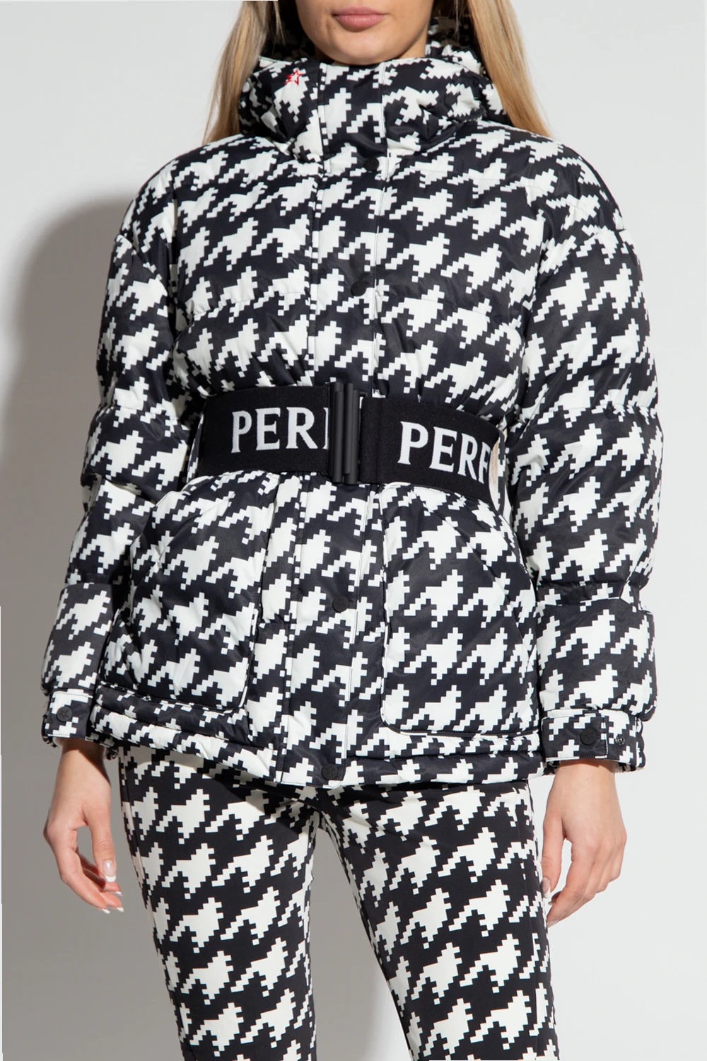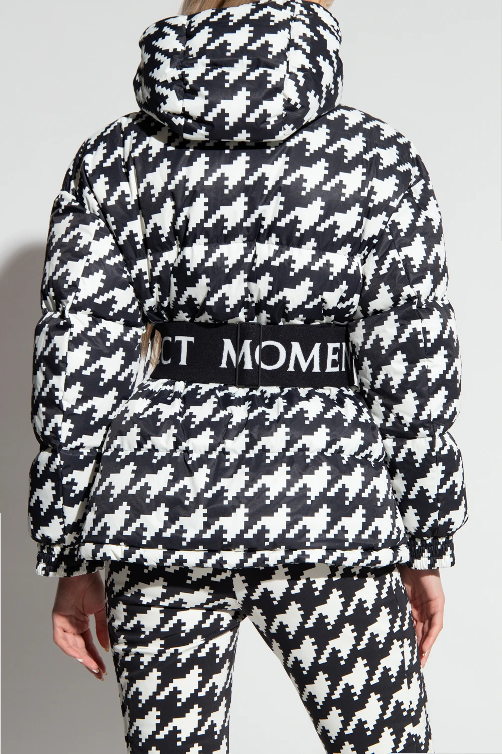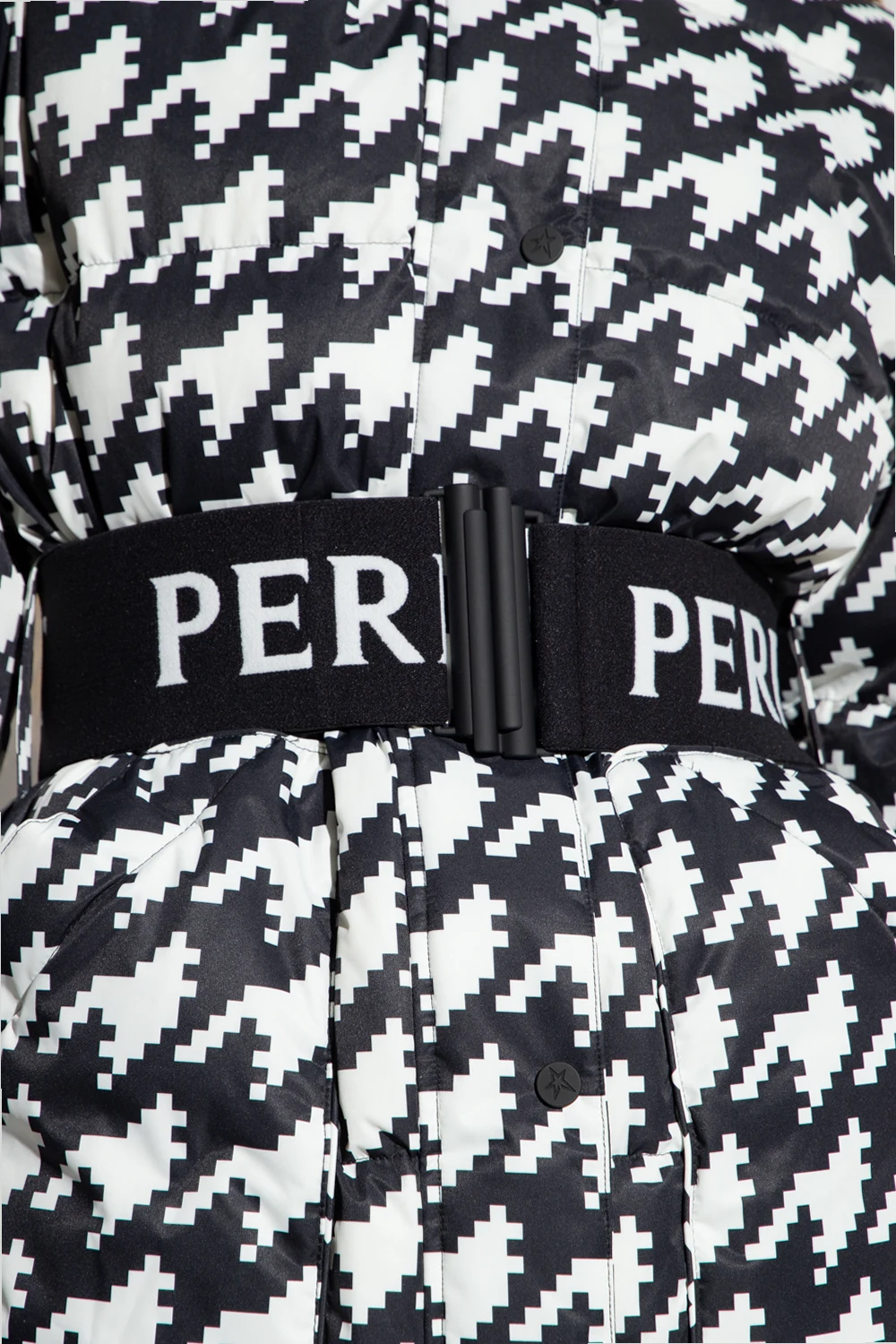 Biało-czarna parka typu ‘oversize’ Perfect Moment. Wykonana z wodoodpornego materiału. Wypełniona puchem pozyskiwanym w zrównoważony sposób. Zapinana na zamek i zatrzaski. Ozdobiona haftem z logo w kolorze czerwonym. W talii wiązana paskiem. Dwie kieszenie zapinane na zamek. Długie rękawy zakończone ściągaczem oraz regulowanym zapięciem na zatrzaski.